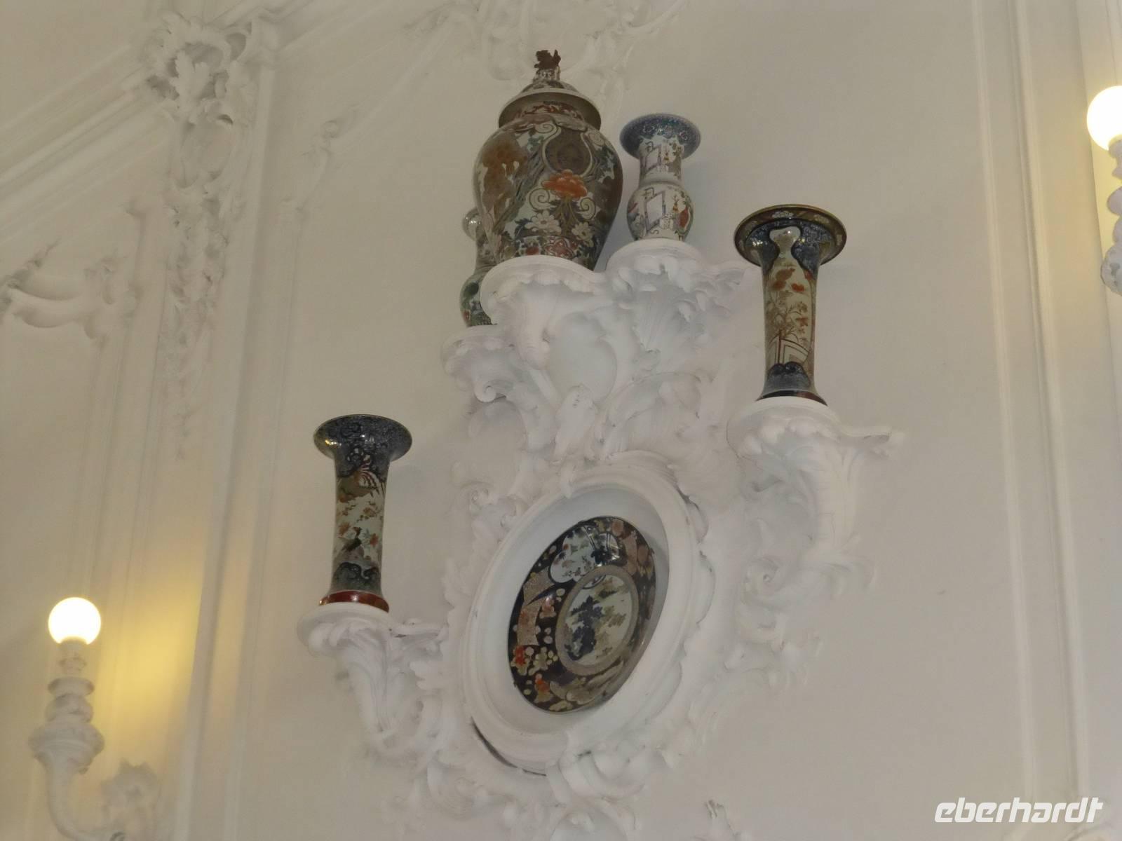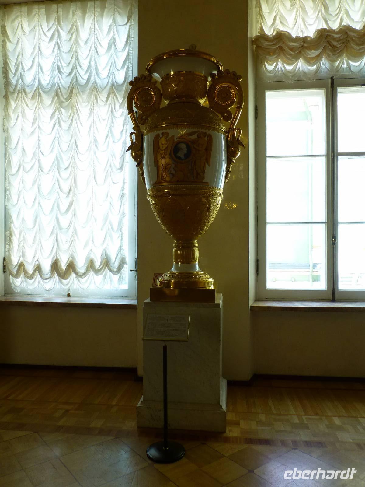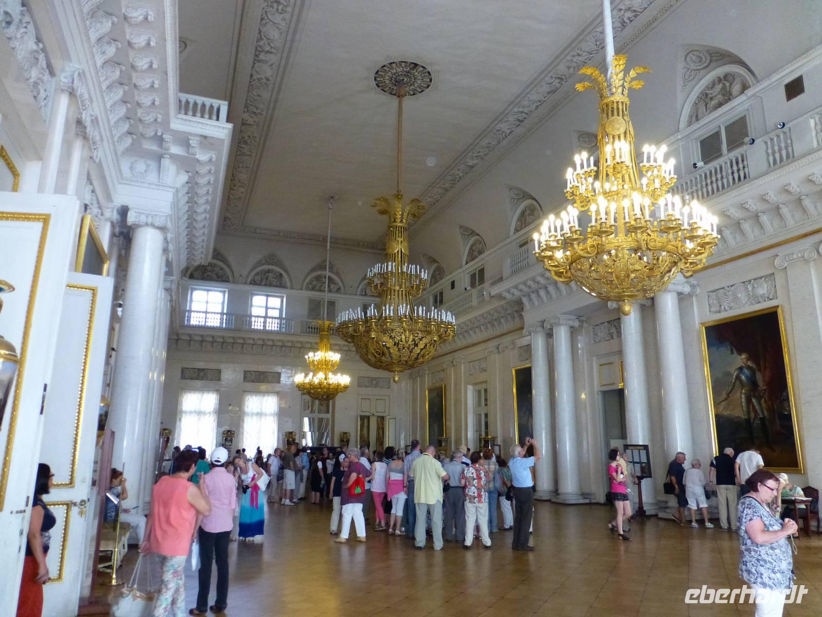 Das erste Objekt unserer Begierde war der große Palast des Peterhofs. Dort reihten wir uns in eine sehr lange Schlange ein und so hieß es erst einmal warten auf den Einlass. Auch im Inneren besserte sich das Bild nicht unbedingt, es waren definitiv mehr Menschen im Palast, als hineinpassten und so kämpften wir uns teilweise durch die vielen kleineren Zimmer des Palastes. Natalias rüstige Art kam uns hierbei sehr zugute, denn sie setzte sich gegen viele andere Gruppen dabei durch. Wir sahen einen schön eingerichteten Palast mit viel Porzellan - vorwiegend aus China und Meißen. Es war ein eindrucksvoller und sehr schöner Palast, wir waren dennoch auch ein wenig froh, als wir wieder ans Tageslicht hinaustraten und wieder genug Platz für uns hatten.