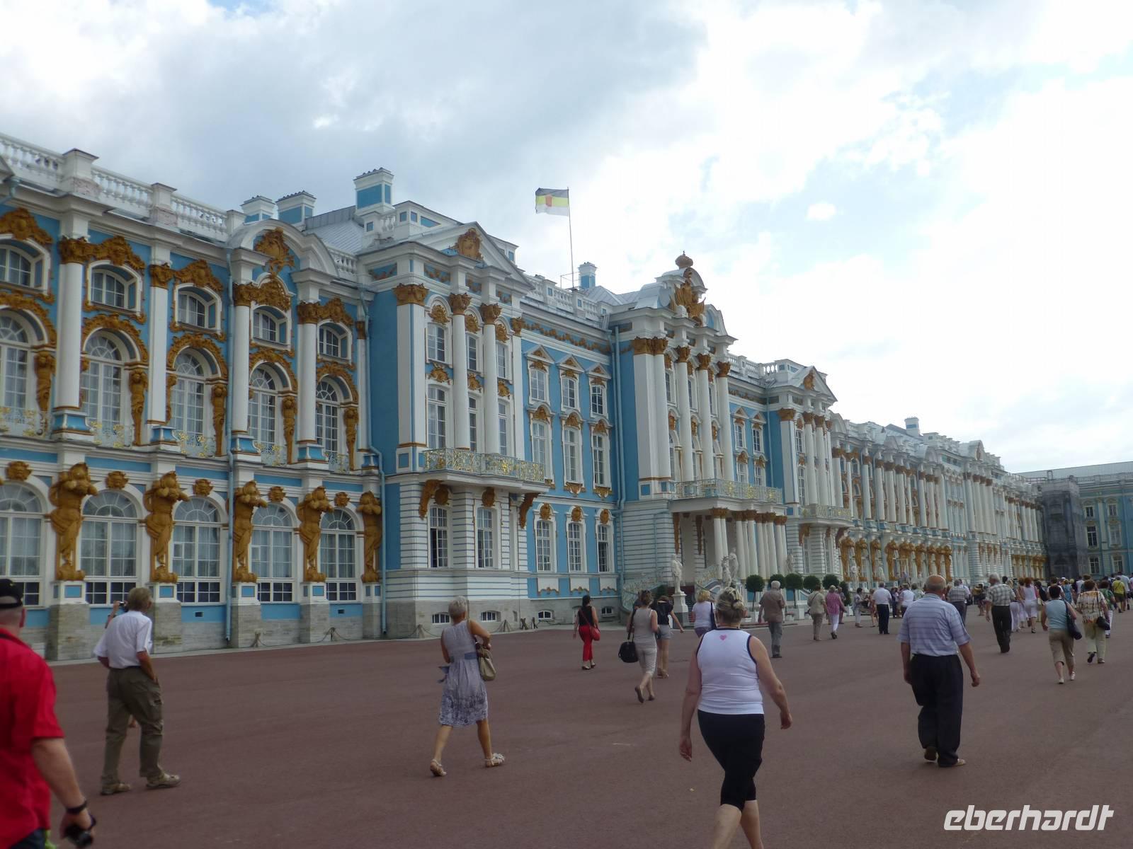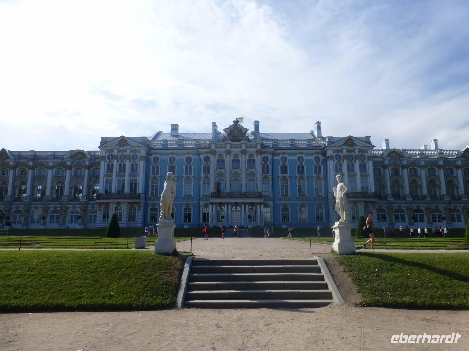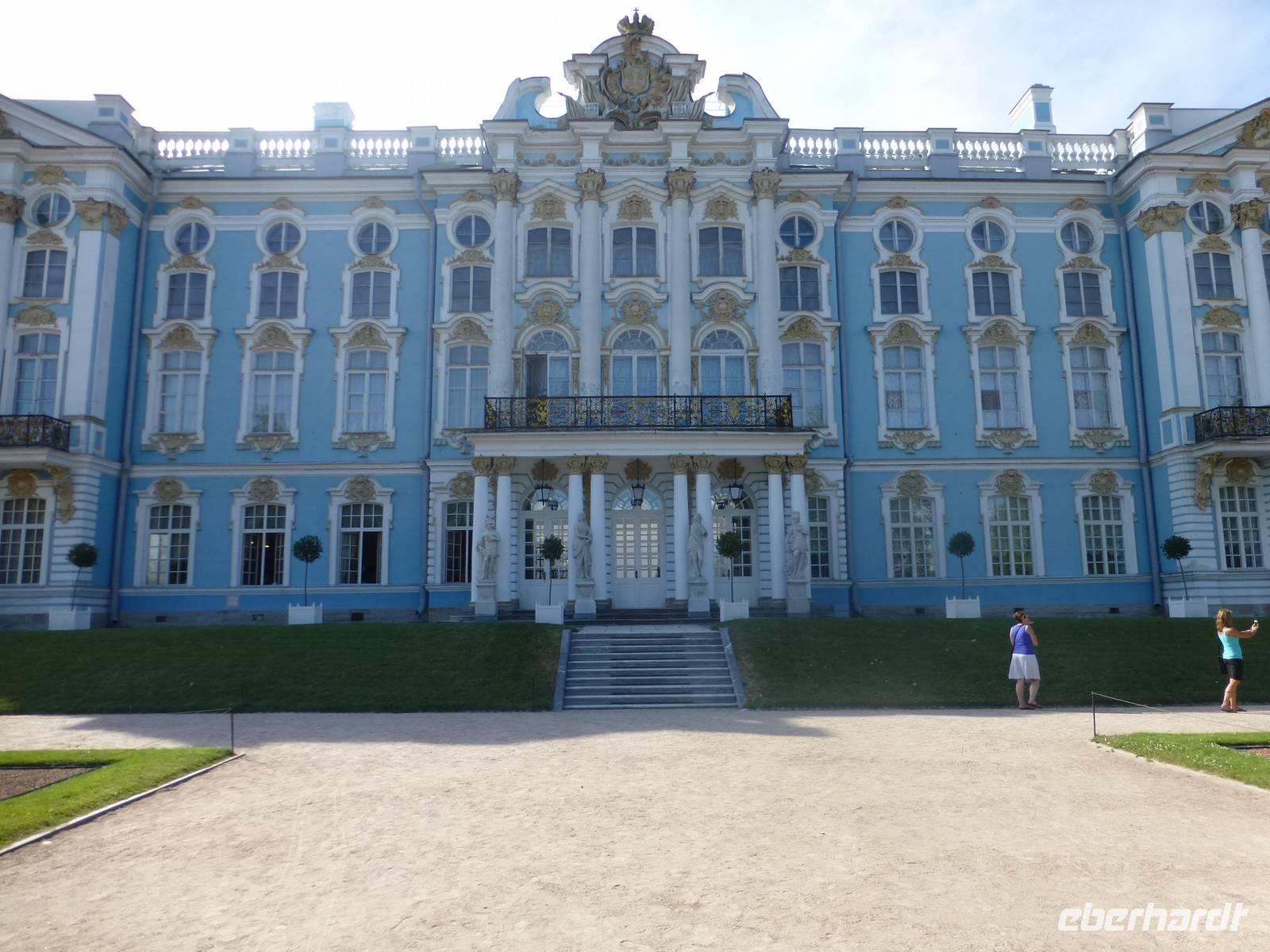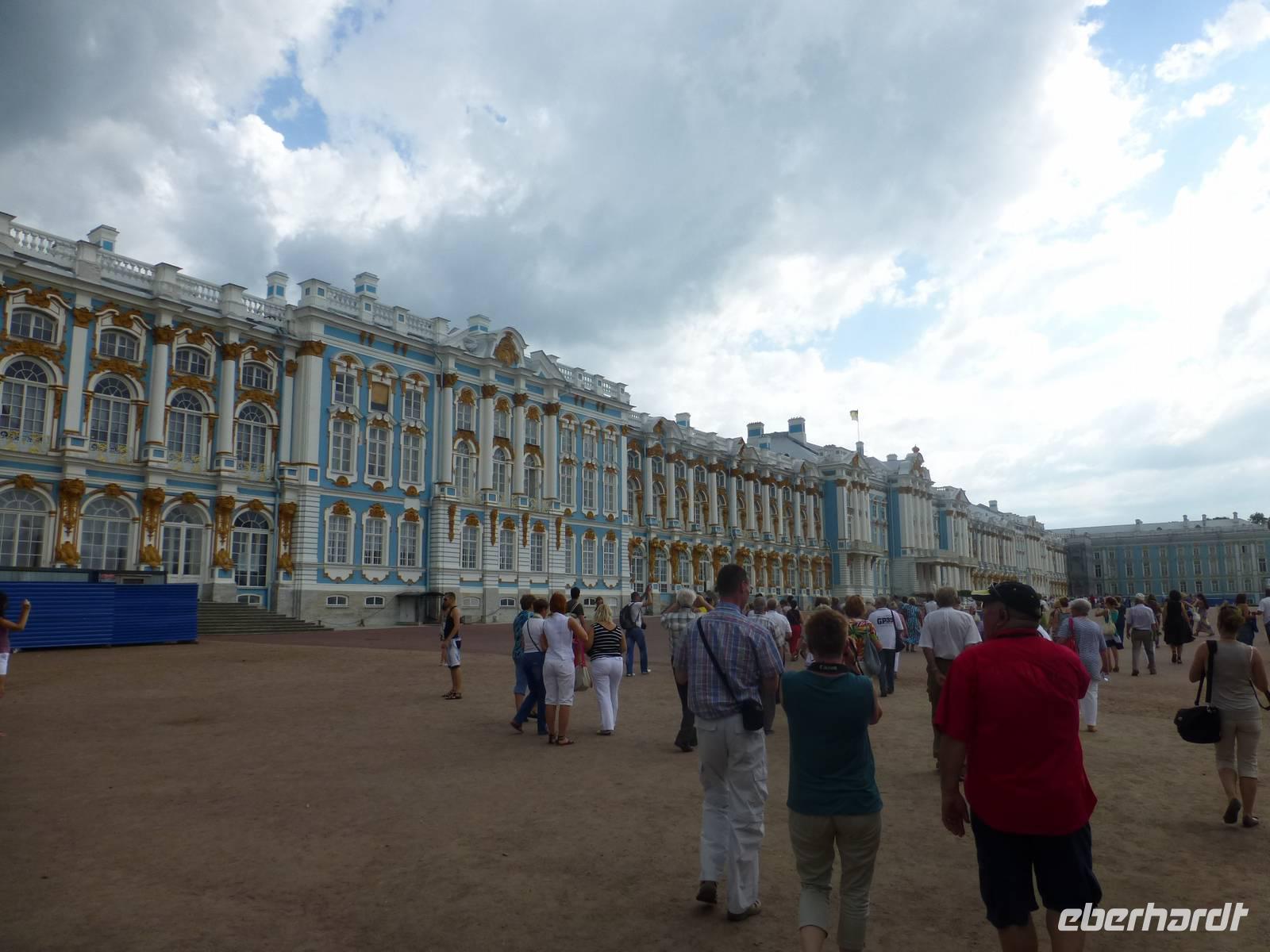 Doch auch nach der Blutskirche war unser Tag noch nicht vorbei. Wir wollten uns noch die einstige Somerresidenz der Zaren ansehen, das ehemalige Zarskoje Selo und heutige Puschkin. Und in diesem Ort ganz speziell den Katharinenpalast. Mittlerweile waren wir fast ein wenig gebeutelt von den stets heißen Temperaturen und waren fast ein wenig hoffnungsvoll, als einige Wolken aufzogen und ein Wind aufzog, der Regen ankündigte. Wir betraten jedoch erst einmal den Palast mit seiner blau-goldenen Fassade und erkundeten sein Innenleben.