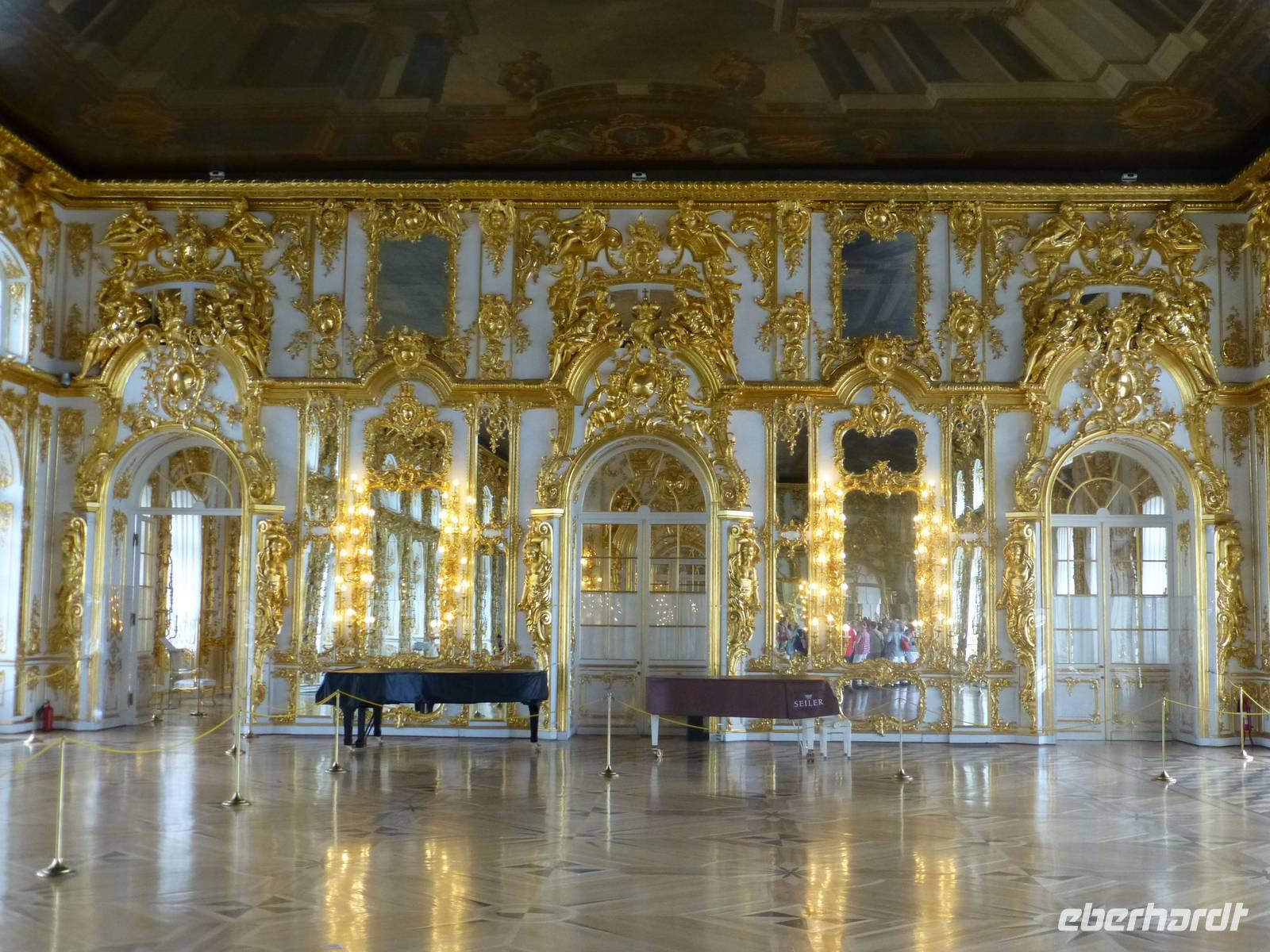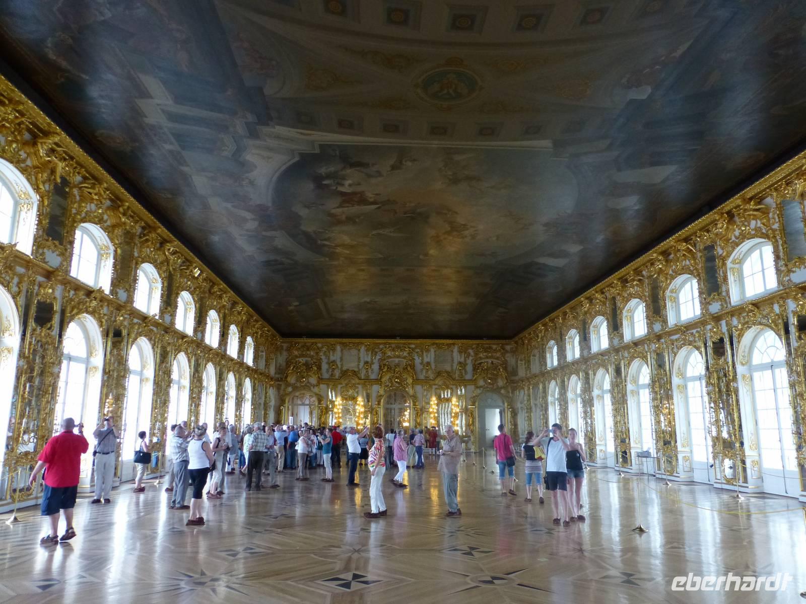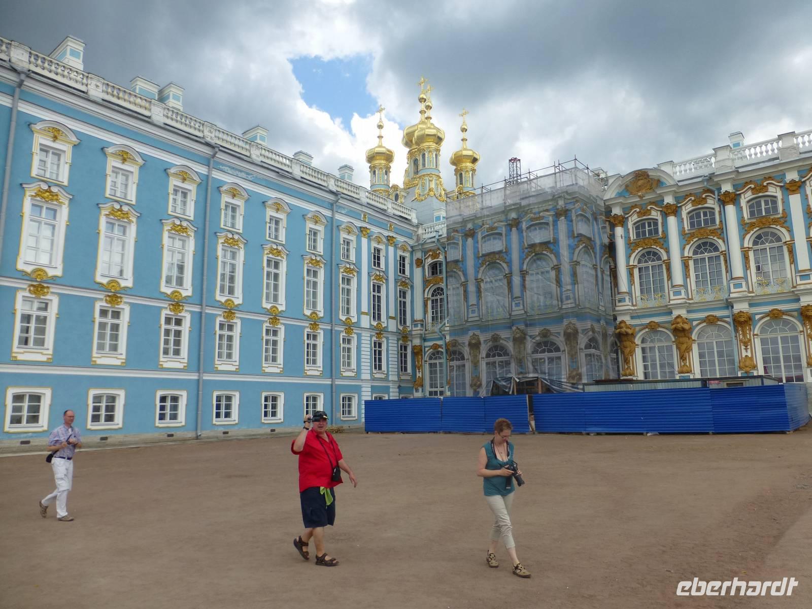 Doch auch nach der Blutskirche war unser Tag noch nicht vorbei. Wir wollten uns noch die einstige Somerresidenz der Zaren ansehen, das ehemalige Zarskoje Selo und heutige Puschkin. Und in diesem Ort ganz speziell den Katharinenpalast. Mittlerweile waren wir fast ein wenig gebeutelt von den stets heißen Temperaturen und waren fast ein wenig hoffnungsvoll, als einige Wolken aufzogen und ein Wind aufzog, der Regen ankündigte. Wir betraten jedoch erst einmal den Palast mit seiner blau-goldenen Fassade und erkundeten sein Innenleben.