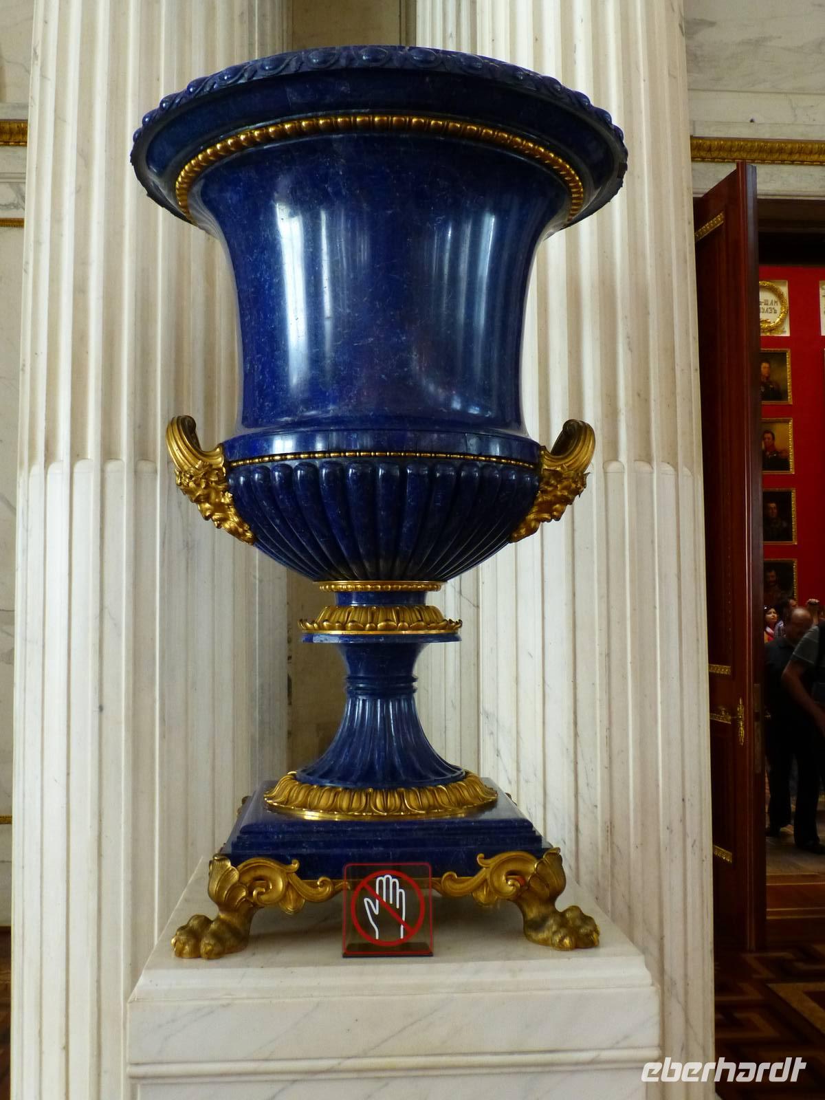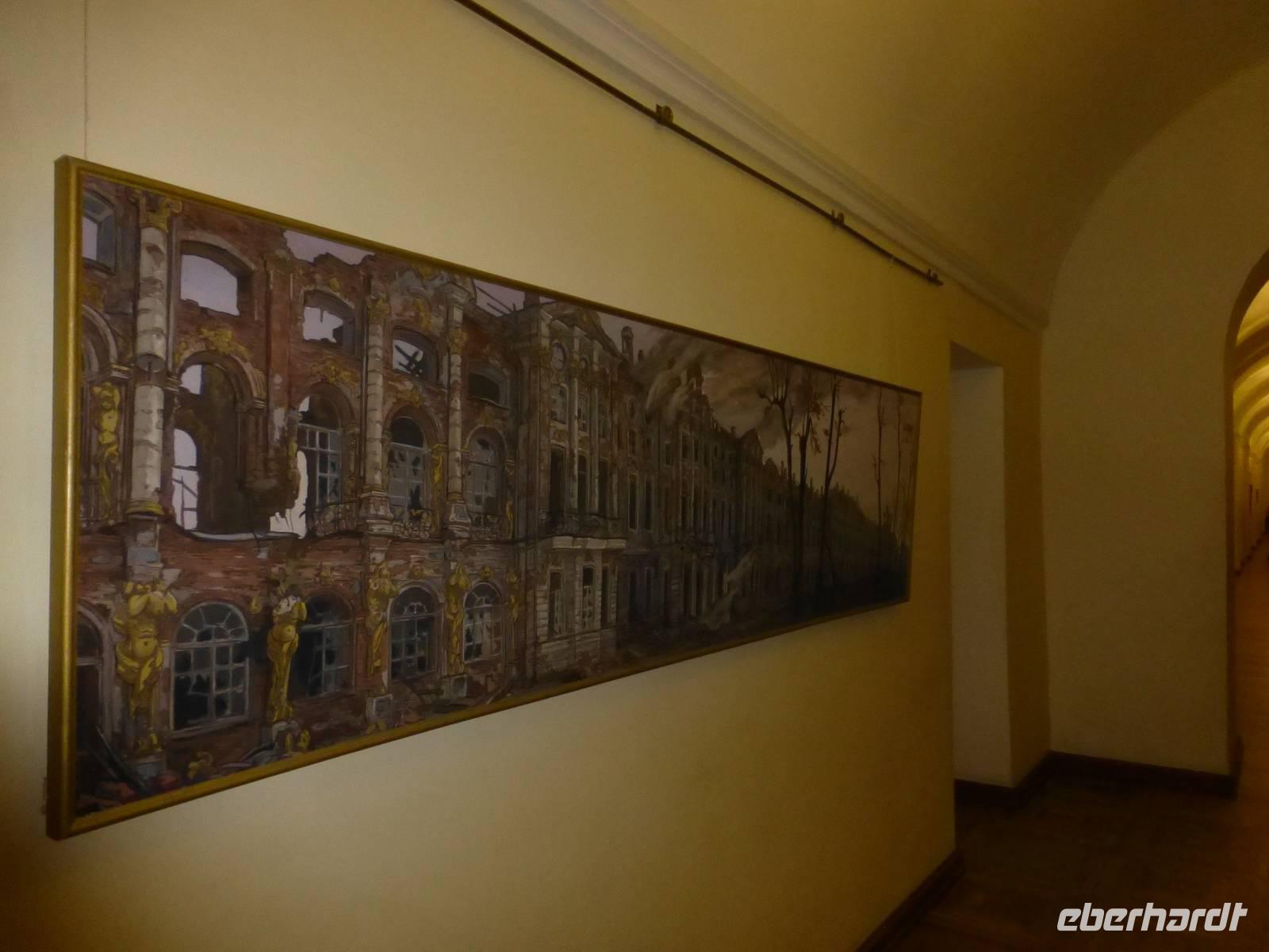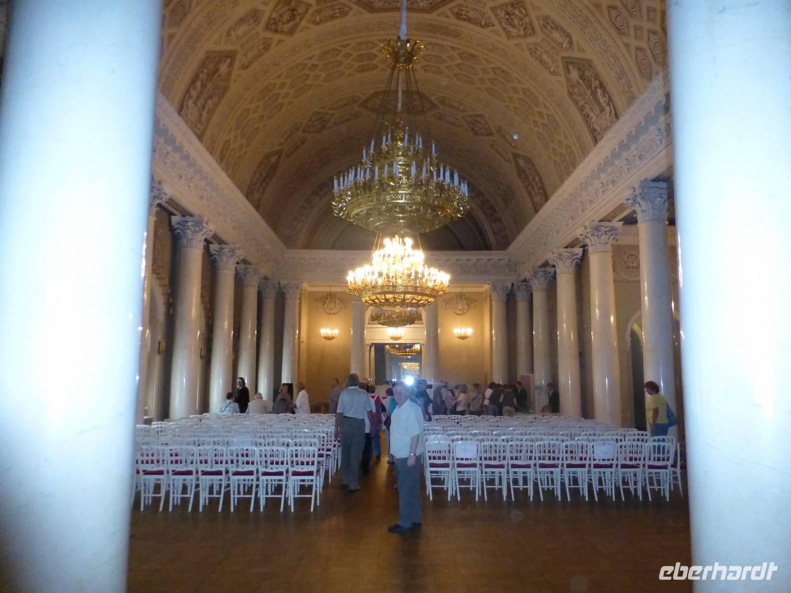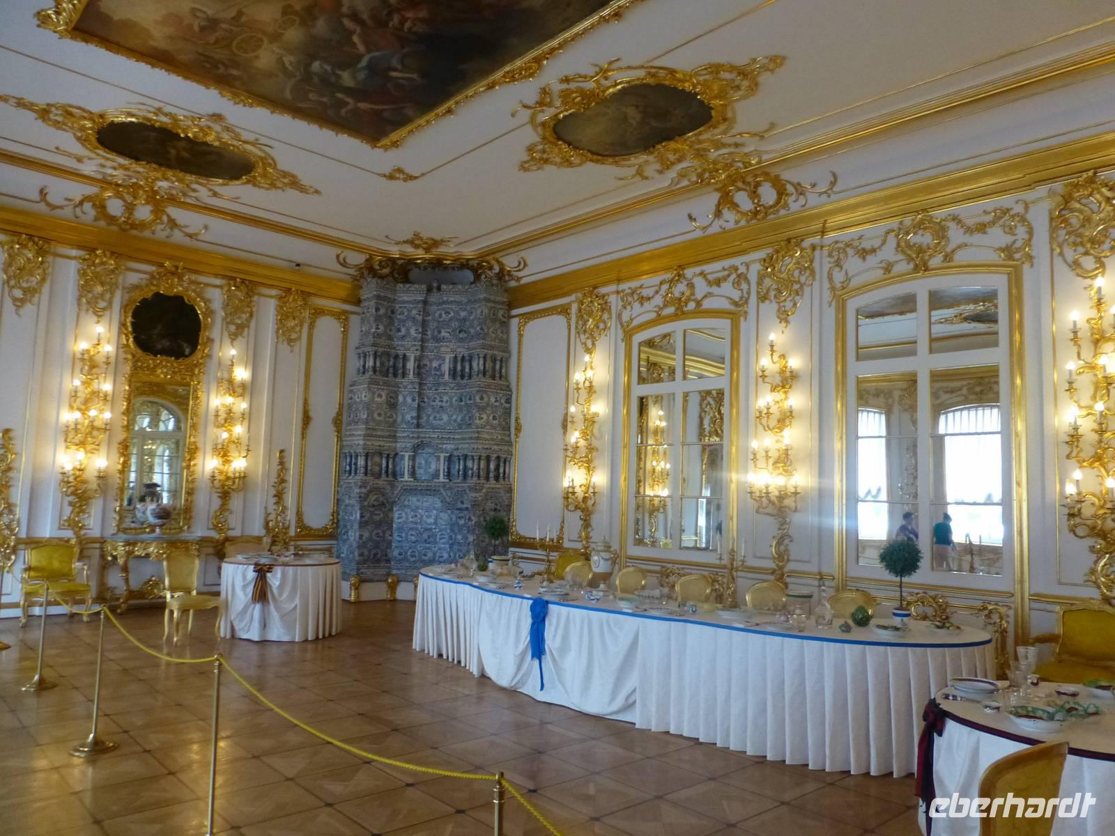 Doch auch nach der Blutskirche war unser Tag noch nicht vorbei. Wir wollten uns noch die einstige Somerresidenz der Zaren ansehen, das ehemalige Zarskoje Selo und heutige Puschkin. Und in diesem Ort ganz speziell den Katharinenpalast. Mittlerweile waren wir fast ein wenig gebeutelt von den stets heißen Temperaturen und waren fast ein wenig hoffnungsvoll, als einige Wolken aufzogen und ein Wind aufzog, der Regen ankündigte. Wir betraten jedoch erst einmal den Palast mit seiner blau-goldenen Fassade und erkundeten sein Innenleben.
