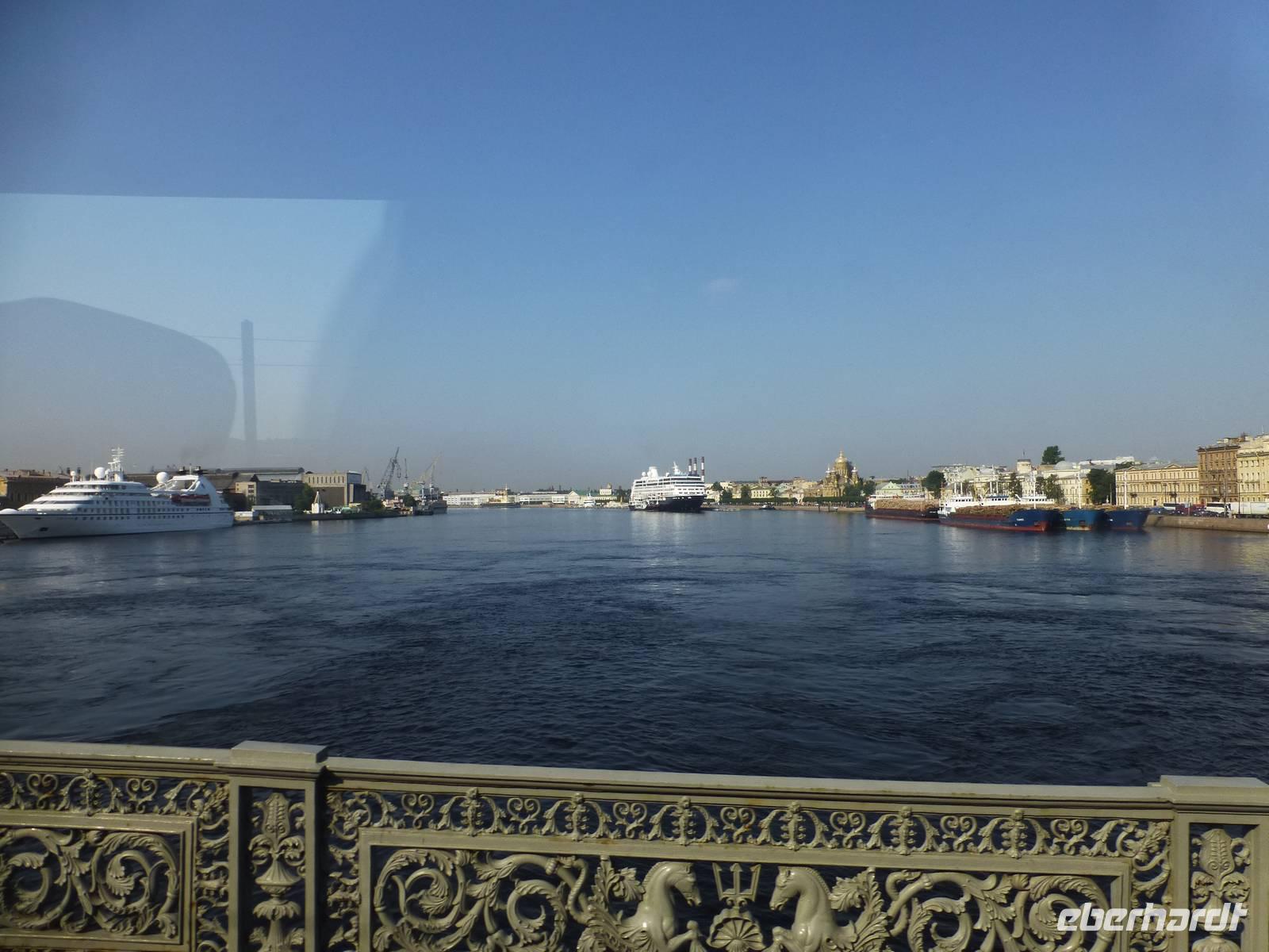 Weiter ging unsere Fahrt zur Leutnant-Schmidt-Brücke. Am Fuße der dortigen steinernen Sphinxen hatten wir gemeinsam mit vielen Menschen einen sehr guten Ausblick auf die Brücke und beobachteten die Öffnung der Brücke. Die Schiffe warteten schon ungeduldig darauf, endlich die Newa herauf fahren zu können.