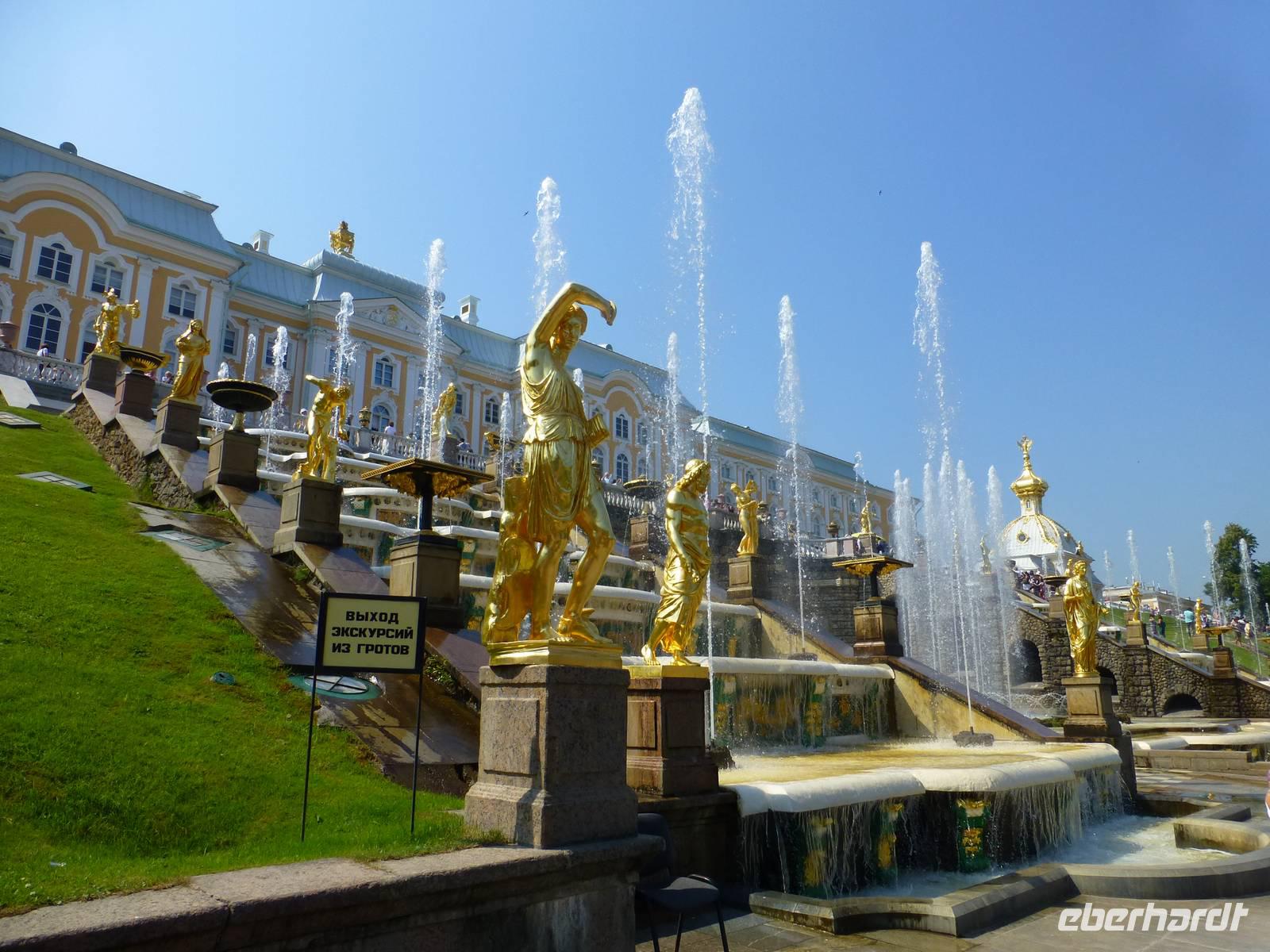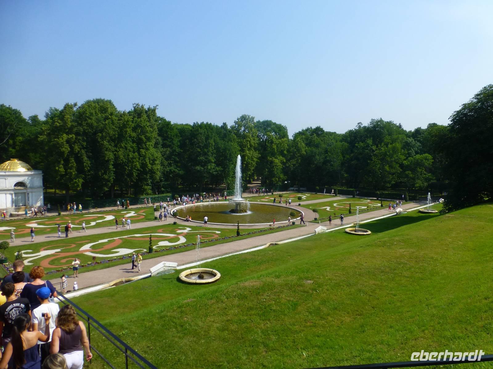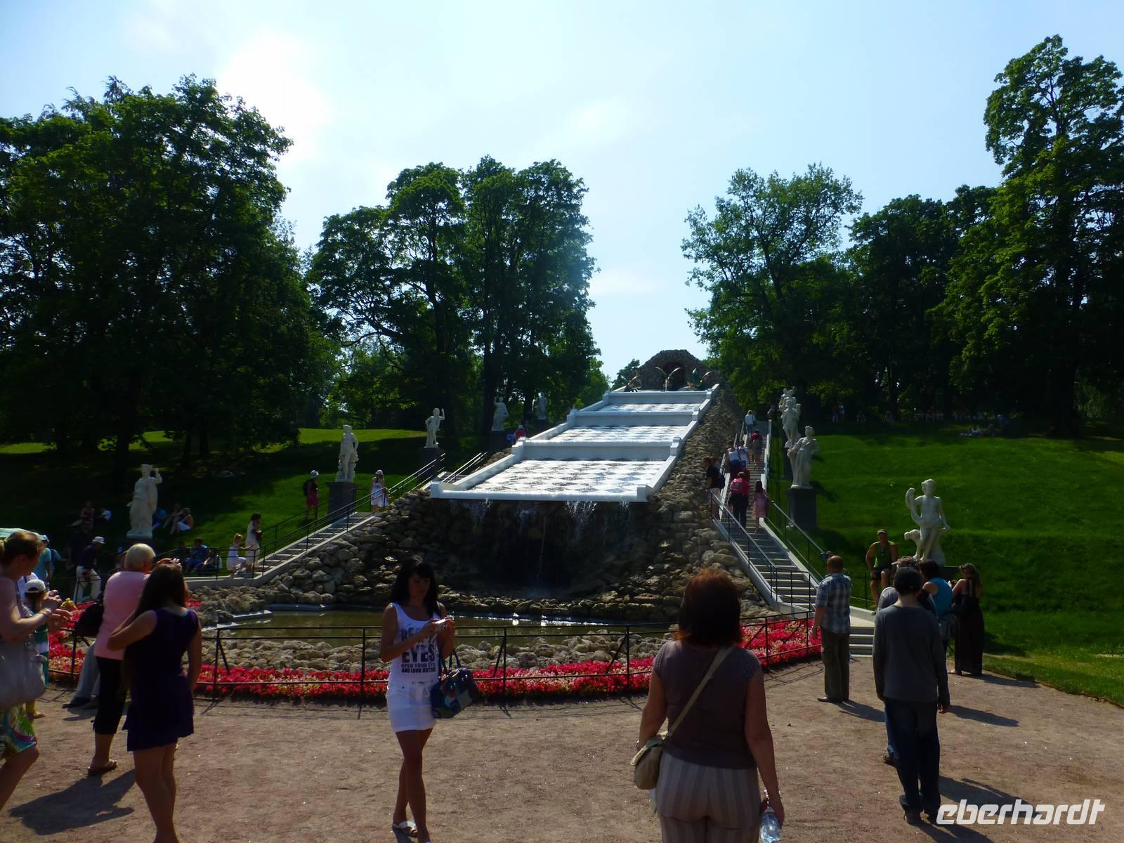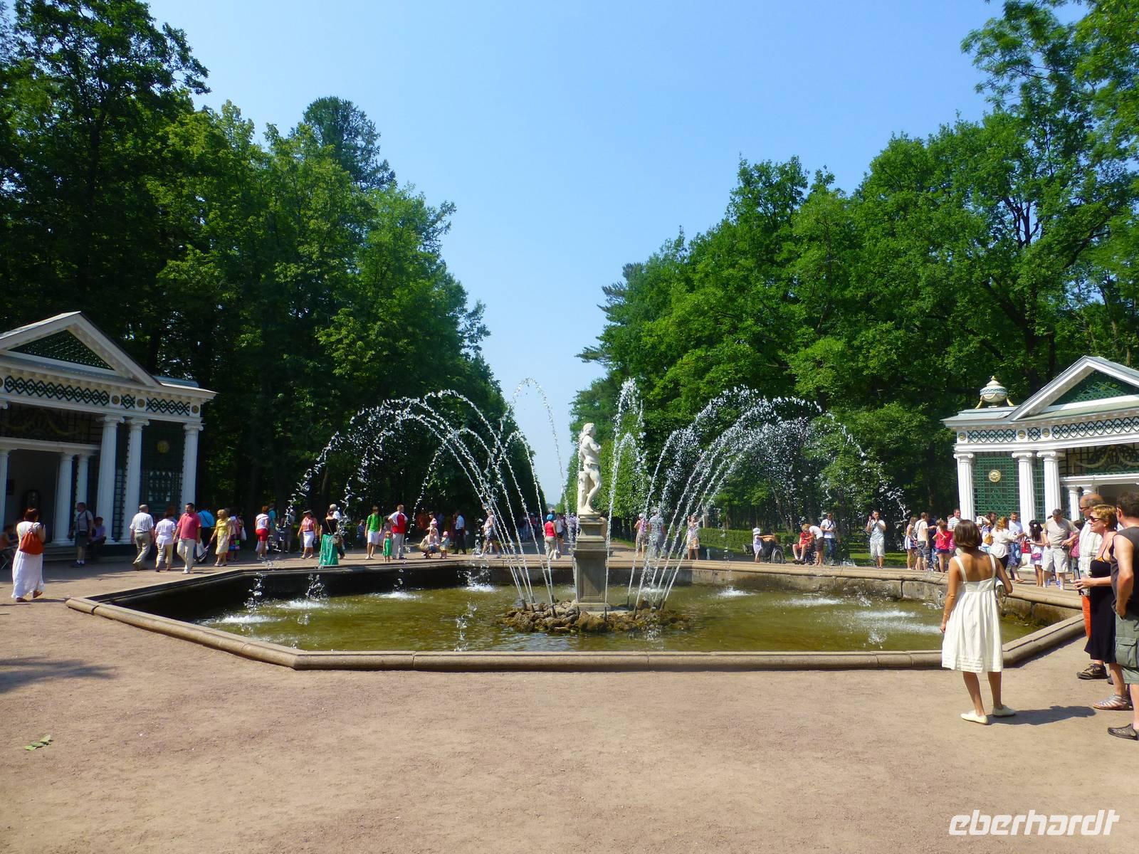 Denn nun ging es durch die großzügigen Parkanlagen von Peterhof, und dort gab es nicht nur jede Menge zu sehen, sondern auch viel Bewegungsfreiheit. So schlenderten wir zunächst zur Orangerie und legten dort eine kleine Mittagspause ein. Bei Temperaturen von mittlerweile 35°C war ein Getränk oder ein Eis auch wirklich das Beste, was man machen konnte.
