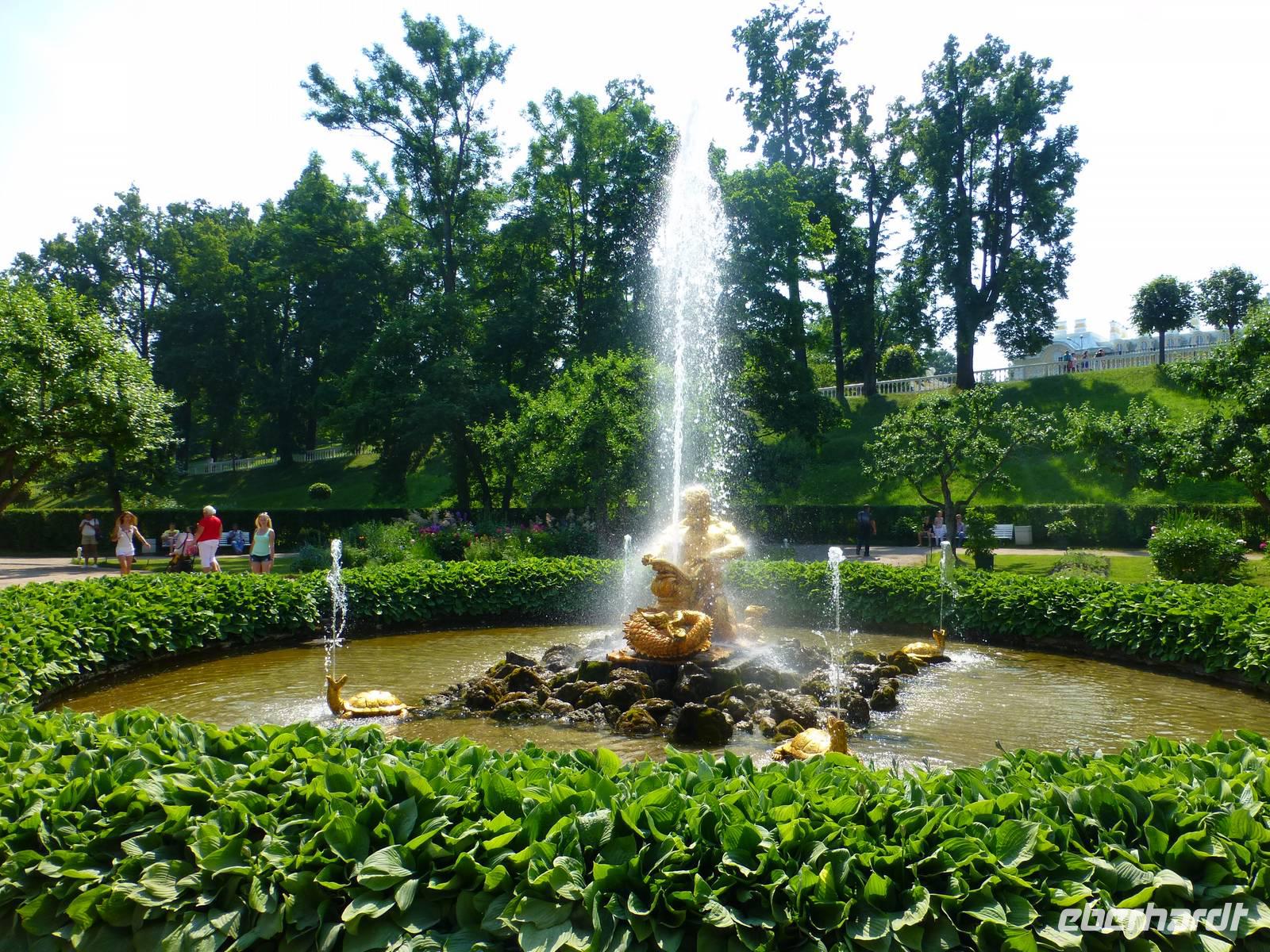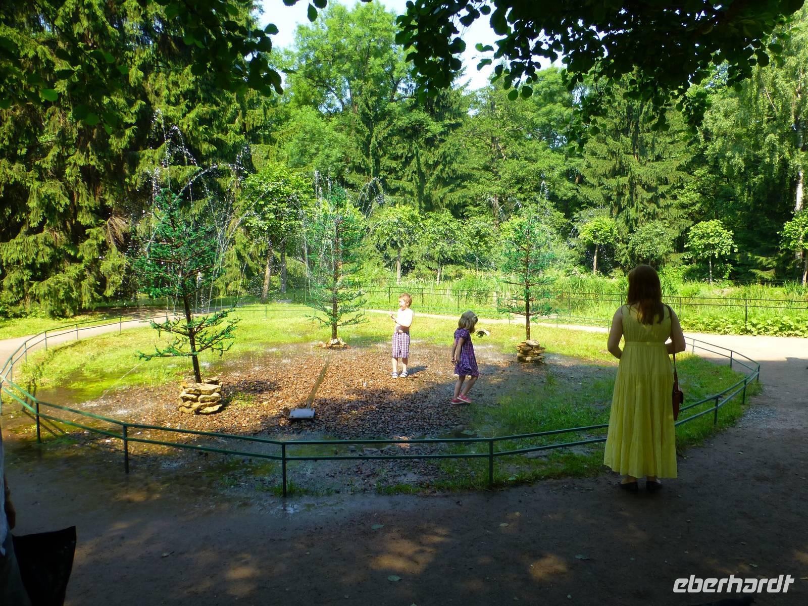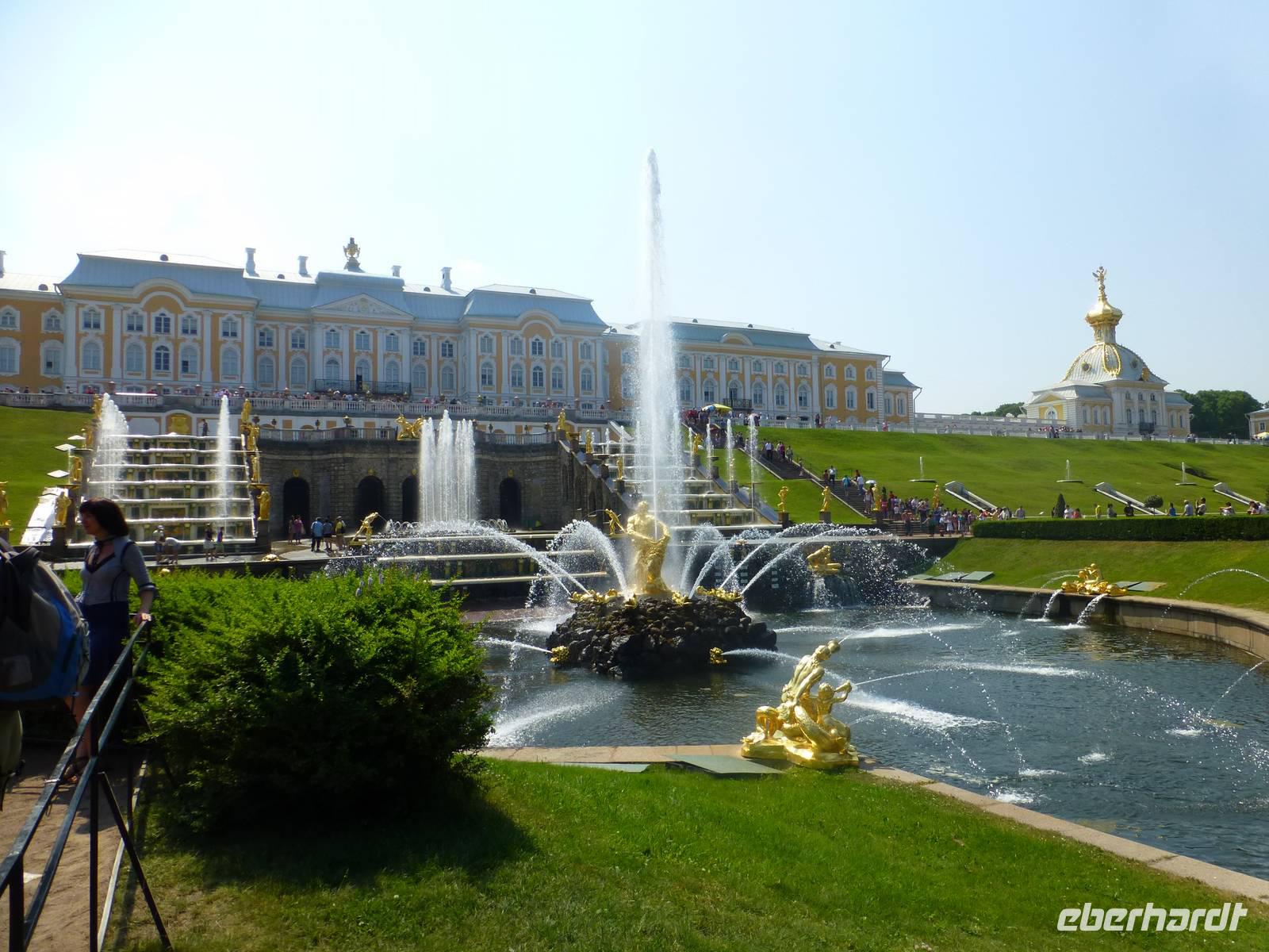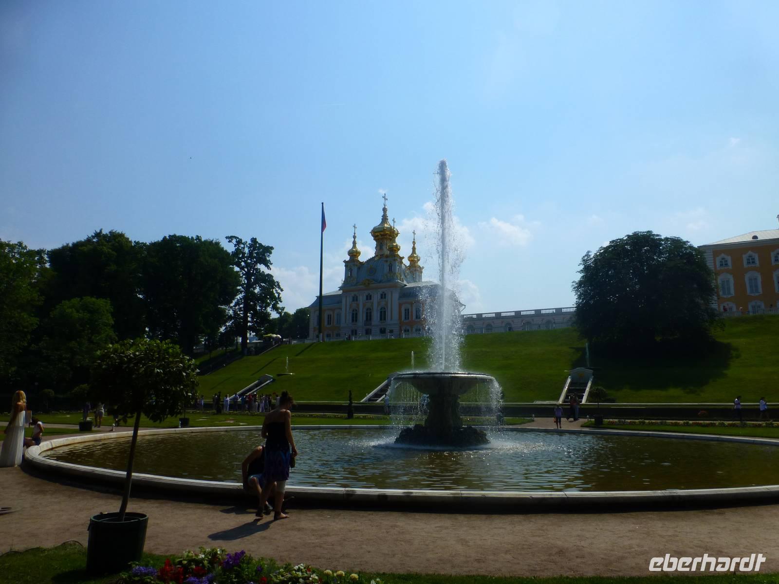 Nach der Pause schlenderten wir weiter zum kleinen Palast Monplaisir, dem Palast, in dem Peter der Große wesentlich lieber war, als im großen Palast. Hier sollen auch legendäre Trinkgelage und Feste stattgefunden haben. Auf dem Weg dorthin erfreuten wir uns an sorgsam gepflegten Parkanlagen und beobachteten Leute, die in den vielen kleinen Wasserspielen des Parks auf Erfrischung hofften.