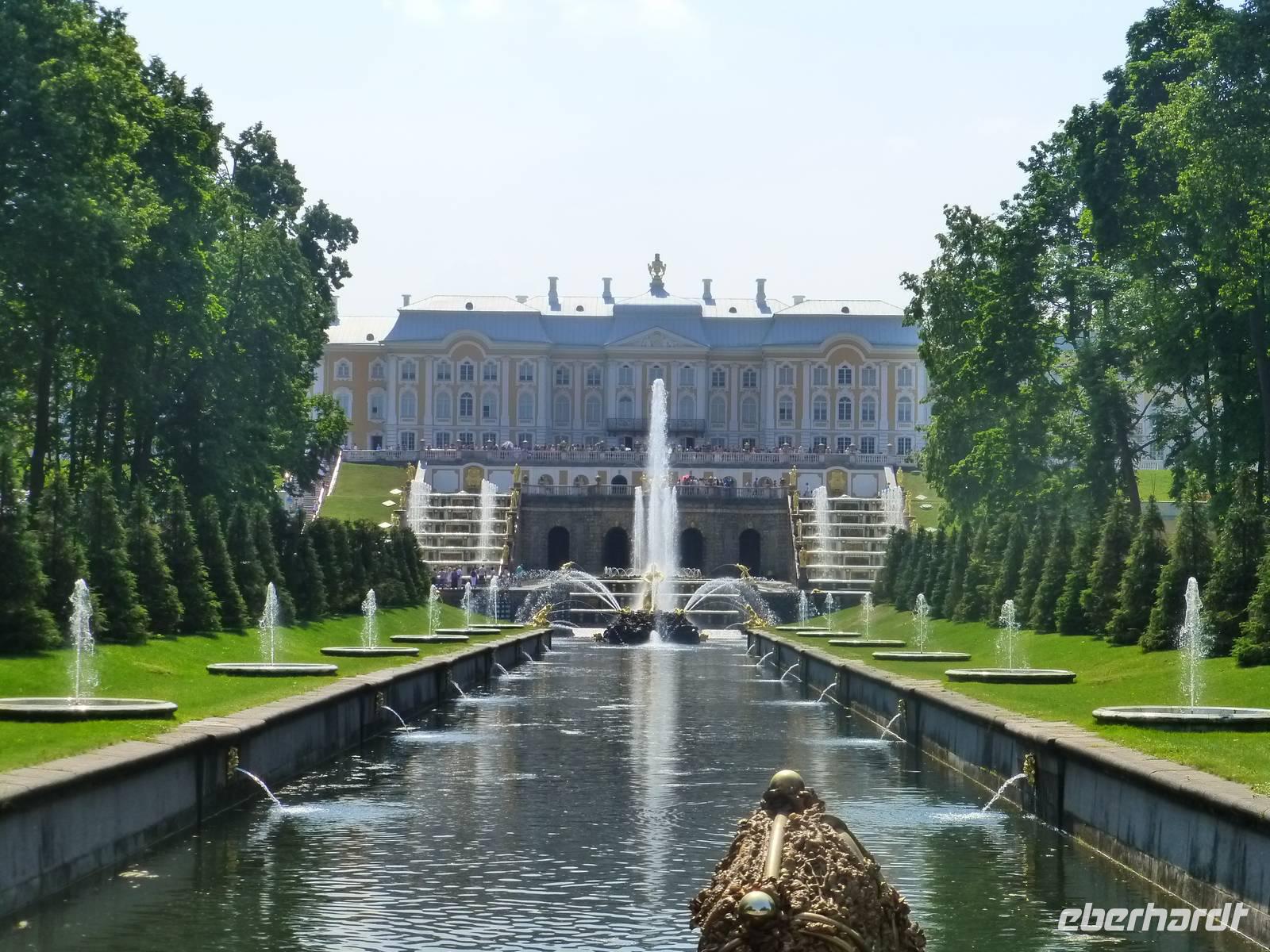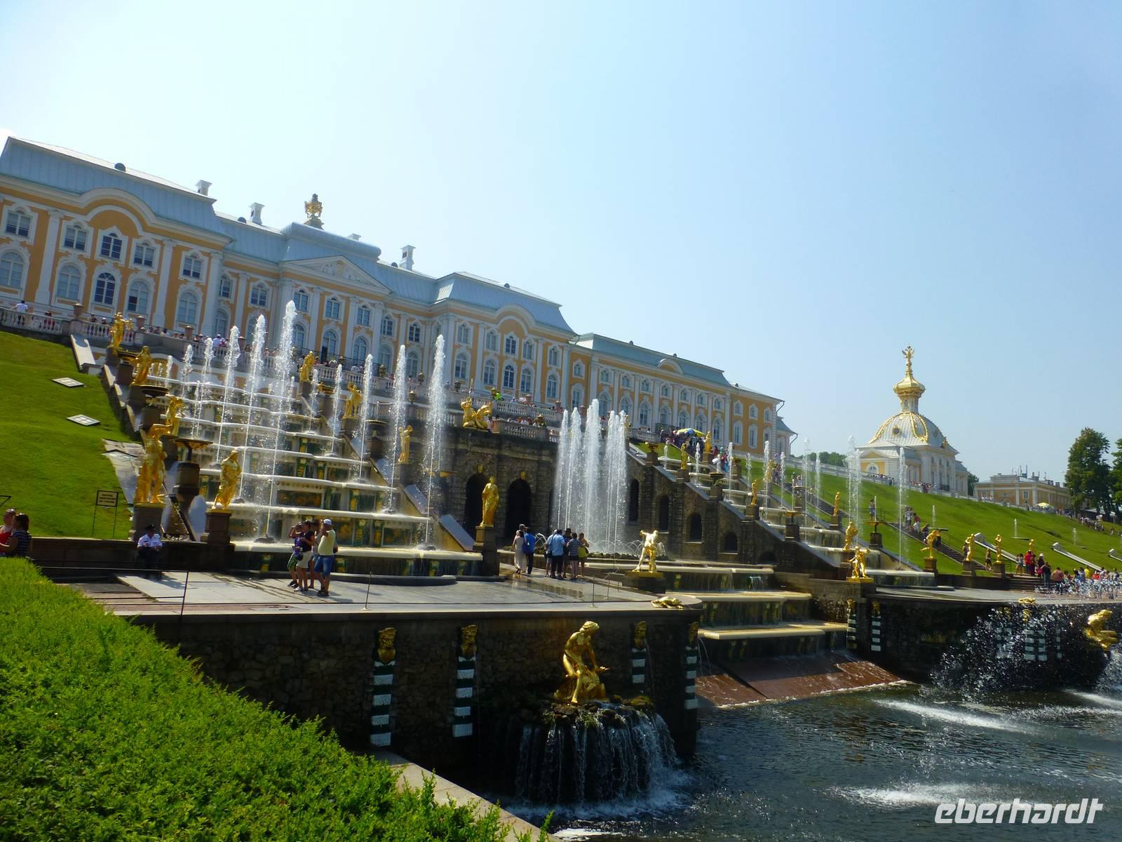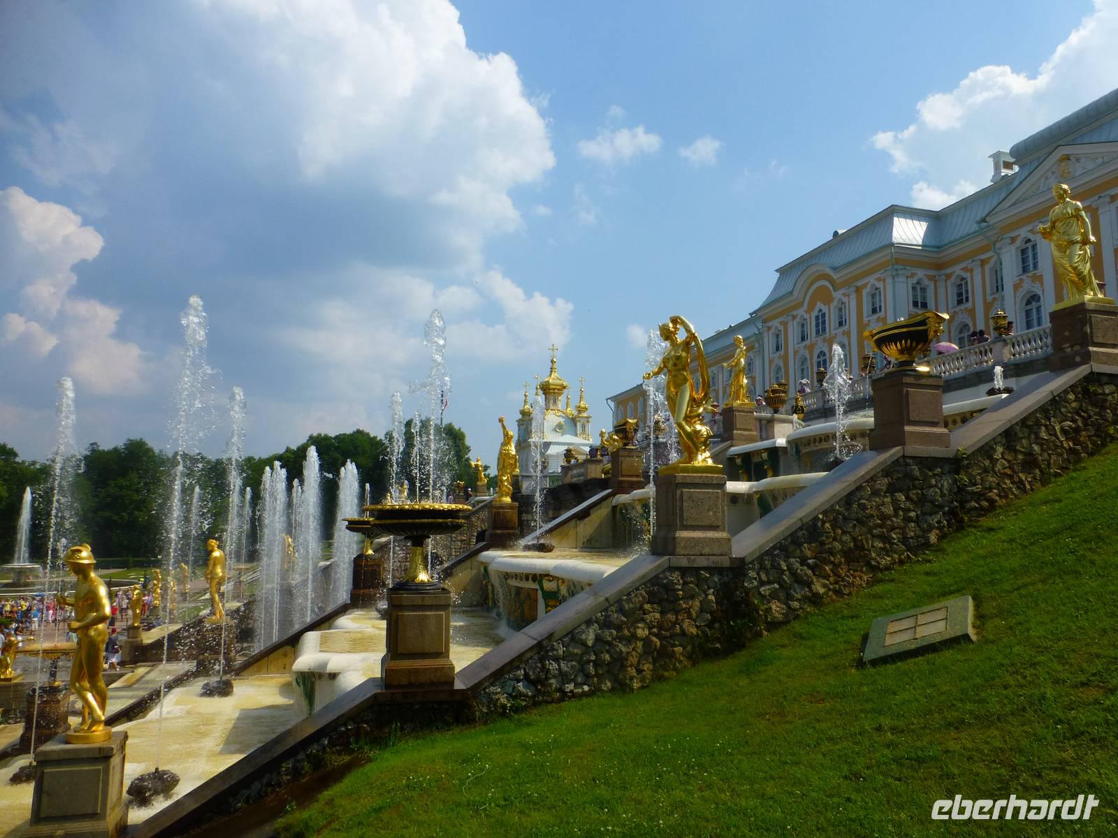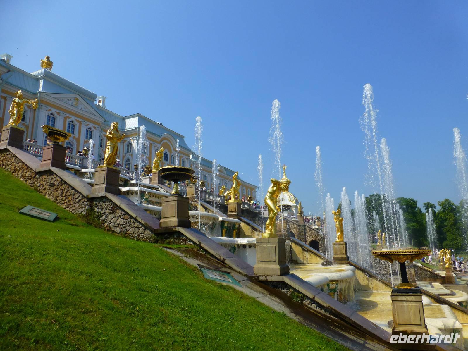 Nach der Pause schlenderten wir weiter zum kleinen Palast Monplaisir, dem Palast, in dem Peter der Große wesentlich lieber war, als im großen Palast. Hier sollen auch legendäre Trinkgelage und Feste stattgefunden haben. Auf dem Weg dorthin erfreuten wir uns an sorgsam gepflegten Parkanlagen und beobachteten Leute, die in den vielen kleinen Wasserspielen des Parks auf Erfrischung hofften.