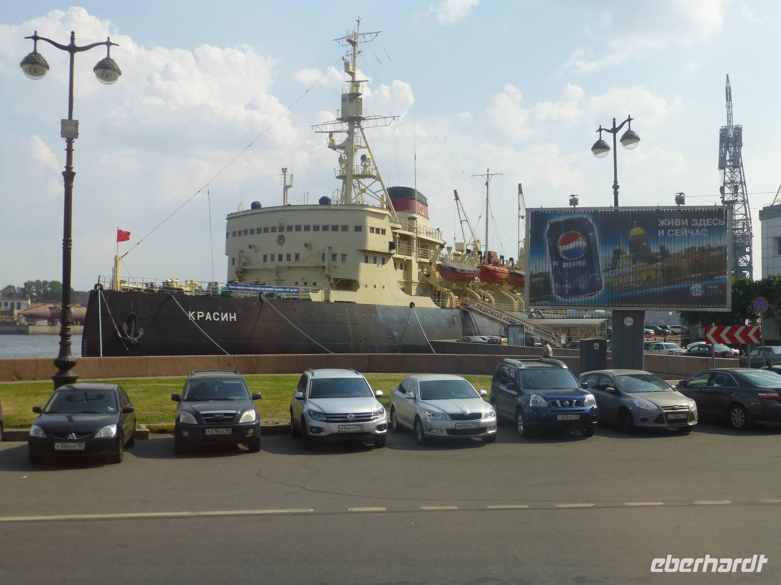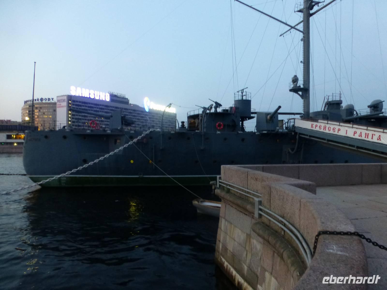Wadim fuhr uns im jetzt etwas ruhigeren Verkehr zunächst zum Panzerkreuzer Aurora, dem Schiff, das während der Oktoberrevolution eine so überragende Rolle gespielt hatte, gab es doch das Zeichen zum Sturm des Winterpalastes. Dort konnten wir einige Fotos schießen und uns dabei die Zeit vertreiben, bis die Sonne endgültig untergegangen war. Und natürlich hatte auch der Reisebegleiter nicht sein Zuspätkommen bei der Heimfahrt vergessen, und so versüßten wir uns die Wartezeit zusätzlich mit echtem russischen Premium-Wodka, russischem Himbeerlikör und russischem Konfekt - eine gute Einleitung des Abends.