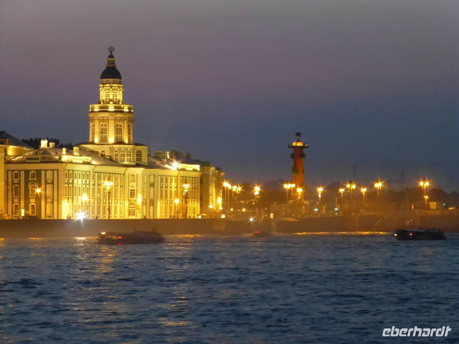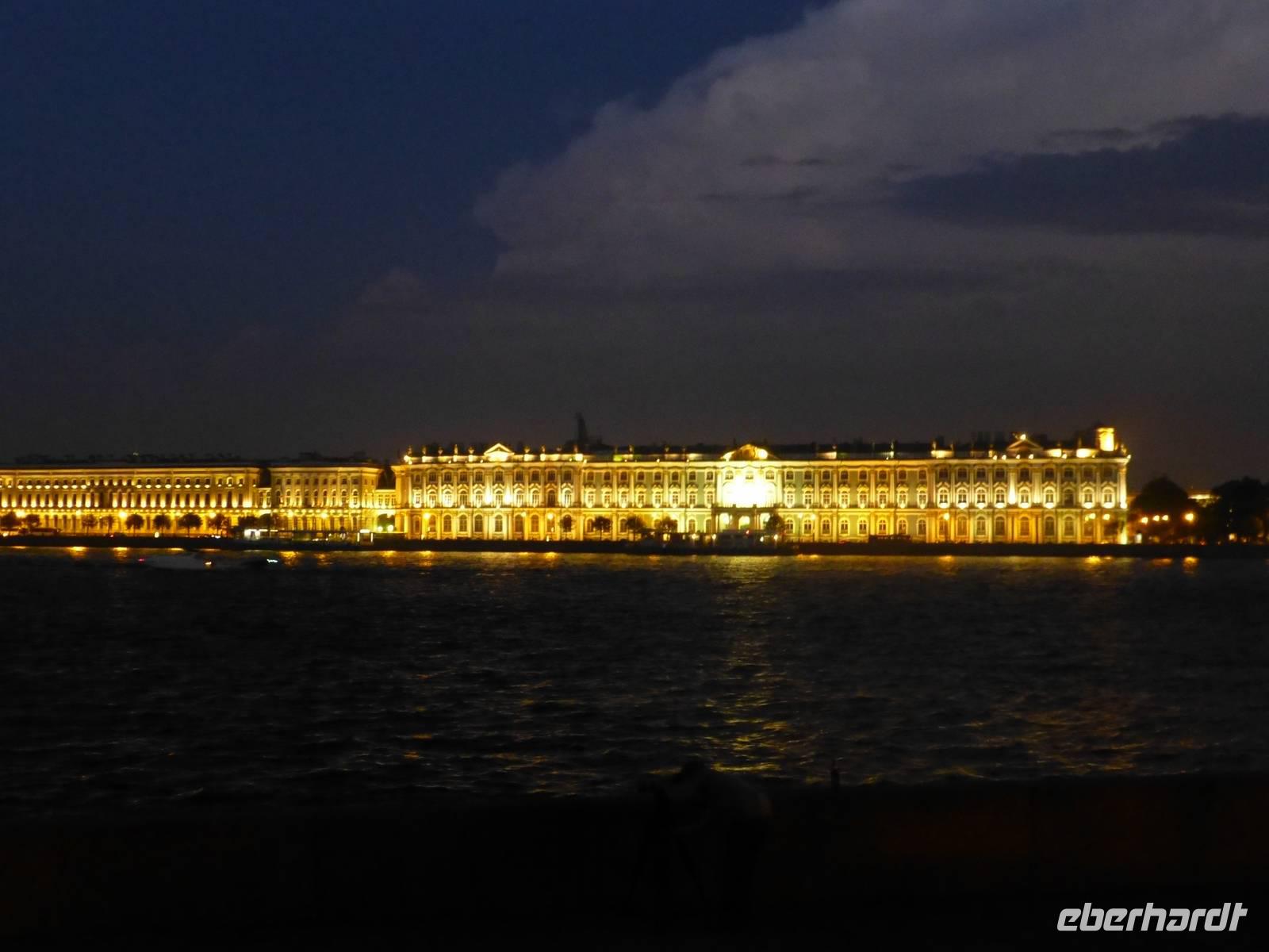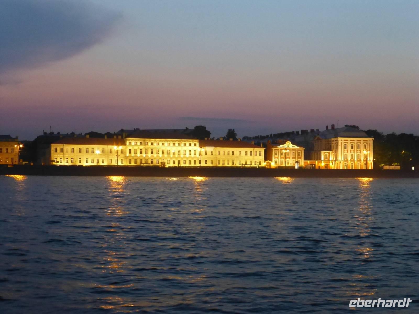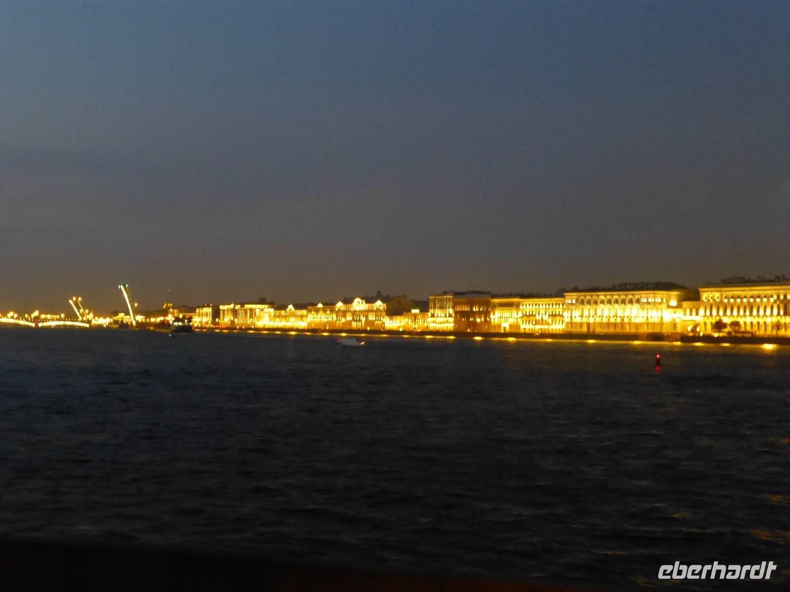 Allmählich wurde es dunkel und wir machten uns mit dem Bus auf zum Dekabristenplatz, vorbei an der komplett beleuchteten Uferpromenade, der erleuchteten Eremitage. Am Dekabristenplatz konnten wir den ehernen Reiter und vor allem den Senat und Synode in voller Pracht bestaunen. Und natürlich auch das gegenüberliegende Ufer der Wassiljewski-Insel mit den beleuchteten Rostra-Säulen.