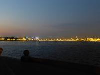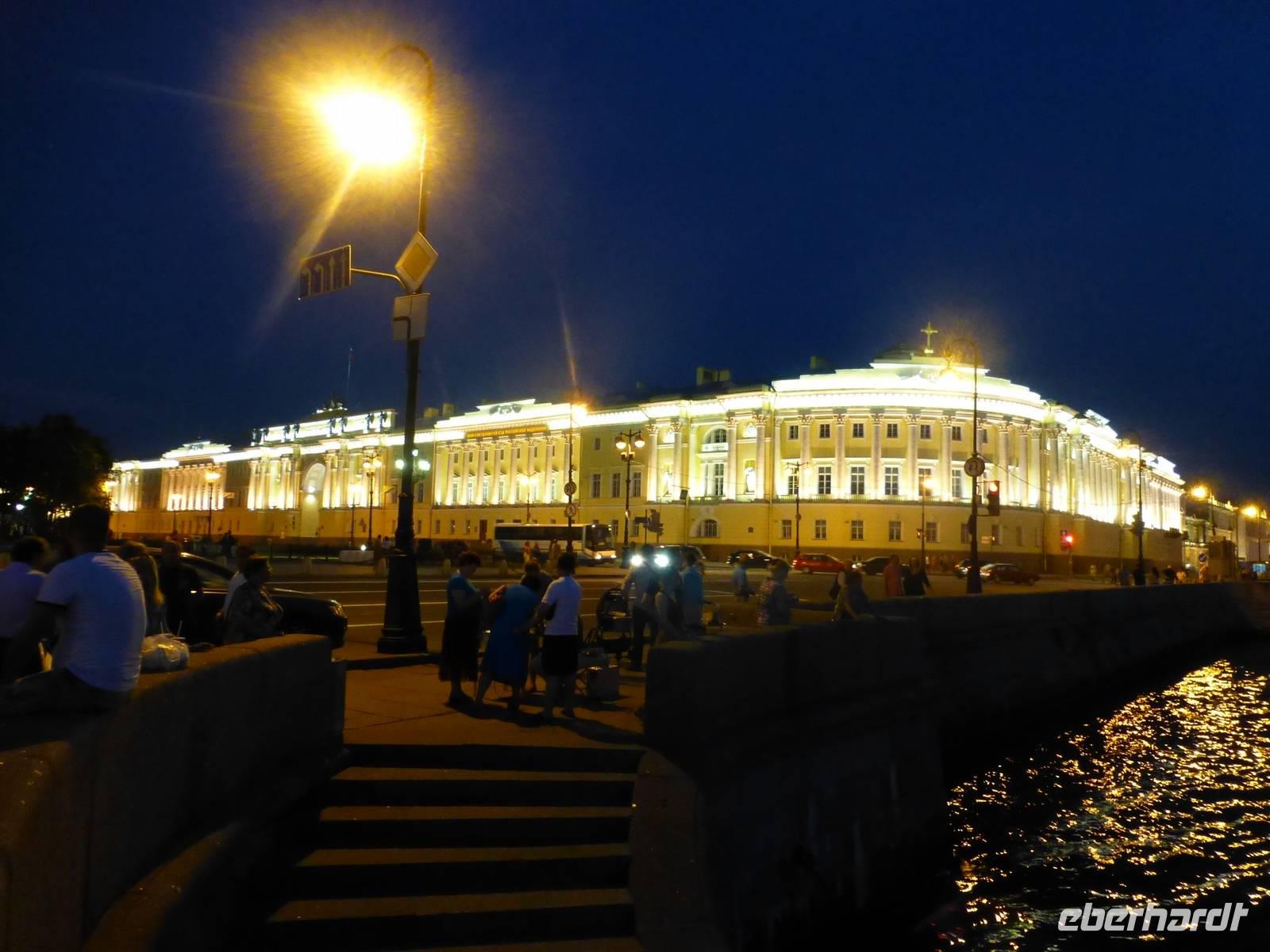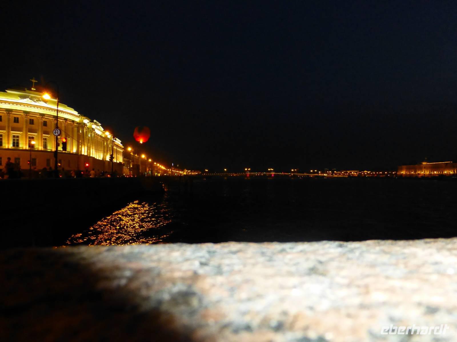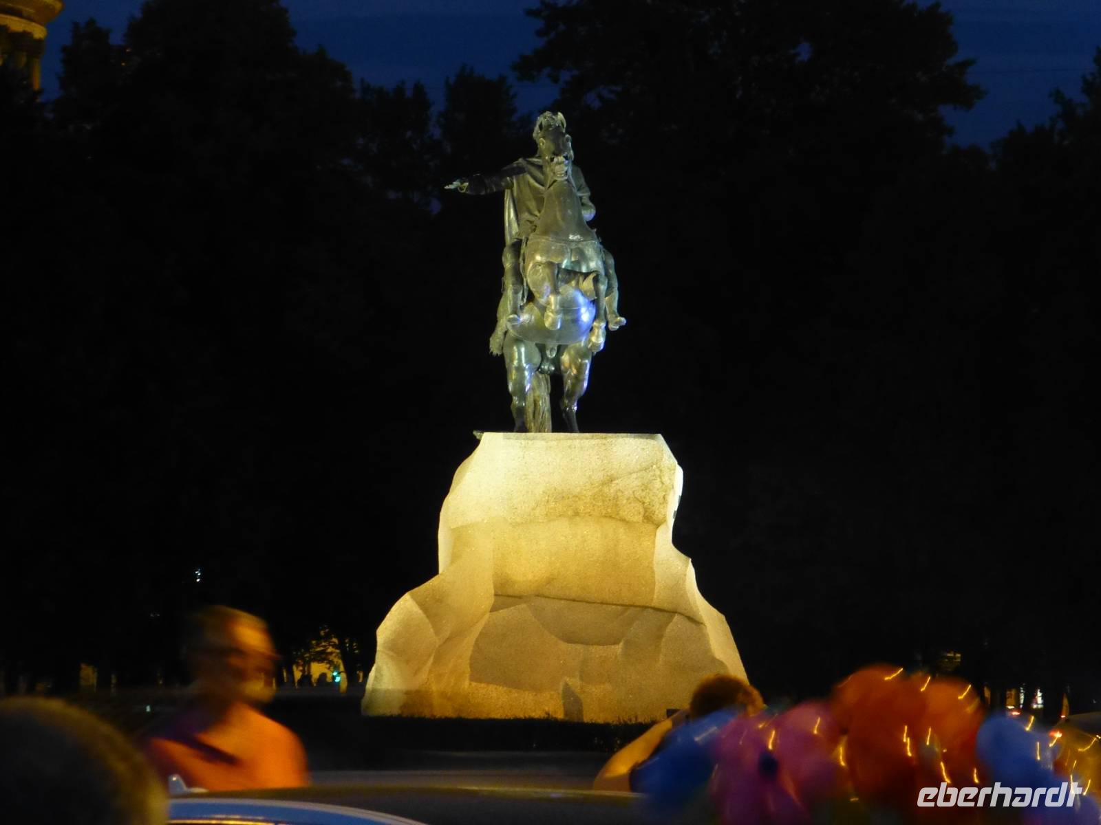 Allmählich wurde es dunkel und wir machten uns mit dem Bus auf zum Dekabristenplatz, vorbei an der komplett beleuchteten Uferpromenade, der erleuchteten Eremitage. Am Dekabristenplatz konnten wir den ehernen Reiter und vor allem den Senat und Synode in voller Pracht bestaunen. Und natürlich auch das gegenüberliegende Ufer der Wassiljewski-Insel mit den beleuchteten Rostra-Säulen.