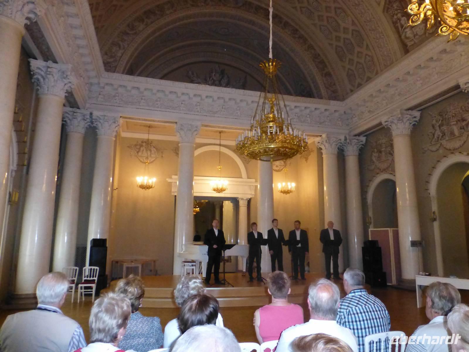 Es gab viele verschiedene kleine Portionen russischen Essens, darunter Borschtsch, Krautrouladen und eingelegtes Gemüse. Und dazu, wie könnte es anders sein, Wodka, Wein und Wasser, soviel man mochte. Ob beim Mitsingen, Mitklatschen oder einfach nur lauschen, wir hatten viel Spaß mit der Folkloretruppe des Podvorie und feierten unseren letzten Abend in Russland gebührend.