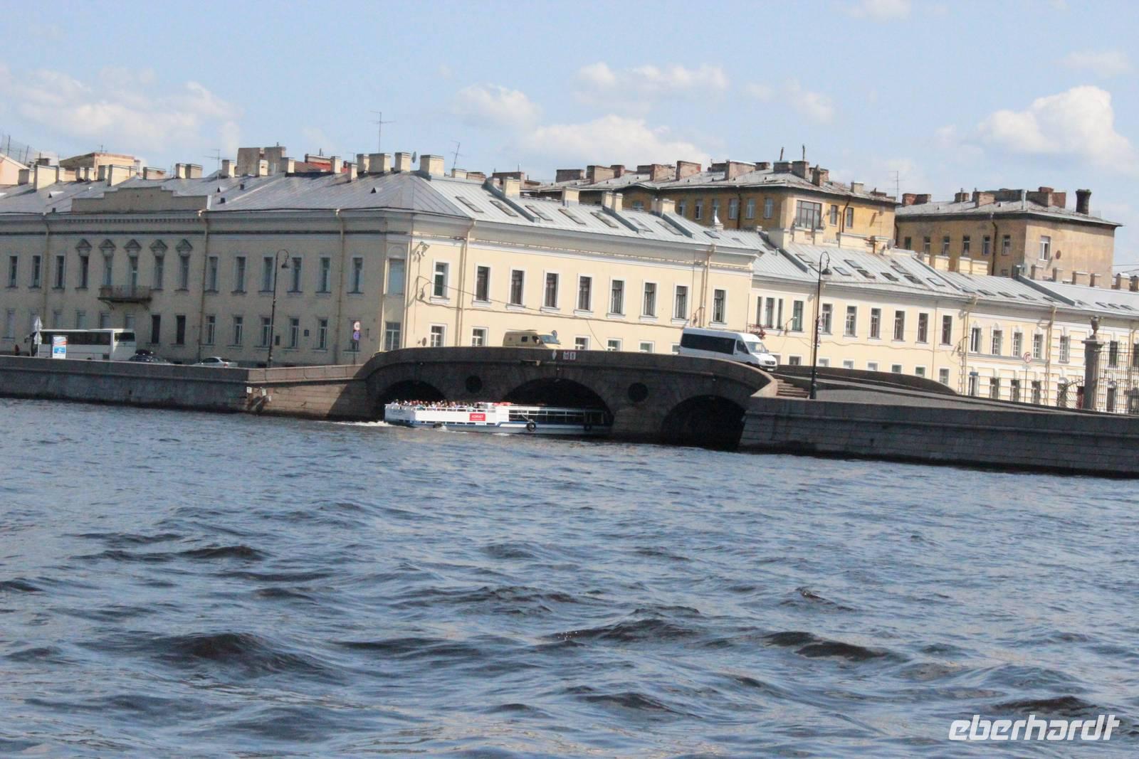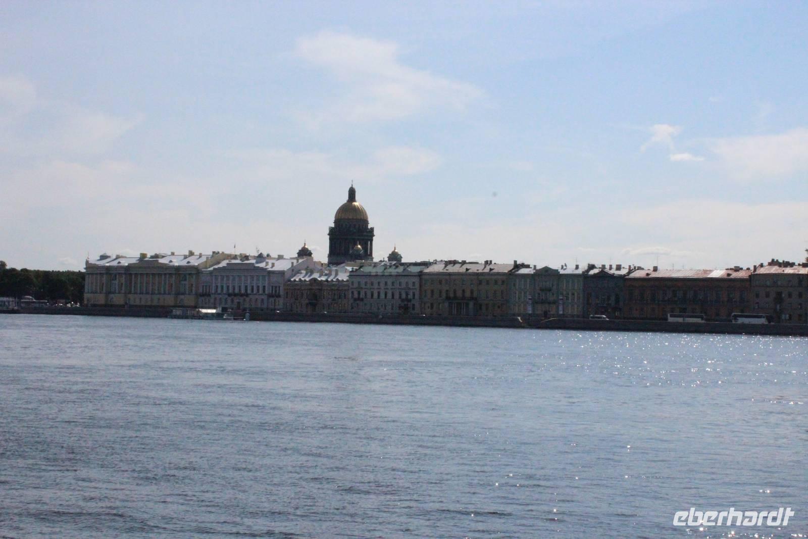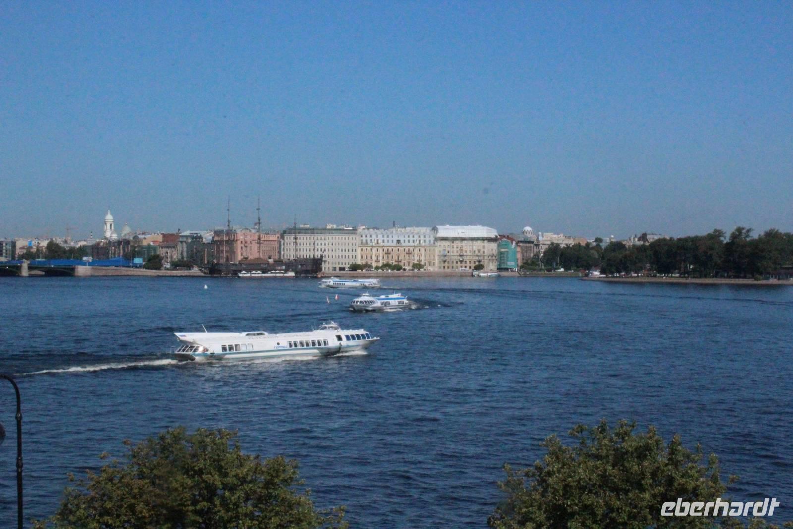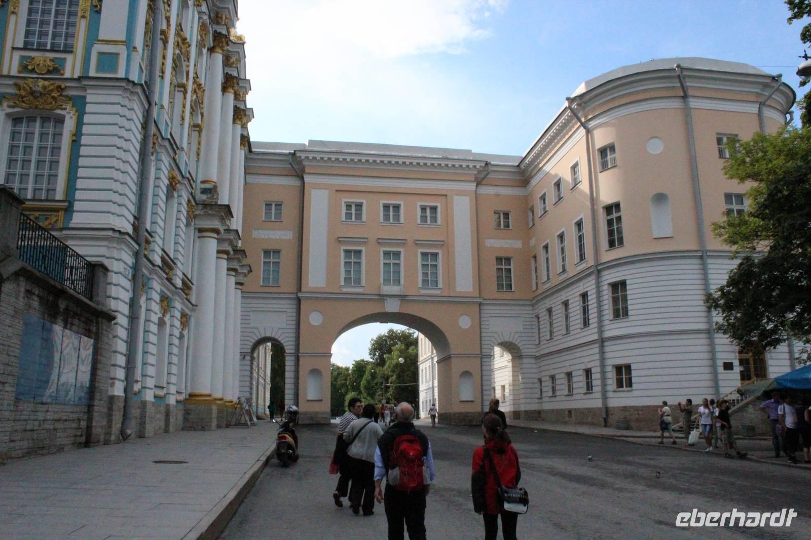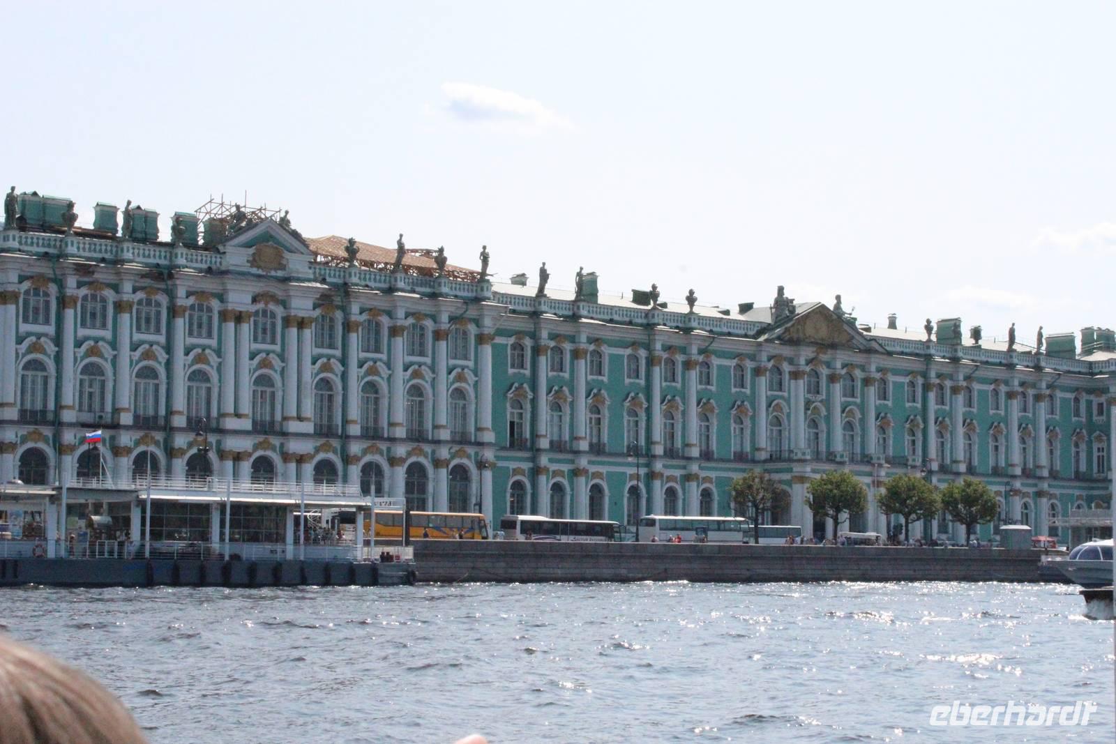 Halb Elf starteten wir zu Fuß zur Eremitage, welche nur etwa 15min entfernt von unserem Hotel lag. Dabei liefen wir auf dem Newski-Prospekt entlang unter dem Triumphbogen hindurch bis zum großen Alexanderplatz vor der Eremitage. Dort angekommen besichtigten wir ca. zwei Stunden die Räume der Eremitage, welche viele Ausstellungsstücke bereithielt. Von Wandteppichen über Kronleuchter bis hin zu Gemälden des weltbekannten Malers Leonardo Da Vinci war alles vertreten. Auch gab es viel Meißner Porzellan, ein Bild von Dresden sowie ein Bild von Pirna zu sehen. Nach einer längeren Pause ging es dann mit einem kurzen Fußmarsch zu unserem Boot, mit welchem wir ein kleines Stück der 74km langen Newa und der Moika befuhren. Hierbei mussten wir auf den Stühlen sitzen bleiben, da wir unter vielen Brücken hindurch fuhren. Und wie so schön auf dem Schild an der Bootswand stand: „In St. Petersburg gibt es über 500 Brücken, aber sie haben nur einen Kopf". Während wir die Flüsse und Kanäle entlang fuhren und unter vielen Brücken hindurchschwammen, kamen wir an zahlreichen Palästen und Häusern von St. Petersburg vorbei, welche schöne Fotomotive boten. Nach der Bootsfahrt ging es dann auch schon wieder zu Fuß zum Hotel oder noch zu einem kleinen Stadtbummel.