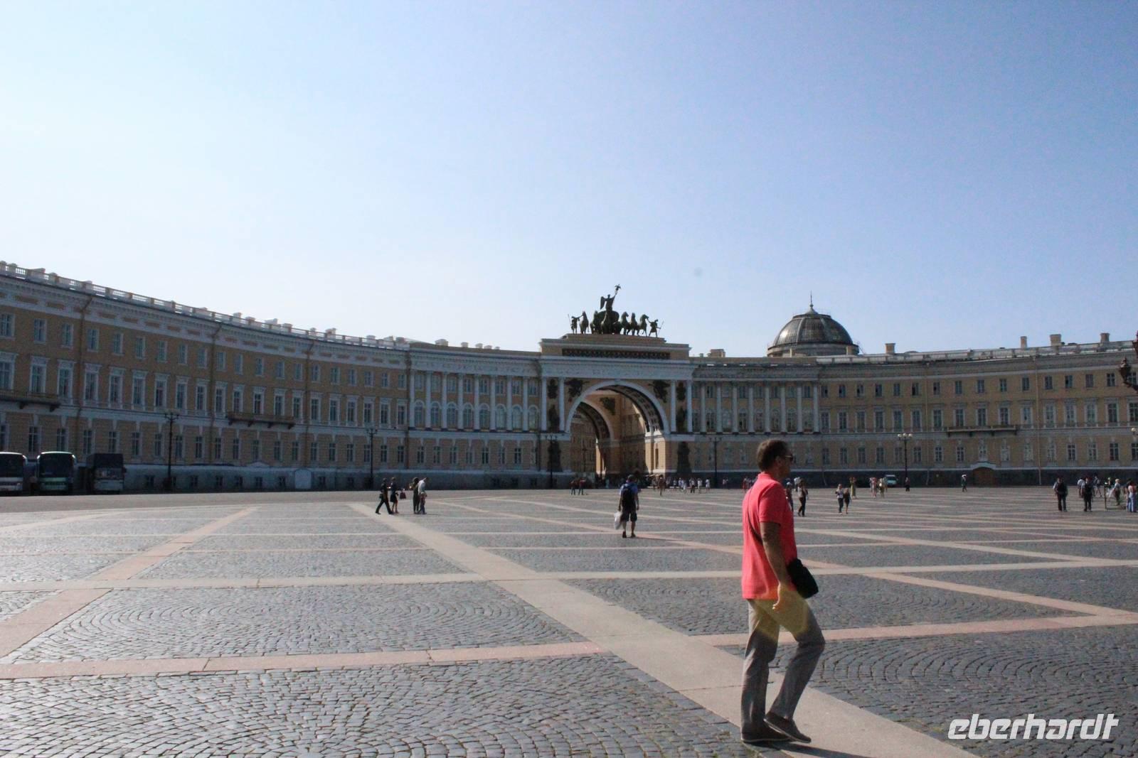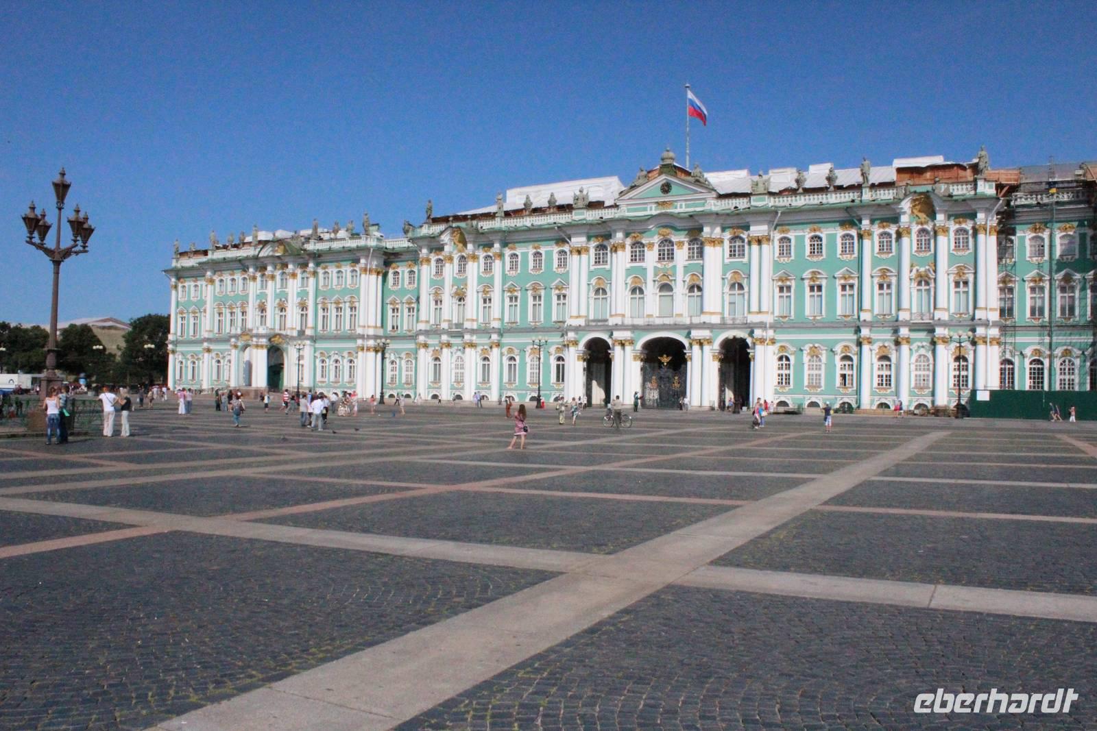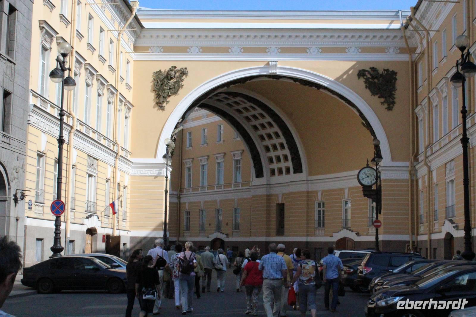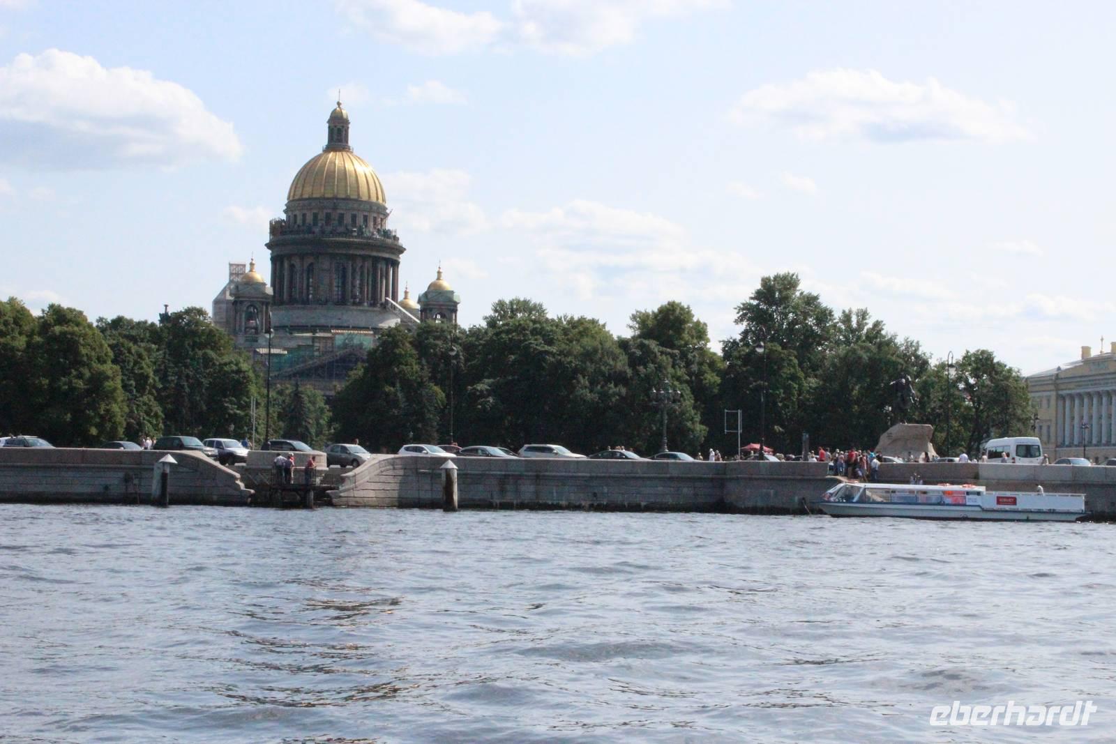Halb Elf starteten wir zu Fuß zur Eremitage, welche nur etwa 15min entfernt von unserem Hotel lag. Dabei liefen wir auf dem Newski-Prospekt entlang unter dem Triumphbogen hindurch bis zum großen Alexanderplatz vor der Eremitage. Dort angekommen besichtigten wir ca. zwei Stunden die Räume der Eremitage, welche viele Ausstellungsstücke bereithielt. Von Wandteppichen über Kronleuchter bis hin zu Gemälden des weltbekannten Malers Leonardo Da Vinci war alles vertreten. Auch gab es viel Meißner Porzellan, ein Bild von Dresden sowie ein Bild von Pirna zu sehen. Nach einer längeren Pause ging es dann mit einem kurzen Fußmarsch zu unserem Boot, mit welchem wir ein kleines Stück der 74km langen Newa und der Moika befuhren. Hierbei mussten wir auf den Stühlen sitzen bleiben, da wir unter vielen Brücken hindurch fuhren. Und wie so schön auf dem Schild an der Bootswand stand: „In St. Petersburg gibt es über 500 Brücken, aber sie haben nur einen Kopf". Während wir die Flüsse und Kanäle entlang fuhren und unter vielen Brücken hindurchschwammen, kamen wir an zahlreichen Palästen und Häusern von St. Petersburg vorbei, welche schöne Fotomotive boten. Nach der Bootsfahrt ging es dann auch schon wieder zu Fuß zum Hotel oder noch zu einem kleinen Stadtbummel.