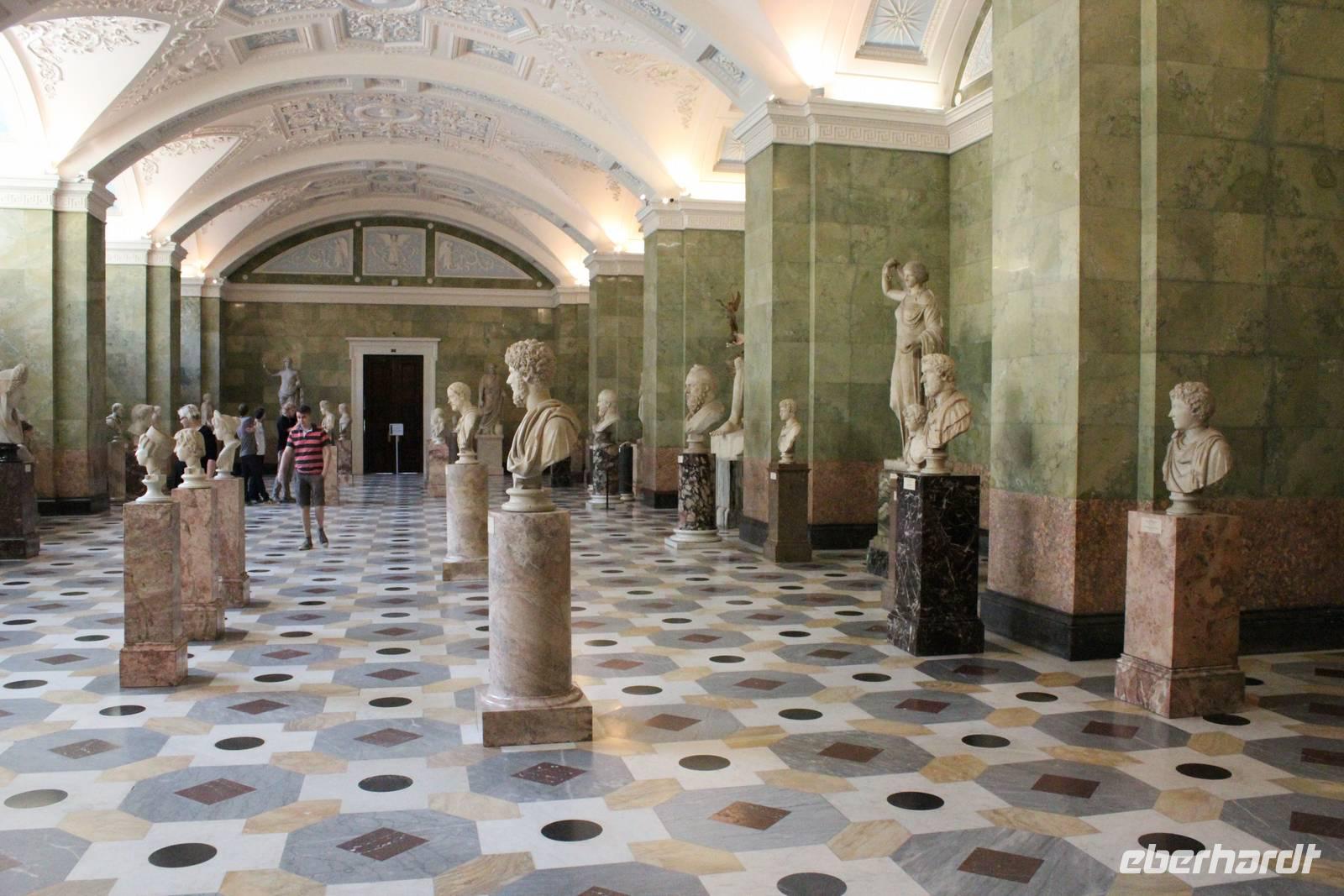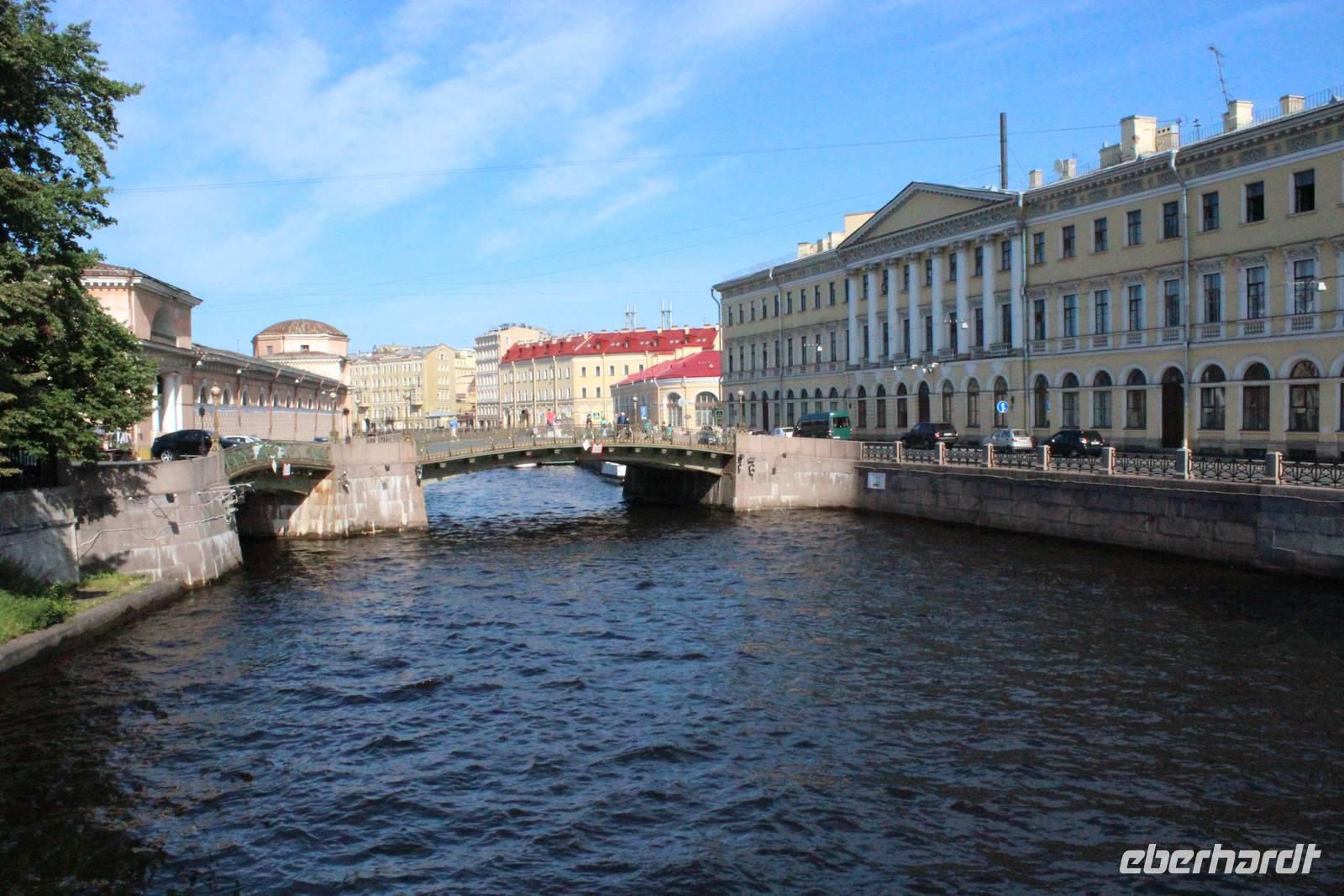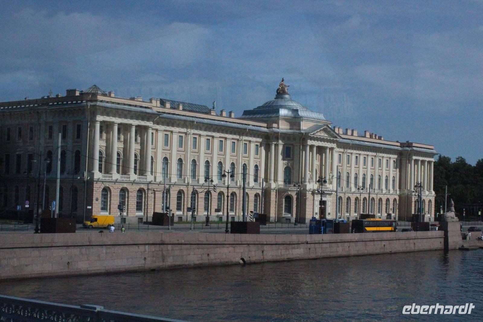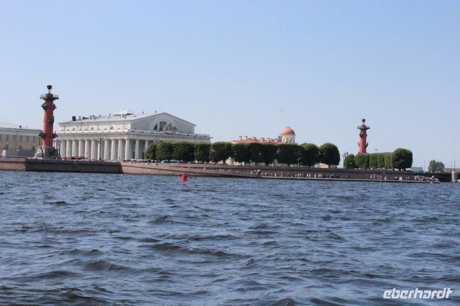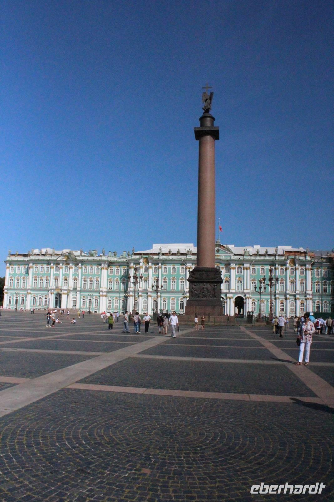 Halb Elf starteten wir zu Fuß zur Eremitage, welche nur etwa 15min entfernt von unserem Hotel lag. Dabei liefen wir auf dem Newski-Prospekt entlang unter dem Triumphbogen hindurch bis zum großen Alexanderplatz vor der Eremitage. Dort angekommen besichtigten wir ca. zwei Stunden die Räume der Eremitage, welche viele Ausstellungsstücke bereithielt. Von Wandteppichen über Kronleuchter bis hin zu Gemälden des weltbekannten Malers Leonardo Da Vinci war alles vertreten. Auch gab es viel Meißner Porzellan, ein Bild von Dresden sowie ein Bild von Pirna zu sehen. Nach einer längeren Pause ging es dann mit einem kurzen Fußmarsch zu unserem Boot, mit welchem wir ein kleines Stück der 74km langen Newa und der Moika befuhren. Hierbei mussten wir auf den Stühlen sitzen bleiben, da wir unter vielen Brücken hindurch fuhren. Und wie so schön auf dem Schild an der Bootswand stand: „In St. Petersburg gibt es über 500 Brücken, aber sie haben nur einen Kopf". Während wir die Flüsse und Kanäle entlang fuhren und unter vielen Brücken hindurchschwammen, kamen wir an zahlreichen Palästen und Häusern von St. Petersburg vorbei, welche schöne Fotomotive boten. Nach der Bootsfahrt ging es dann auch schon wieder zu Fuß zum Hotel oder noch zu einem kleinen Stadtbummel.