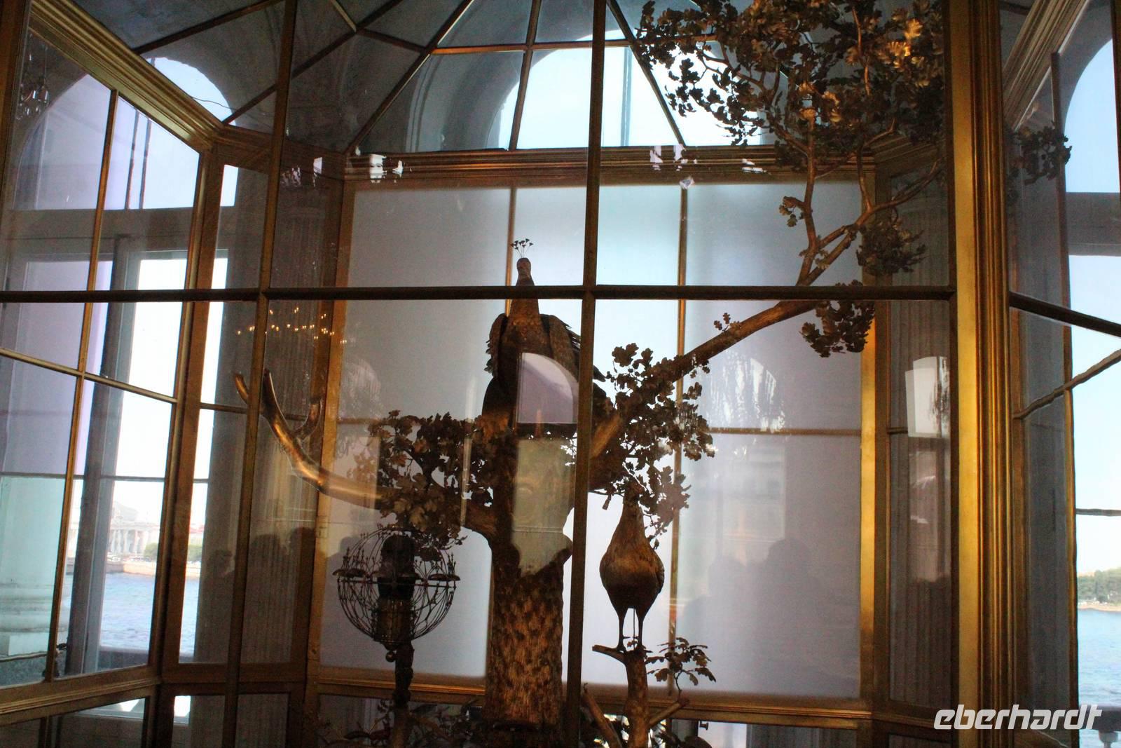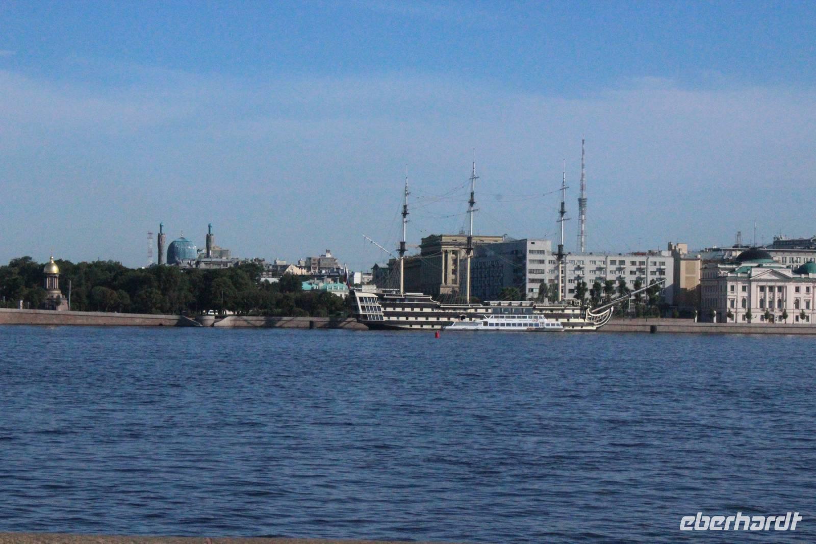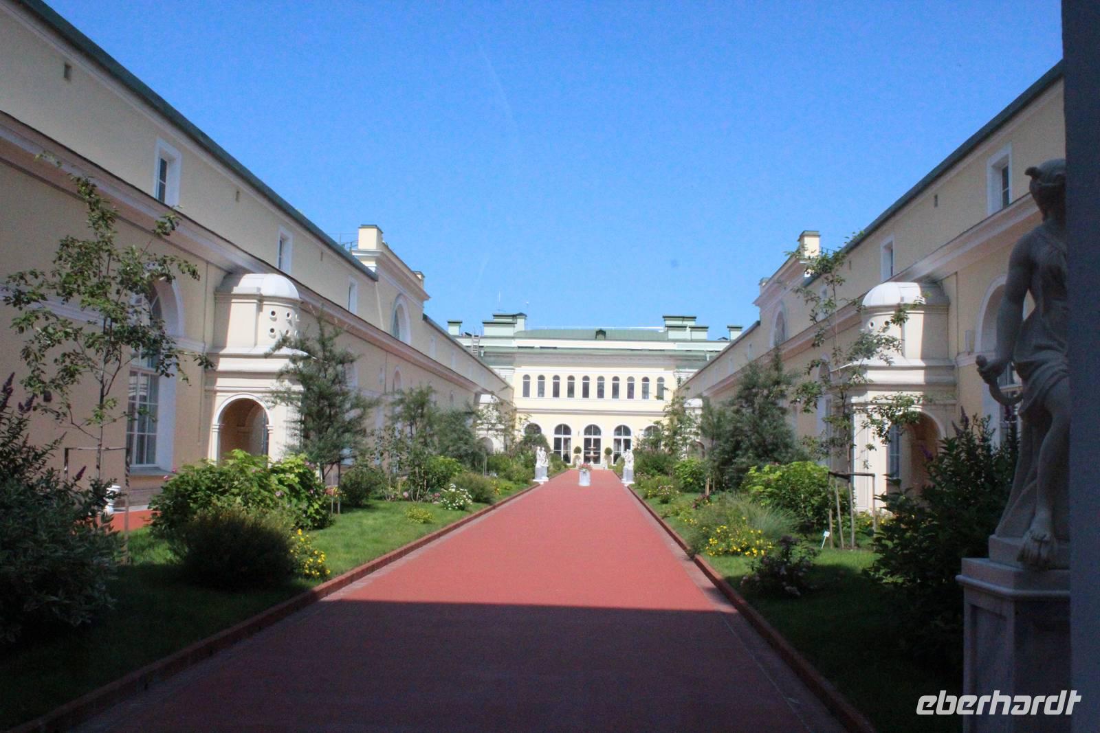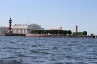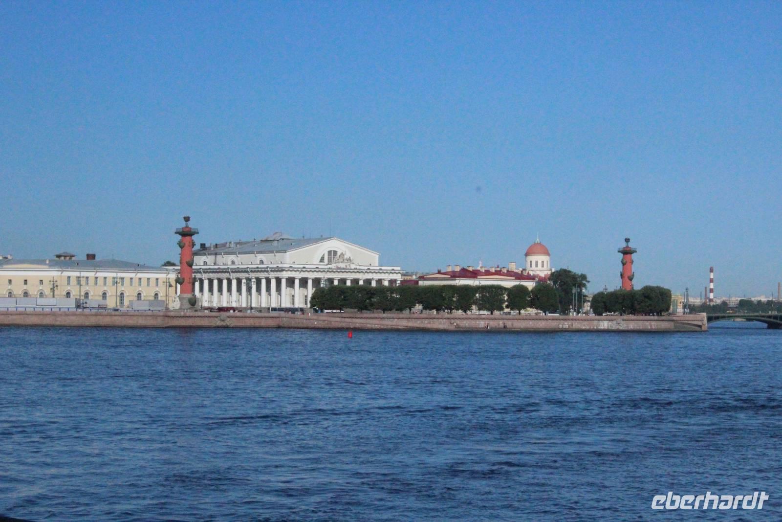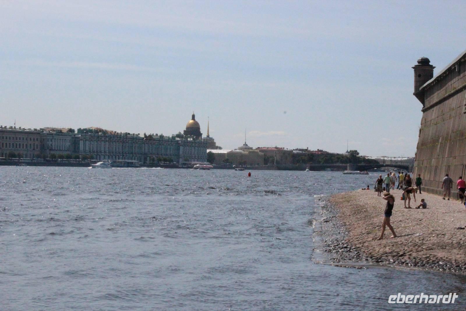 Halb Elf starteten wir zu Fuß zur Eremitage, welche nur etwa 15min entfernt von unserem Hotel lag. Dabei liefen wir auf dem Newski-Prospekt entlang unter dem Triumphbogen hindurch bis zum großen Alexanderplatz vor der Eremitage. Dort angekommen besichtigten wir ca. zwei Stunden die Räume der Eremitage, welche viele Ausstellungsstücke bereithielt. Von Wandteppichen über Kronleuchter bis hin zu Gemälden des weltbekannten Malers Leonardo Da Vinci war alles vertreten. Auch gab es viel Meißner Porzellan, ein Bild von Dresden sowie ein Bild von Pirna zu sehen. Nach einer längeren Pause ging es dann mit einem kurzen Fußmarsch zu unserem Boot, mit welchem wir ein kleines Stück der 74km langen Newa und der Moika befuhren. Hierbei mussten wir auf den Stühlen sitzen bleiben, da wir unter vielen Brücken hindurch fuhren. Und wie so schön auf dem Schild an der Bootswand stand: „In St. Petersburg gibt es über 500 Brücken, aber sie haben nur einen Kopf". Während wir die Flüsse und Kanäle entlang fuhren und unter vielen Brücken hindurchschwammen, kamen wir an zahlreichen Palästen und Häusern von St. Petersburg vorbei, welche schöne Fotomotive boten. Nach der Bootsfahrt ging es dann auch schon wieder zu Fuß zum Hotel oder noch zu einem kleinen Stadtbummel.