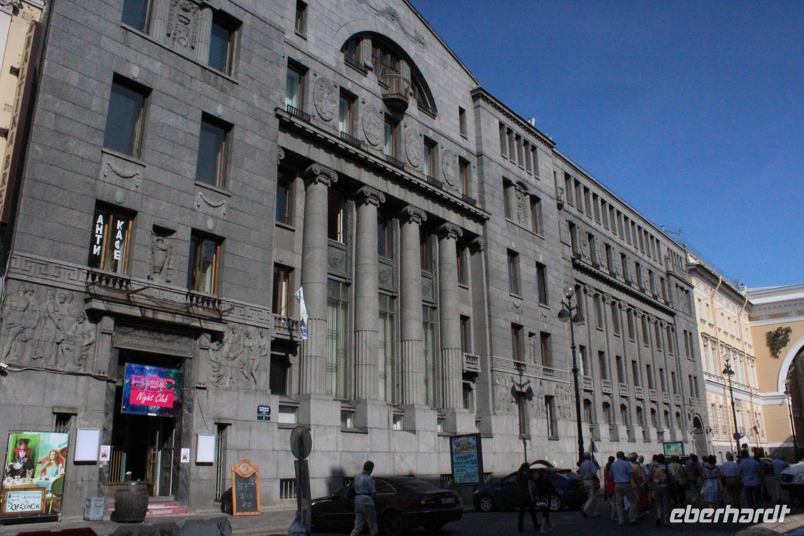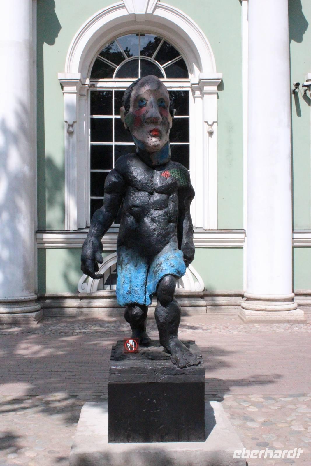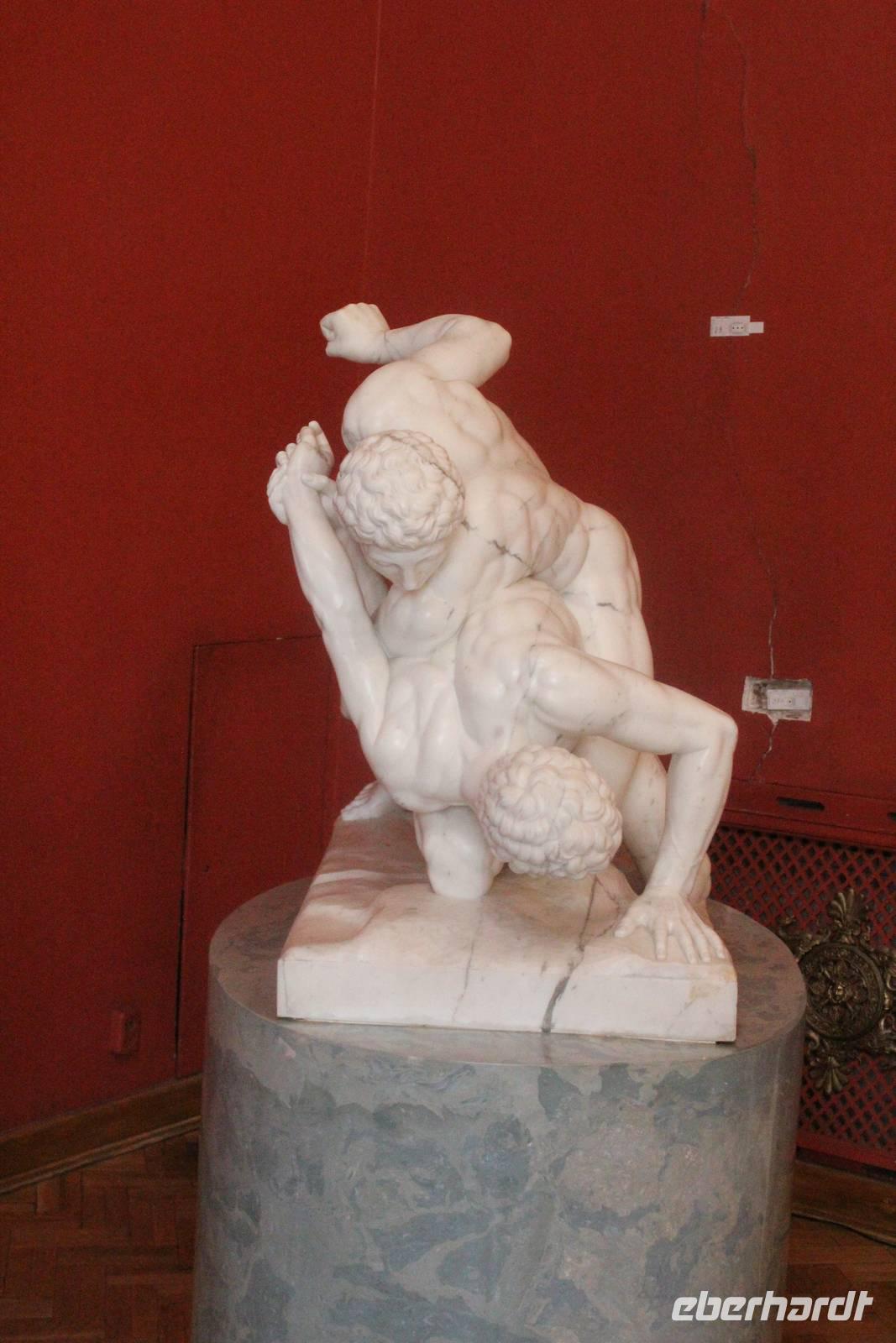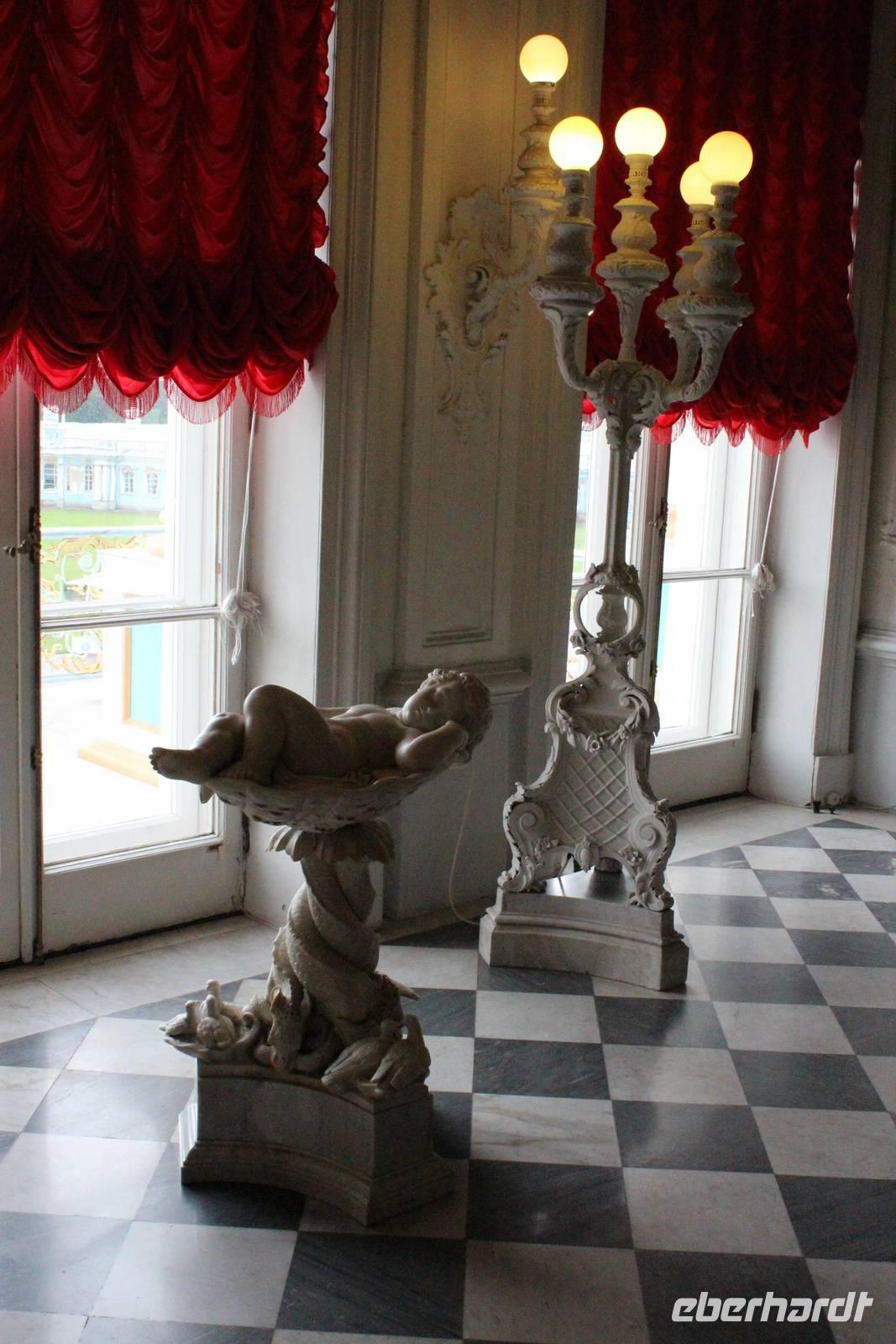 Halb Elf starteten wir zu Fuß zur Eremitage, welche nur etwa 15min entfernt von unserem Hotel lag. Dabei liefen wir auf dem Newski-Prospekt entlang unter dem Triumphbogen hindurch bis zum großen Alexanderplatz vor der Eremitage. Dort angekommen besichtigten wir ca. zwei Stunden die Räume der Eremitage, welche viele Ausstellungsstücke bereithielt. Von Wandteppichen über Kronleuchter bis hin zu Gemälden des weltbekannten Malers Leonardo Da Vinci war alles vertreten. Auch gab es viel Meißner Porzellan, ein Bild von Dresden sowie ein Bild von Pirna zu sehen. Nach einer längeren Pause ging es dann mit einem kurzen Fußmarsch zu unserem Boot, mit welchem wir ein kleines Stück der 74km langen Newa und der Moika befuhren. Hierbei mussten wir auf den Stühlen sitzen bleiben, da wir unter vielen Brücken hindurch fuhren. Und wie so schön auf dem Schild an der Bootswand stand: „In St. Petersburg gibt es über 500 Brücken, aber sie haben nur einen Kopf". Während wir die Flüsse und Kanäle entlang fuhren und unter vielen Brücken hindurchschwammen, kamen wir an zahlreichen Palästen und Häusern von St. Petersburg vorbei, welche schöne Fotomotive boten. Nach der Bootsfahrt ging es dann auch schon wieder zu Fuß zum Hotel oder noch zu einem kleinen Stadtbummel.
