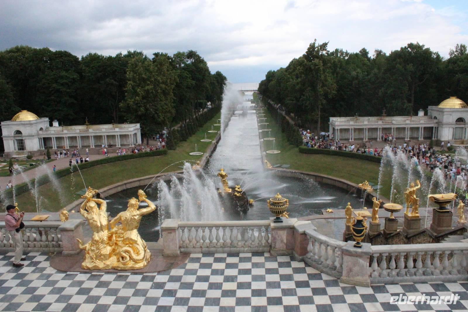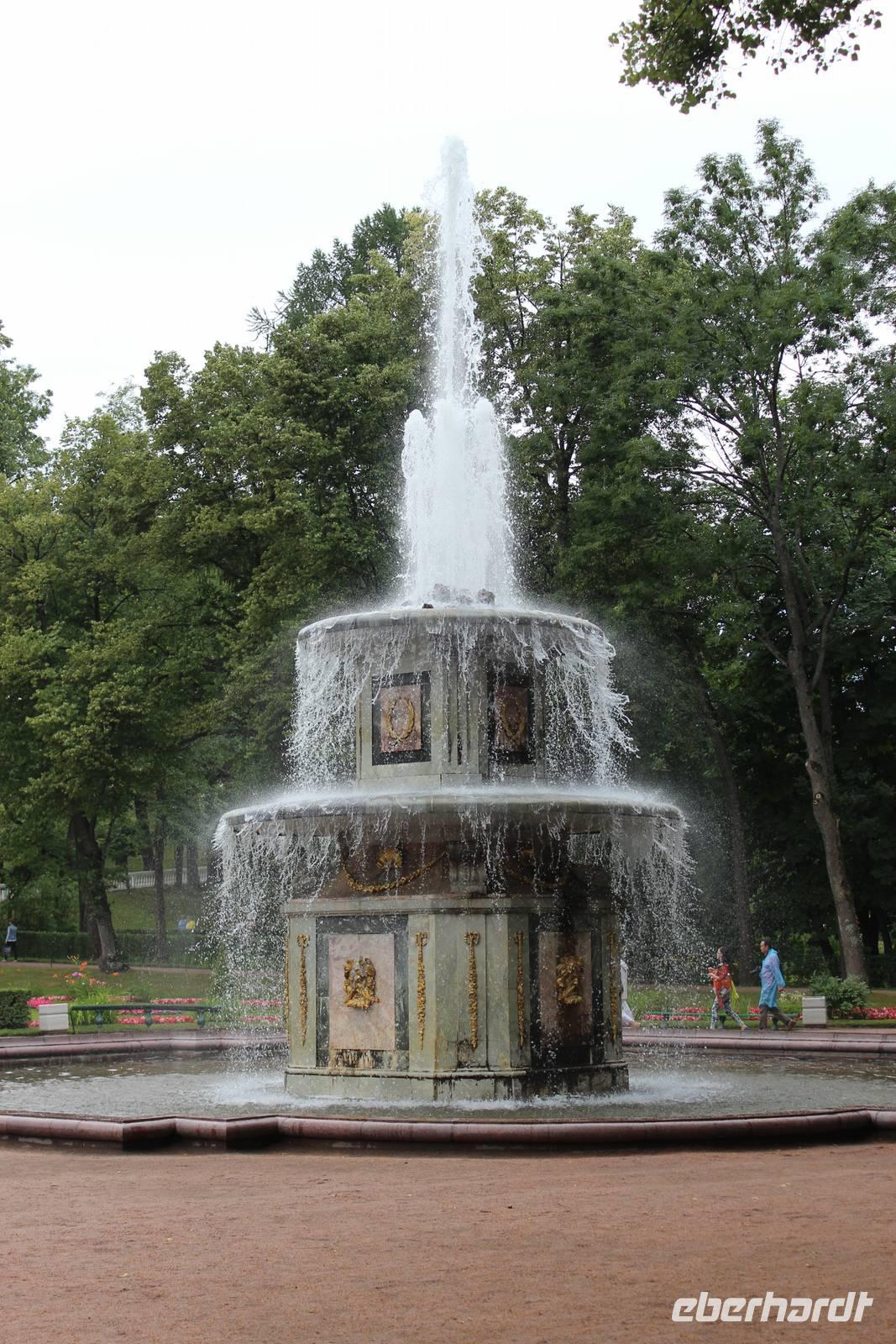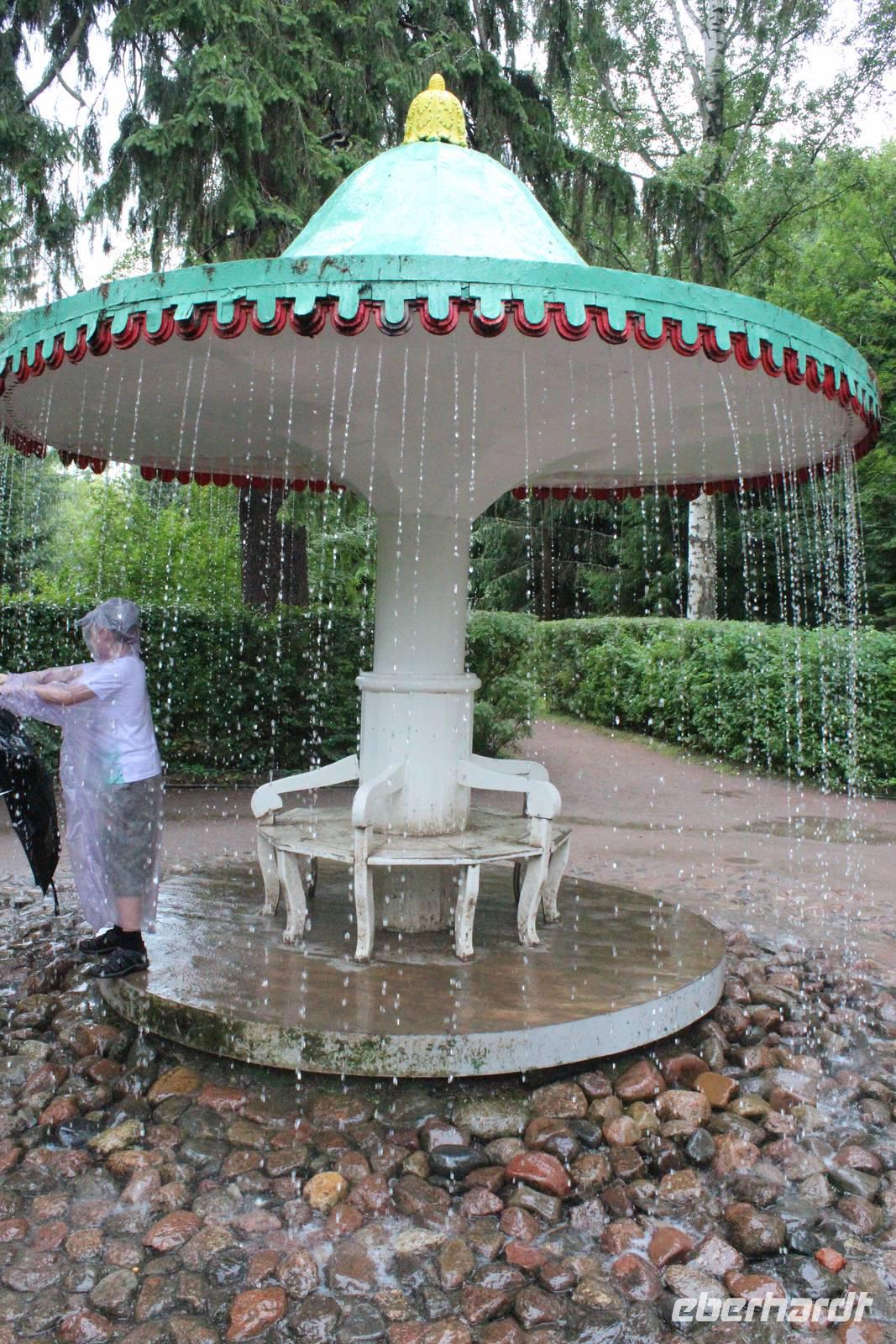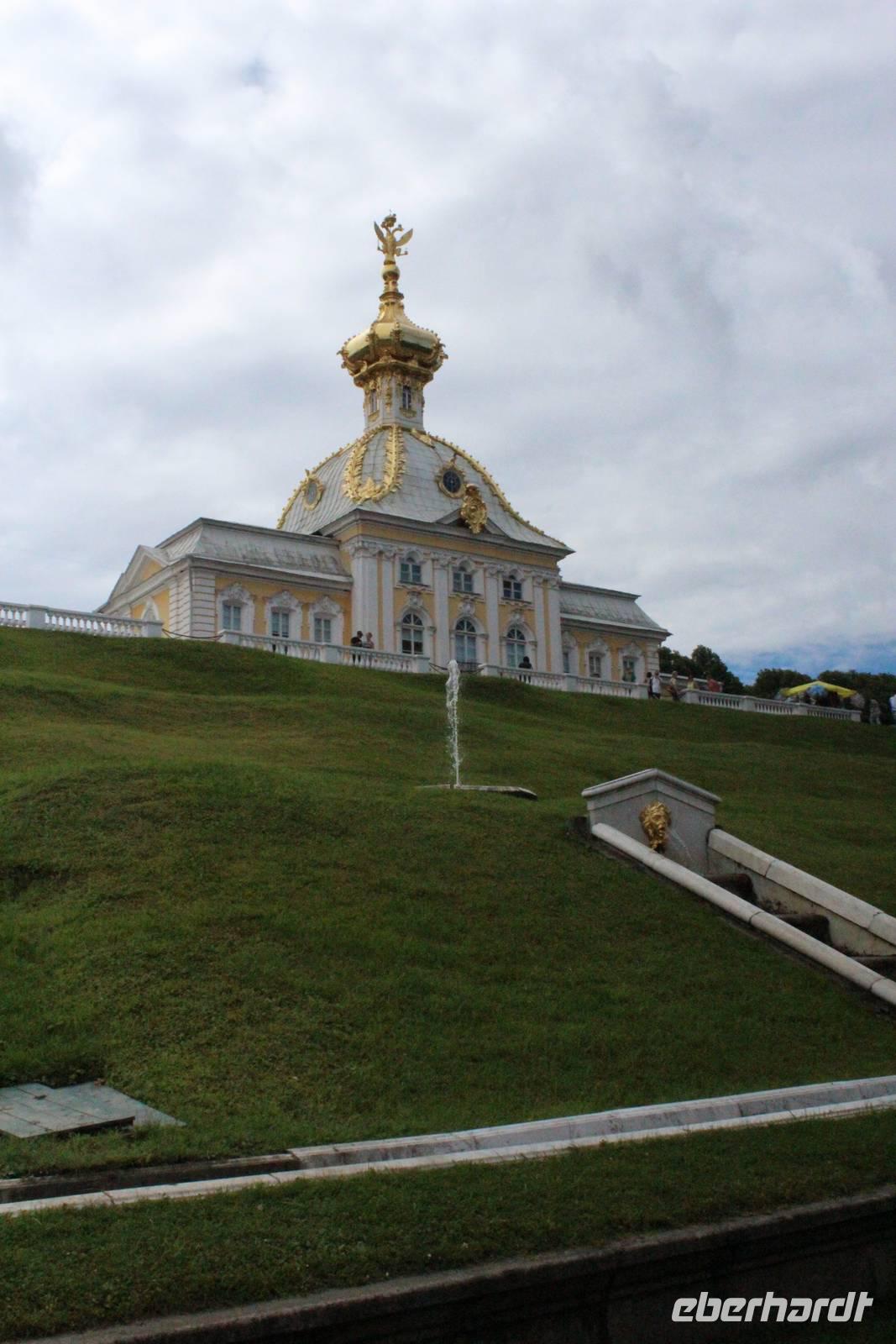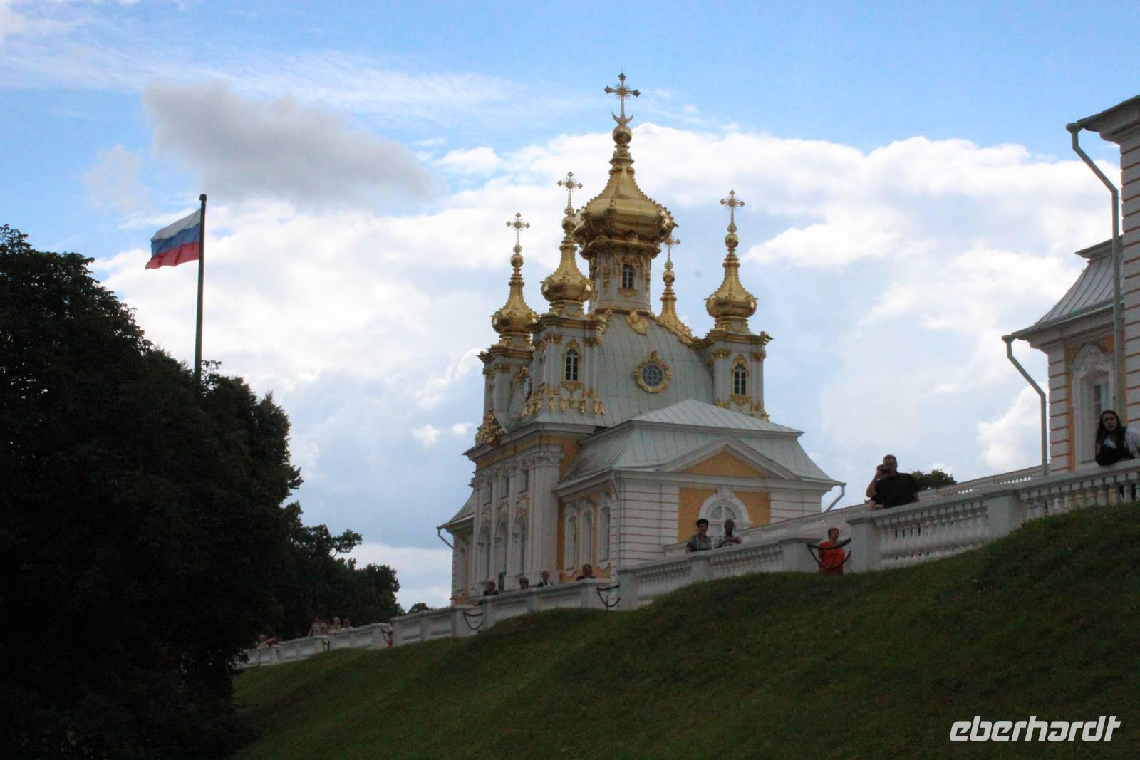 Nach dem Frühstück ging es gegen 9 Uhr mit dem Bus zum Peterhof. Am Peterhof angekommen lachte uns die Sonne noch in unser Gesicht und die Springbrunnen waren noch ausgeschaltet. Wir besichtigten als erstes die Innenräume des Peterhofs. Leider ist es nicht gestattet hier Fotoaufnahmen zu machen. Jeder Raum im Peterhof war kostbar eingerichtet. Als wir nach draußen in den Garten gingen, waren die Springbrunnen und Wasserspiele bereits eingeschaltet. Doch leider setzte auch der Regen ein, so dass wir uns vorerst kurz unterstellten bevor wir bei leichterem Regen den Gartenrundgang machten. Wir gingen an zahlreichen Brunnen und Wasserspielen vorbei, kamen am Balkon zum Meer vorbei und gingen zurück Richtung Peterhof. Nachdem wir uns bei einer Mittagspause gestärkt hatten, ging es mit dem Bus Richtung Innenstadt zurück, aber wir machten noch einen kurzen Fotostopp an der Chesma Church, welche aussieht, als sei sie von einem Konditor aus Zucker gebaut worden.