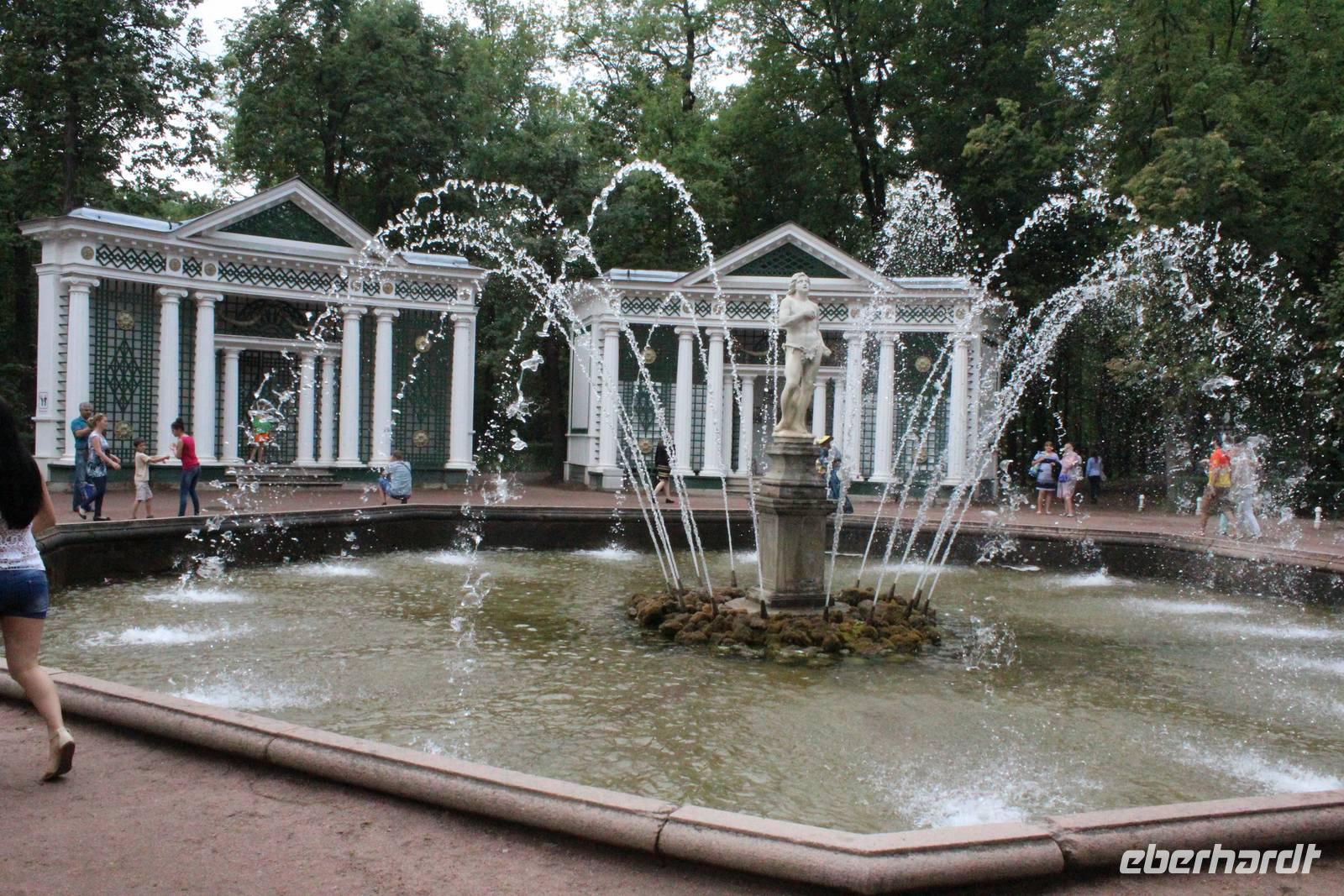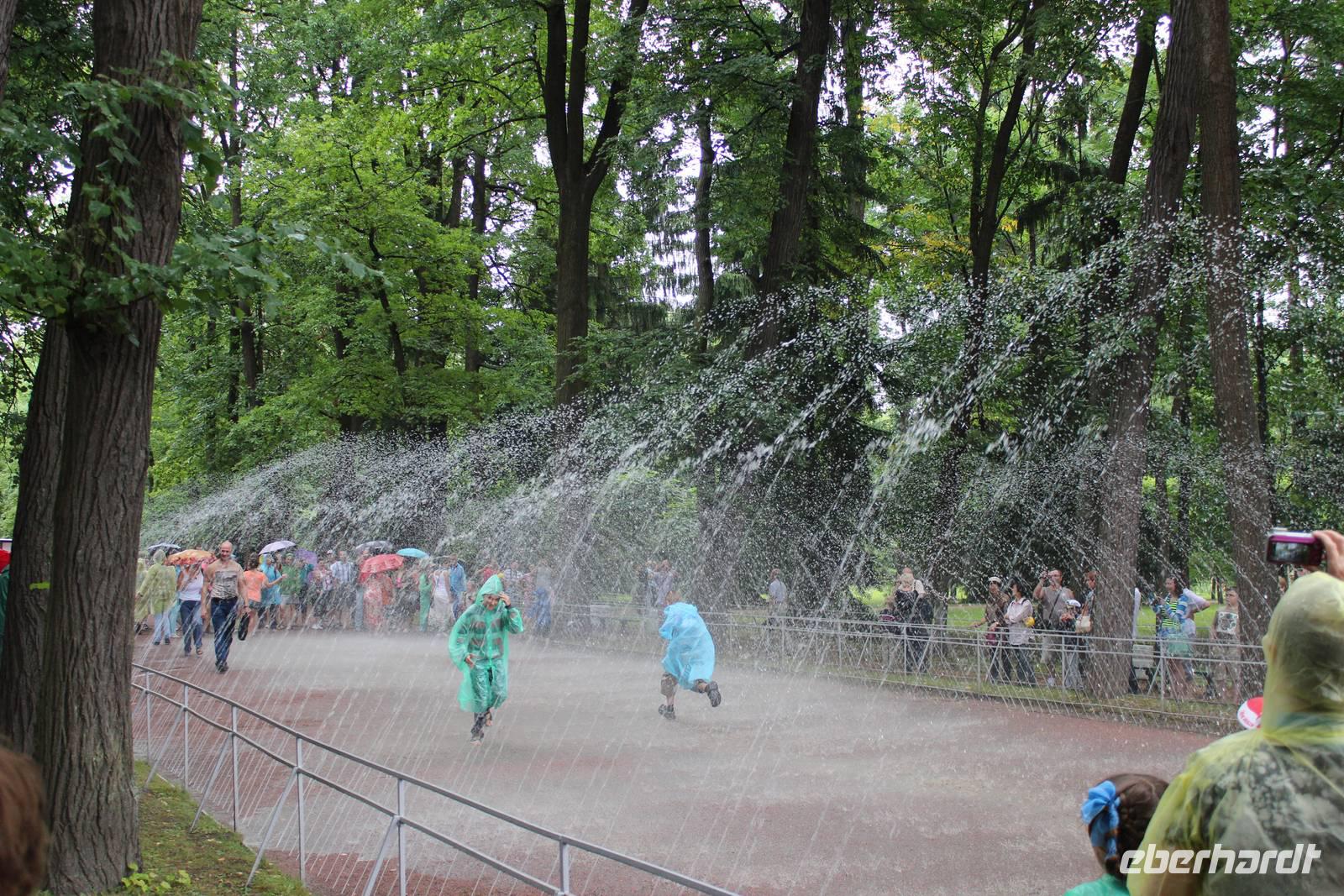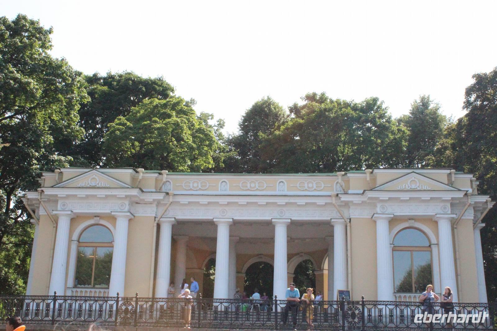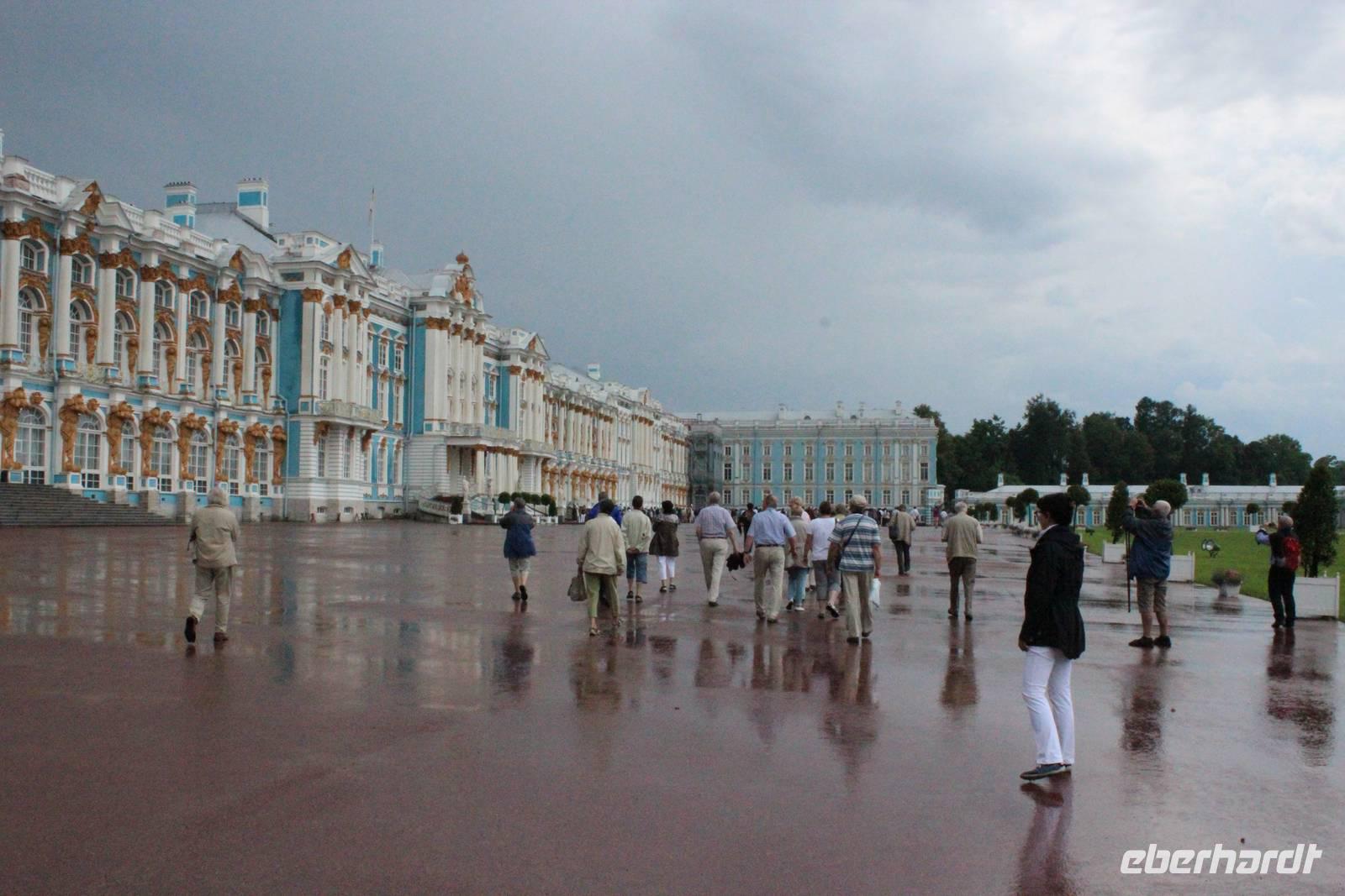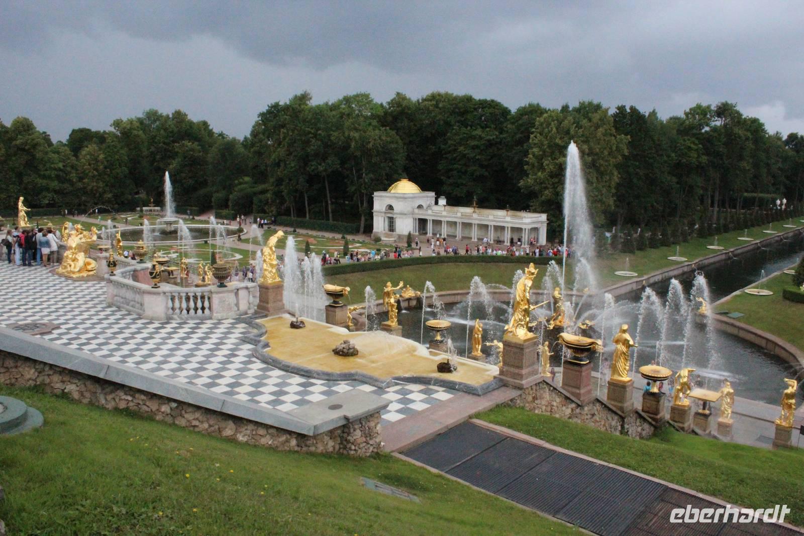Nach dem Frühstück ging es gegen 9 Uhr mit dem Bus zum Peterhof. Am Peterhof angekommen lachte uns die Sonne noch in unser Gesicht und die Springbrunnen waren noch ausgeschaltet. Wir besichtigten als erstes die Innenräume des Peterhofs. Leider ist es nicht gestattet hier Fotoaufnahmen zu machen. Jeder Raum im Peterhof war kostbar eingerichtet. Als wir nach draußen in den Garten gingen, waren die Springbrunnen und Wasserspiele bereits eingeschaltet. Doch leider setzte auch der Regen ein, so dass wir uns vorerst kurz unterstellten bevor wir bei leichterem Regen den Gartenrundgang machten. Wir gingen an zahlreichen Brunnen und Wasserspielen vorbei, kamen am Balkon zum Meer vorbei und gingen zurück Richtung Peterhof. Nachdem wir uns bei einer Mittagspause gestärkt hatten, ging es mit dem Bus Richtung Innenstadt zurück, aber wir machten noch einen kurzen Fotostopp an der Chesma Church, welche aussieht, als sei sie von einem Konditor aus Zucker gebaut worden.