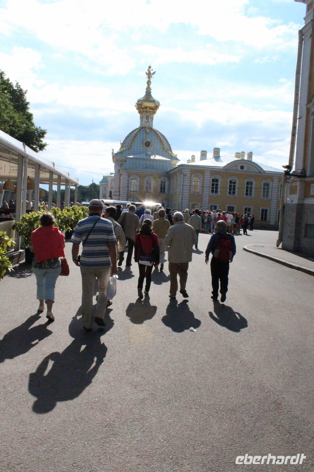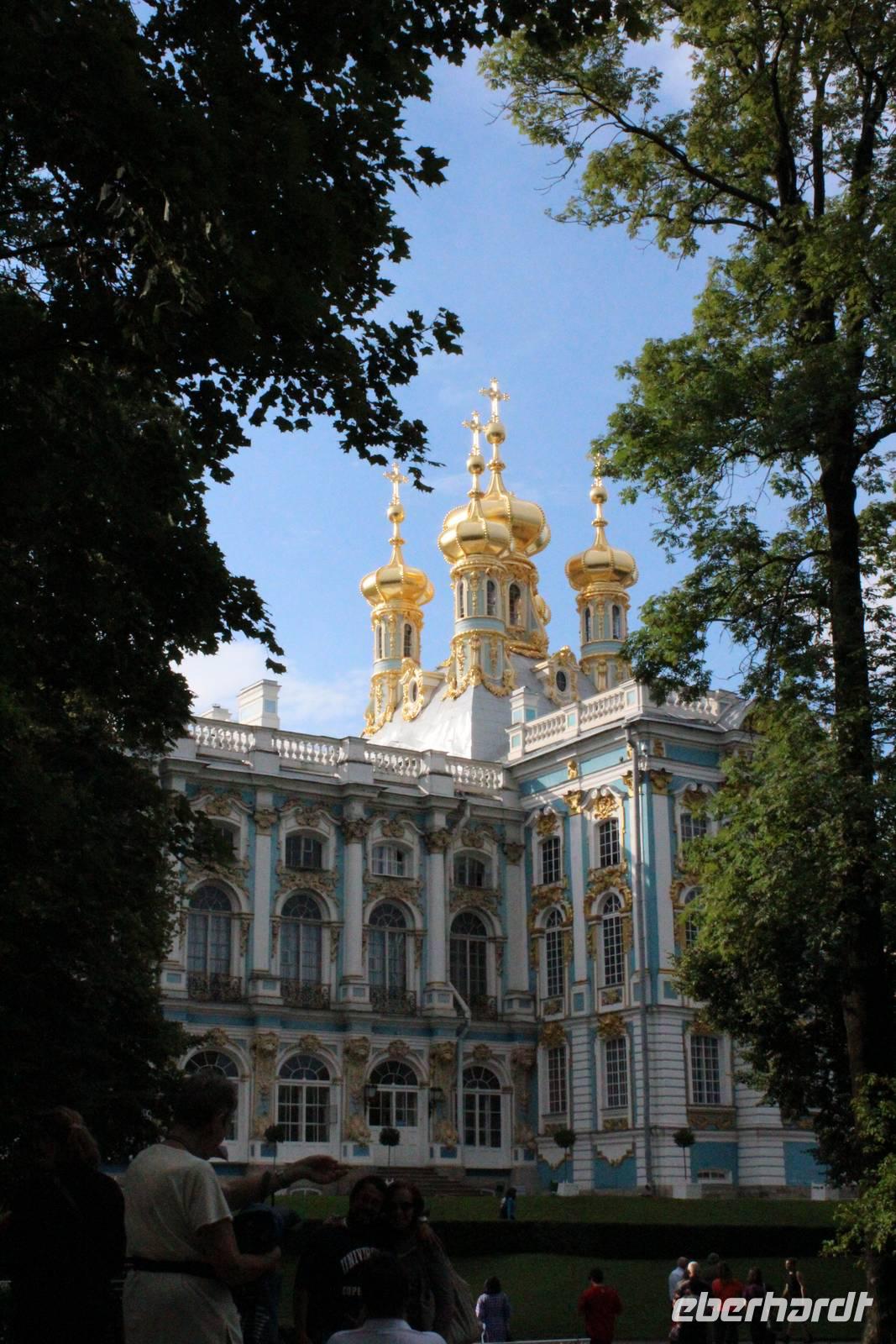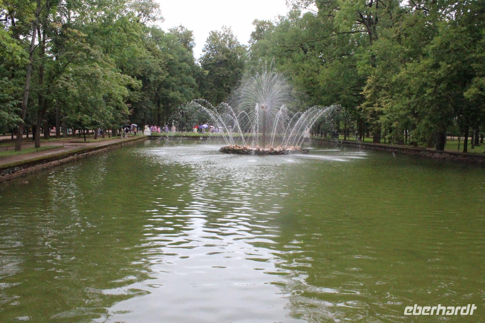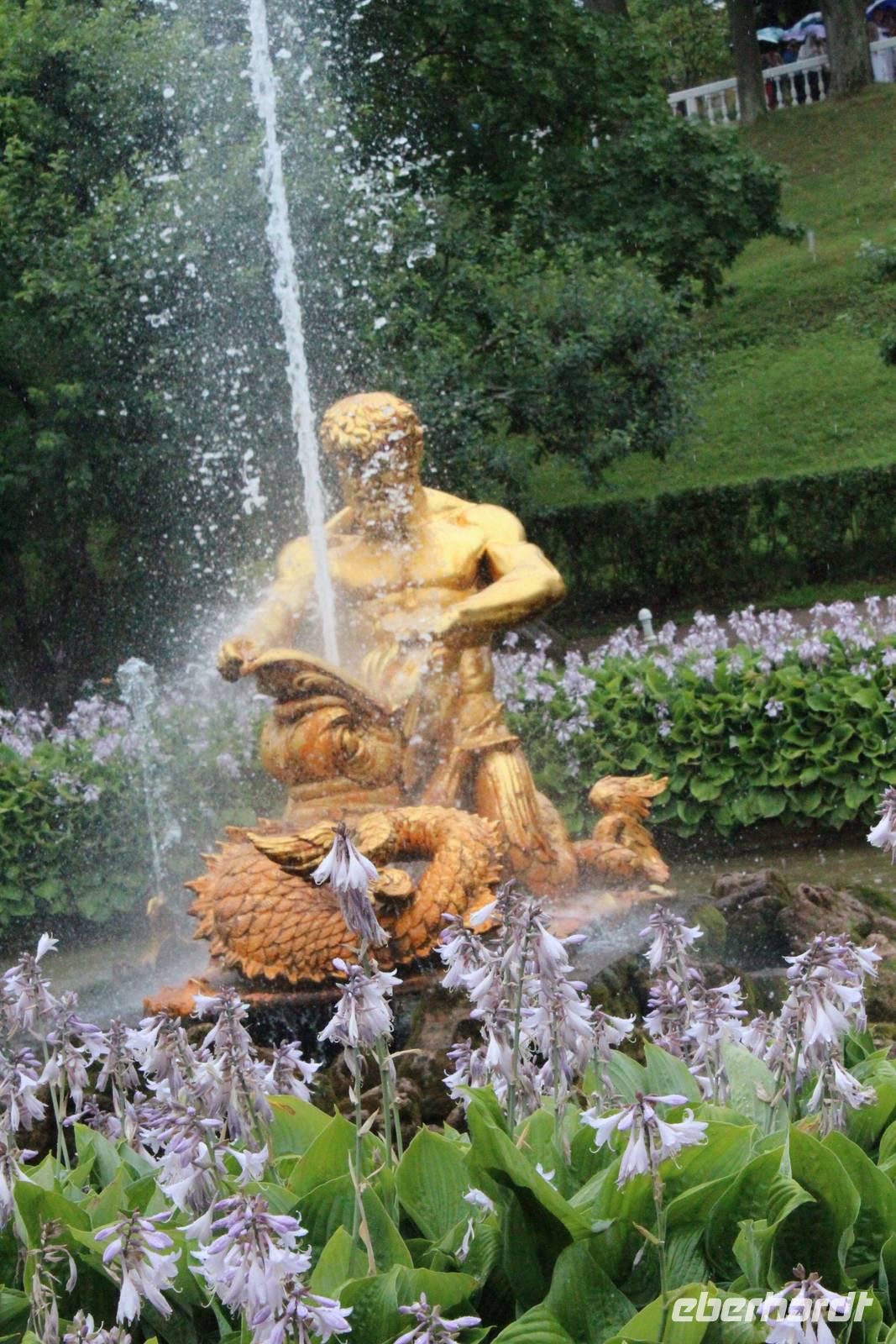 Nach dem Frühstück ging es gegen 9 Uhr mit dem Bus zum Peterhof. Am Peterhof angekommen lachte uns die Sonne noch in unser Gesicht und die Springbrunnen waren noch ausgeschaltet. Wir besichtigten als erstes die Innenräume des Peterhofs. Leider ist es nicht gestattet hier Fotoaufnahmen zu machen. Jeder Raum im Peterhof war kostbar eingerichtet. Als wir nach draußen in den Garten gingen, waren die Springbrunnen und Wasserspiele bereits eingeschaltet. Doch leider setzte auch der Regen ein, so dass wir uns vorerst kurz unterstellten bevor wir bei leichterem Regen den Gartenrundgang machten. Wir gingen an zahlreichen Brunnen und Wasserspielen vorbei, kamen am Balkon zum Meer vorbei und gingen zurück Richtung Peterhof. Nachdem wir uns bei einer Mittagspause gestärkt hatten, ging es mit dem Bus Richtung Innenstadt zurück, aber wir machten noch einen kurzen Fotostopp an der Chesma Church, welche aussieht, als sei sie von einem Konditor aus Zucker gebaut worden.