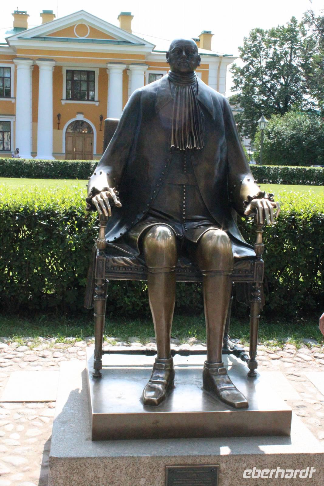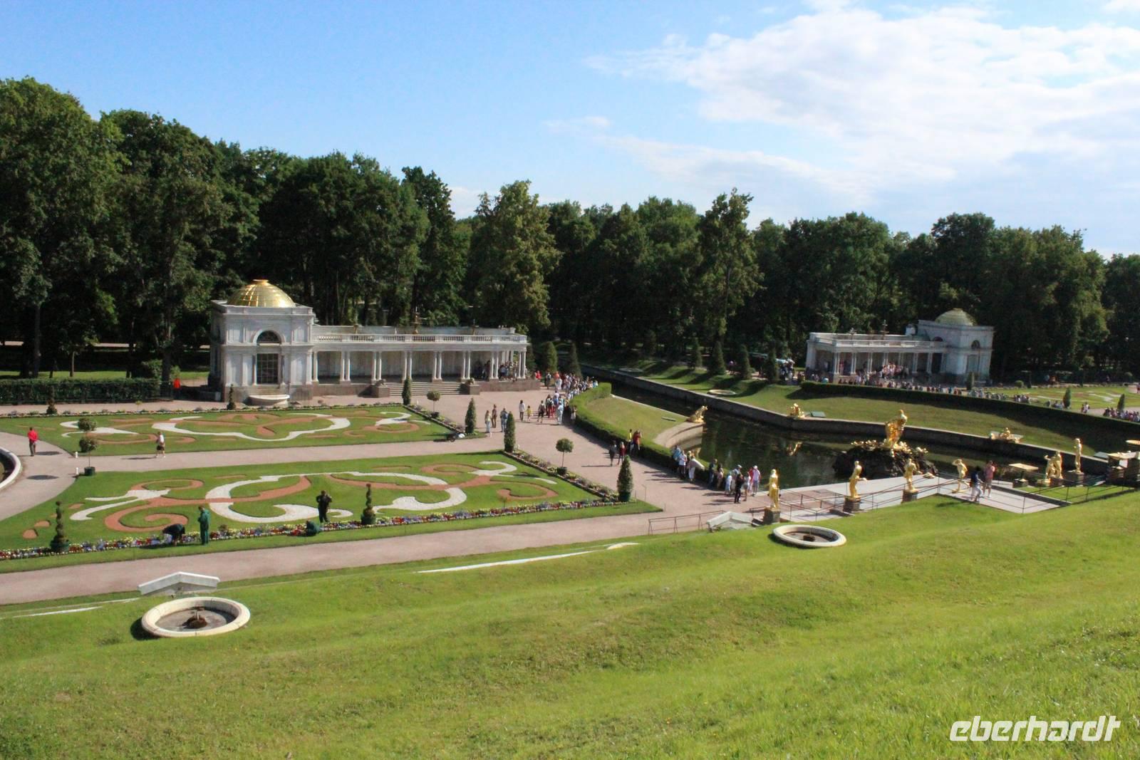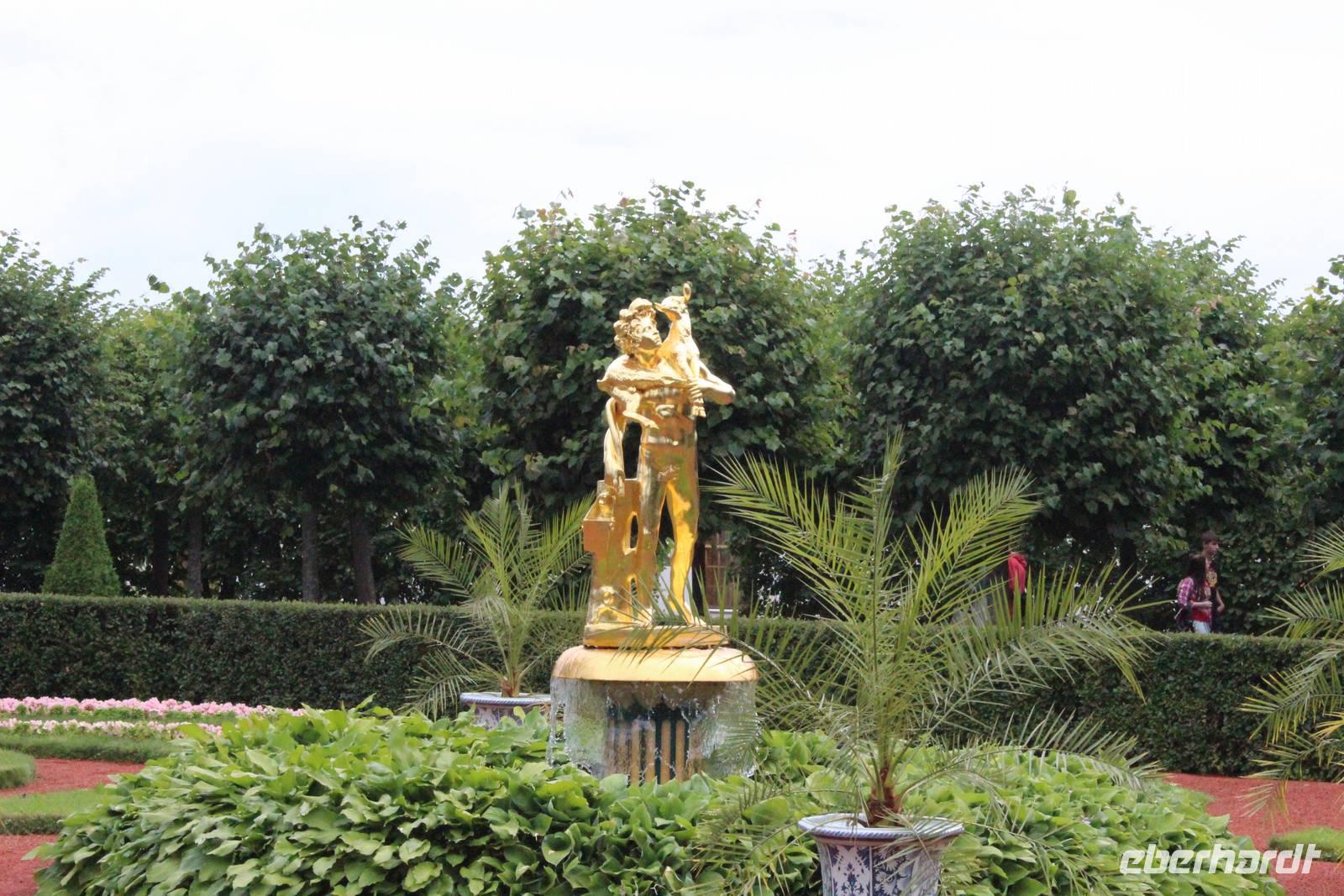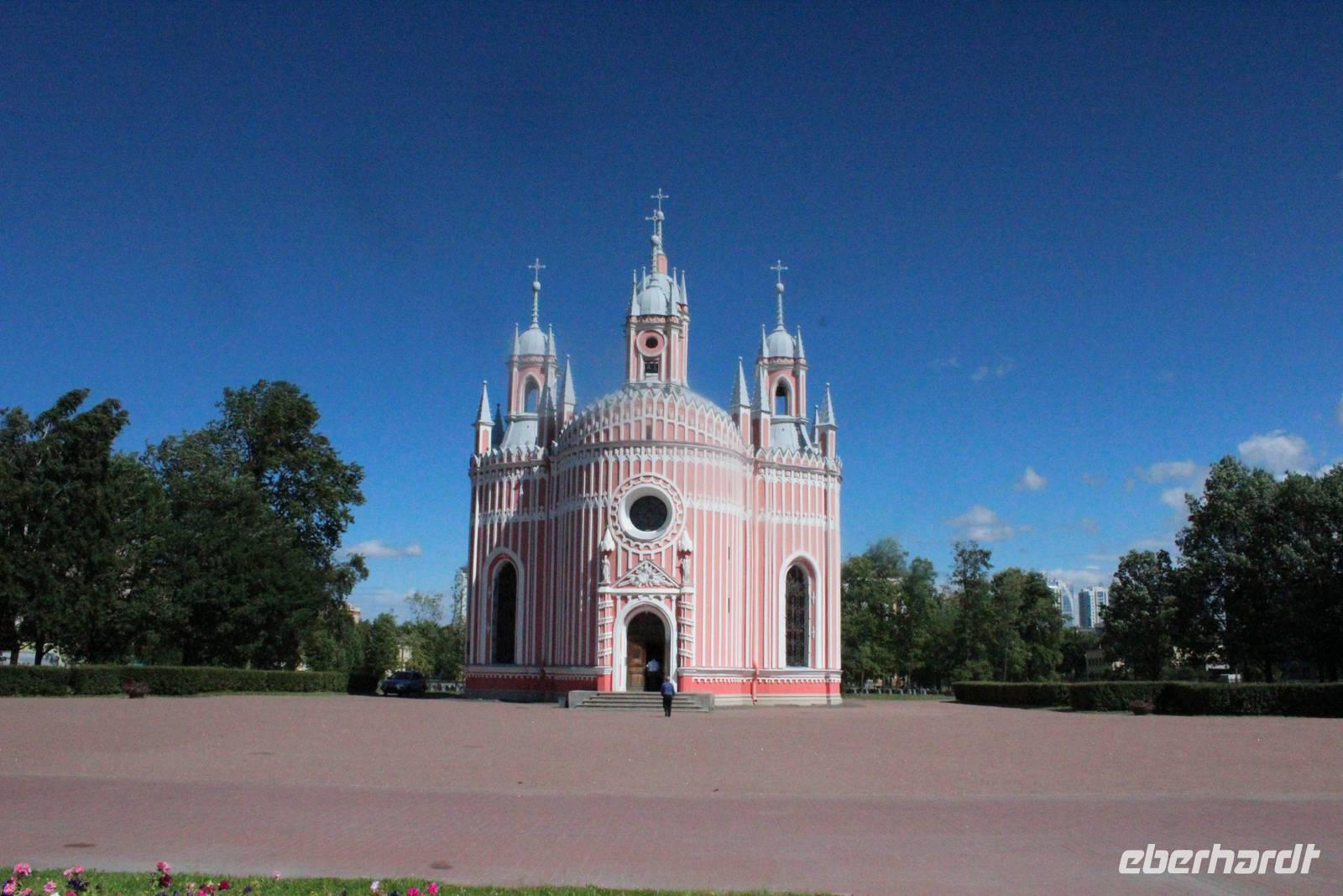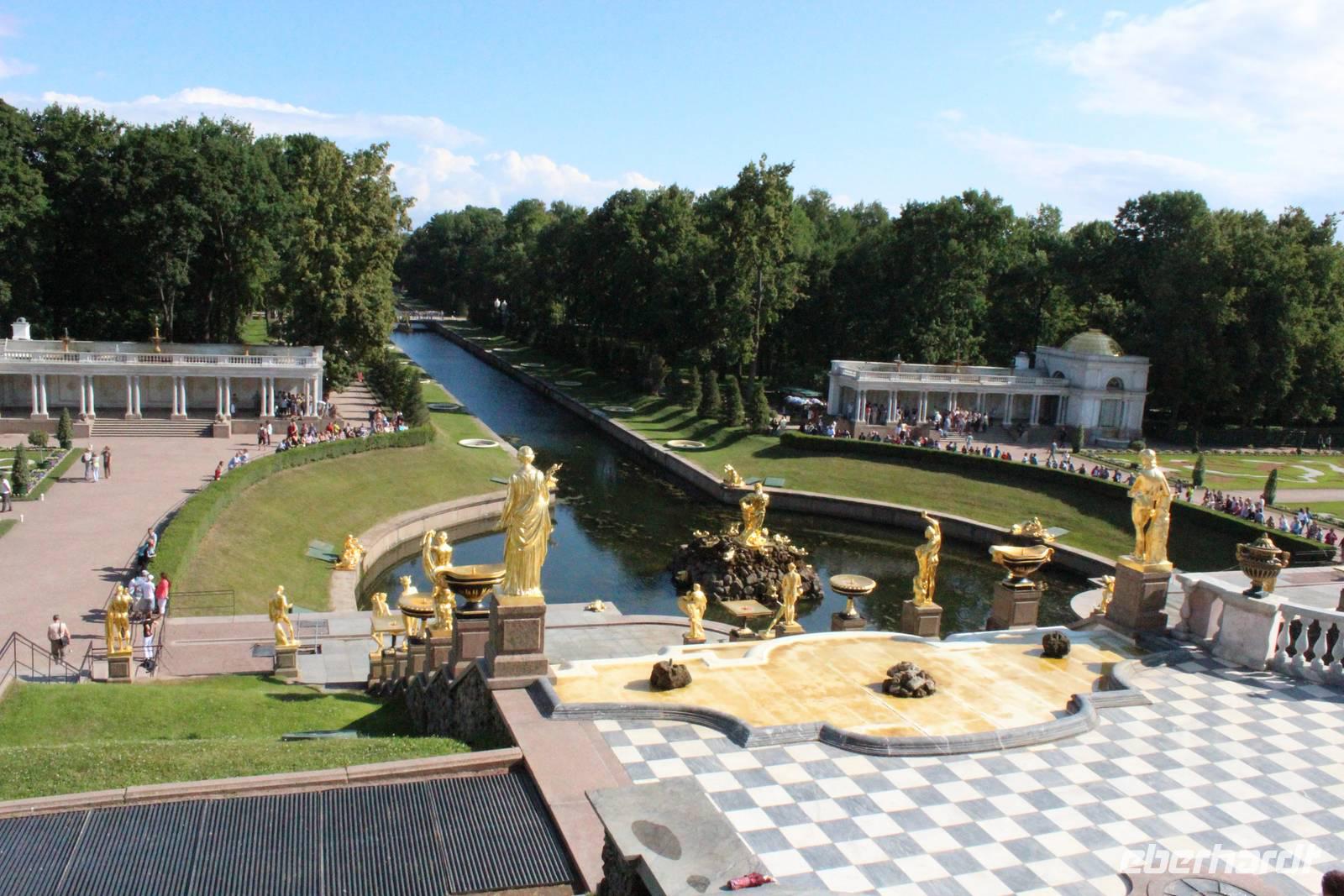 Nach dem Frühstück ging es gegen 9 Uhr mit dem Bus zum Peterhof. Am Peterhof angekommen lachte uns die Sonne noch in unser Gesicht und die Springbrunnen waren noch ausgeschaltet. Wir besichtigten als erstes die Innenräume des Peterhofs. Leider ist es nicht gestattet hier Fotoaufnahmen zu machen. Jeder Raum im Peterhof war kostbar eingerichtet. Als wir nach draußen in den Garten gingen, waren die Springbrunnen und Wasserspiele bereits eingeschaltet. Doch leider setzte auch der Regen ein, so dass wir uns vorerst kurz unterstellten bevor wir bei leichterem Regen den Gartenrundgang machten. Wir gingen an zahlreichen Brunnen und Wasserspielen vorbei, kamen am Balkon zum Meer vorbei und gingen zurück Richtung Peterhof. Nachdem wir uns bei einer Mittagspause gestärkt hatten, ging es mit dem Bus Richtung Innenstadt zurück, aber wir machten noch einen kurzen Fotostopp an der Chesma Church, welche aussieht, als sei sie von einem Konditor aus Zucker gebaut worden.