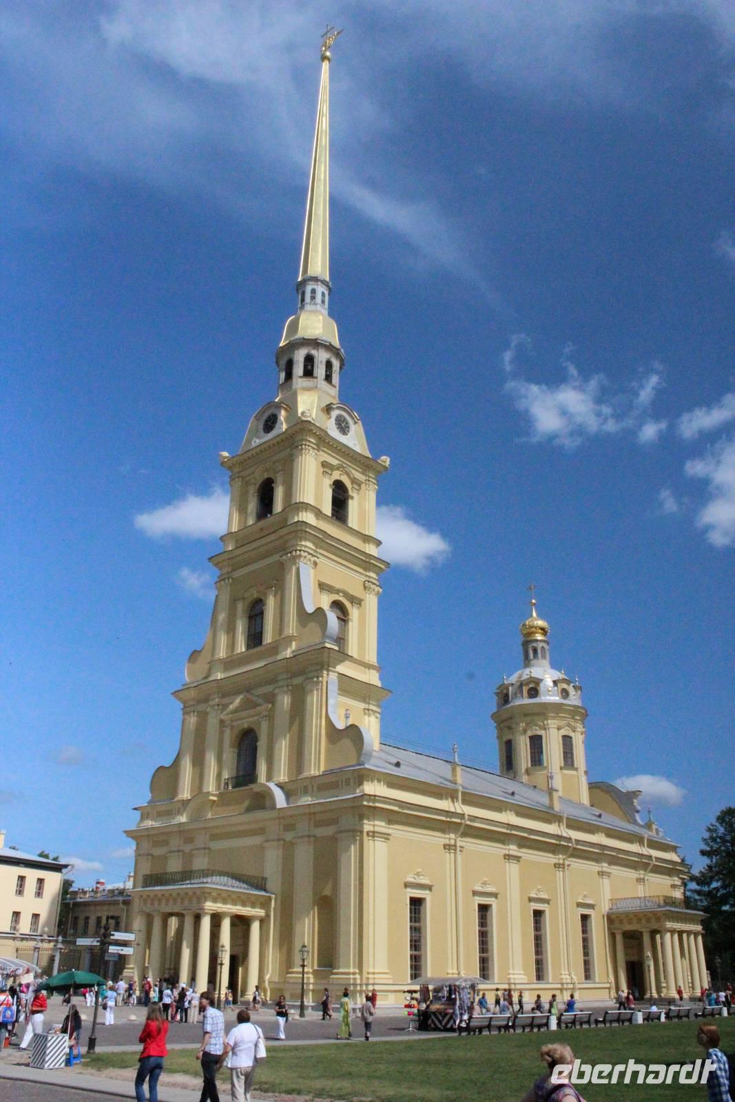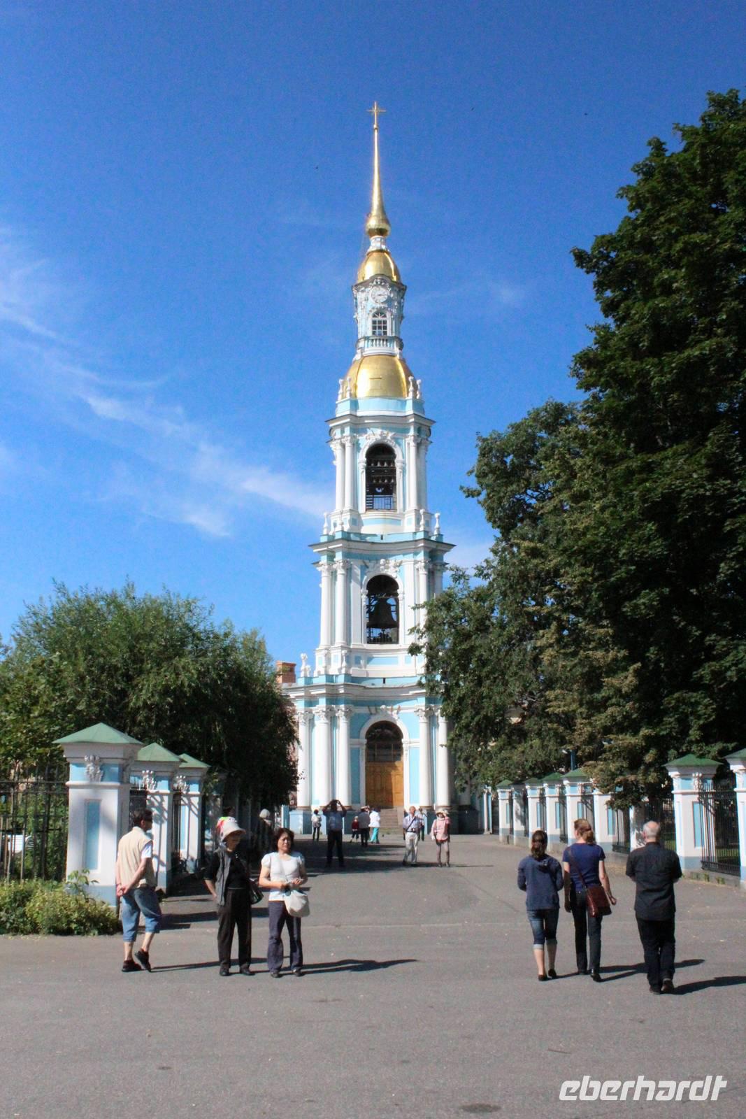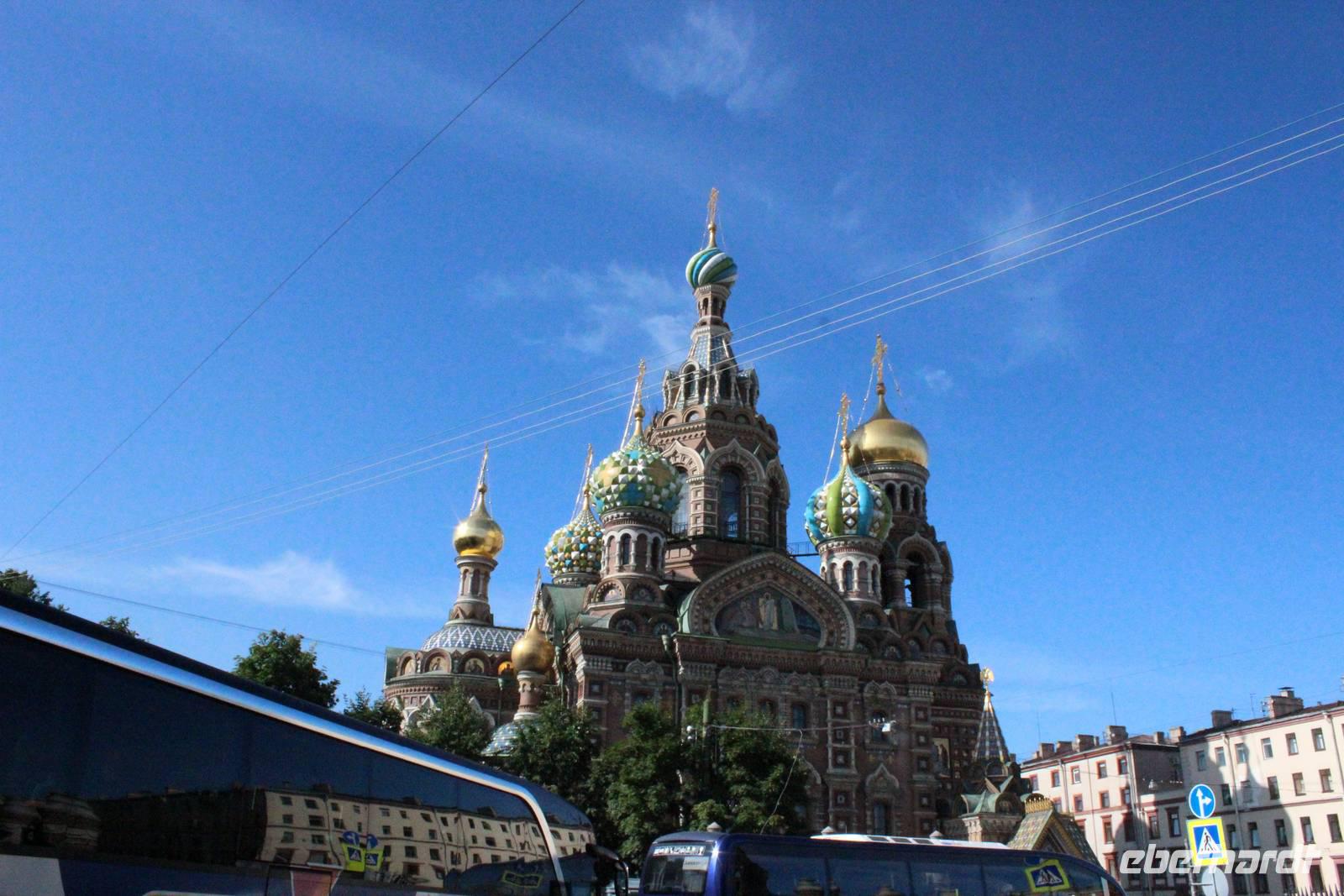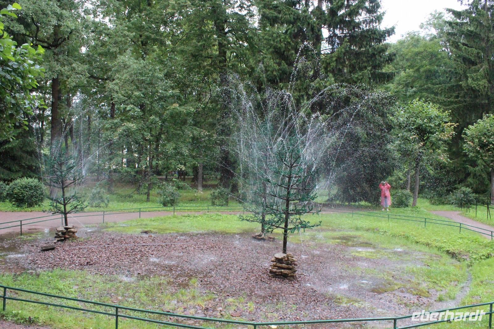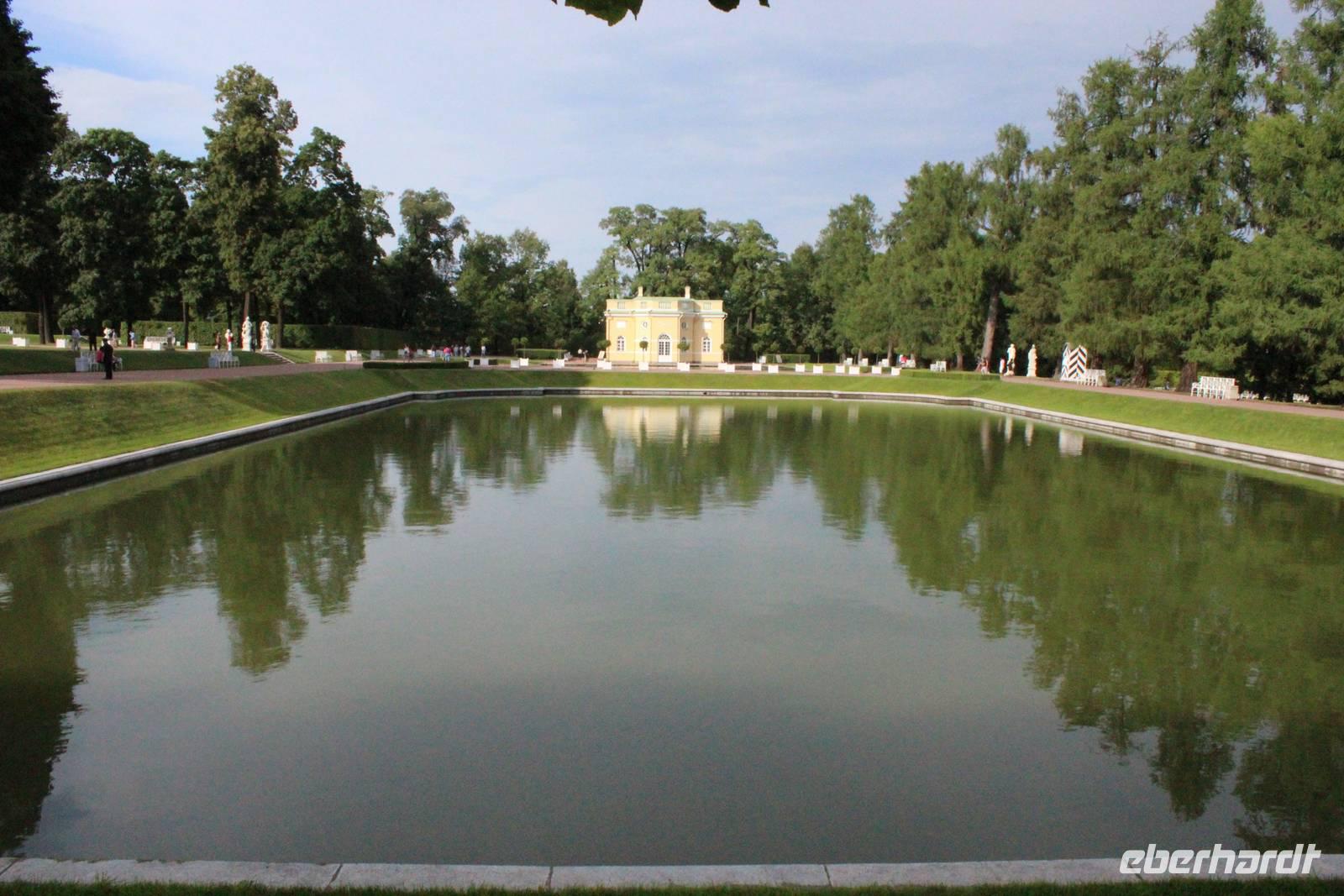 Nach dem Frühstück ging es gegen 9 Uhr mit dem Bus zum Peterhof. Am Peterhof angekommen lachte uns die Sonne noch in unser Gesicht und die Springbrunnen waren noch ausgeschaltet. Wir besichtigten als erstes die Innenräume des Peterhofs. Leider ist es nicht gestattet hier Fotoaufnahmen zu machen. Jeder Raum im Peterhof war kostbar eingerichtet. Als wir nach draußen in den Garten gingen, waren die Springbrunnen und Wasserspiele bereits eingeschaltet. Doch leider setzte auch der Regen ein, so dass wir uns vorerst kurz unterstellten bevor wir bei leichterem Regen den Gartenrundgang machten. Wir gingen an zahlreichen Brunnen und Wasserspielen vorbei, kamen am Balkon zum Meer vorbei und gingen zurück Richtung Peterhof. Nachdem wir uns bei einer Mittagspause gestärkt hatten, ging es mit dem Bus Richtung Innenstadt zurück, aber wir machten noch einen kurzen Fotostopp an der Chesma Church, welche aussieht, als sei sie von einem Konditor aus Zucker gebaut worden.