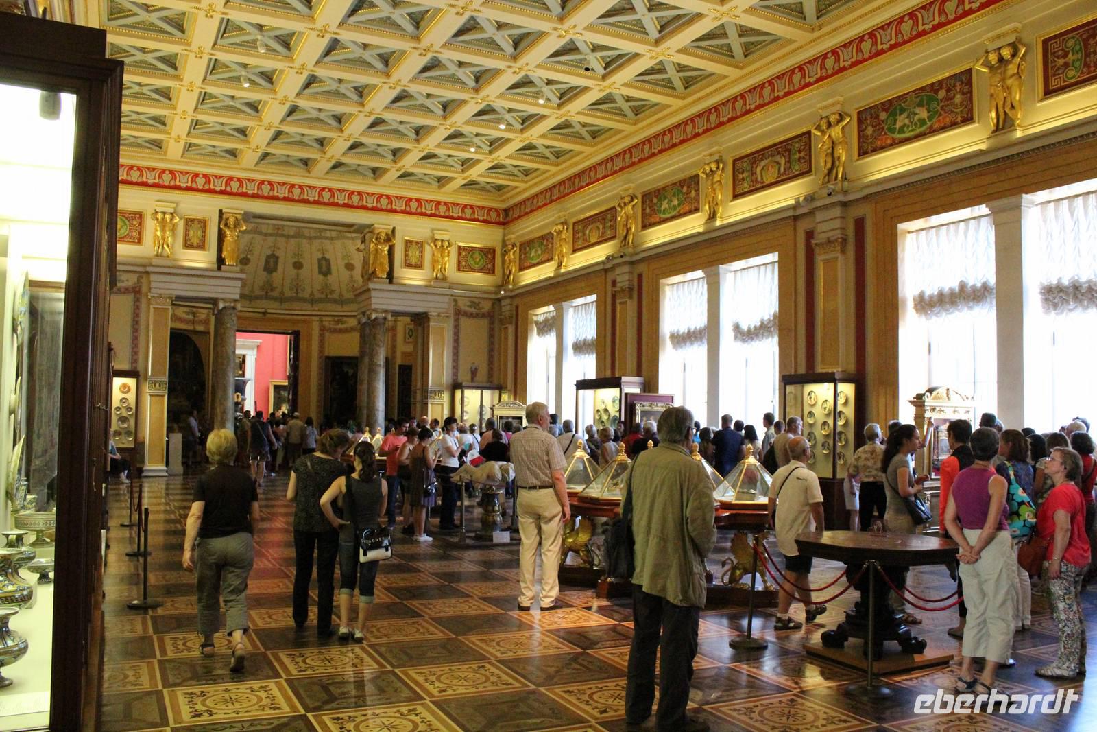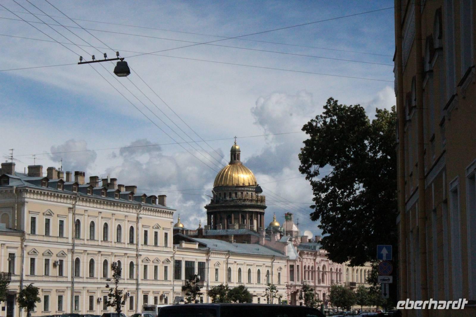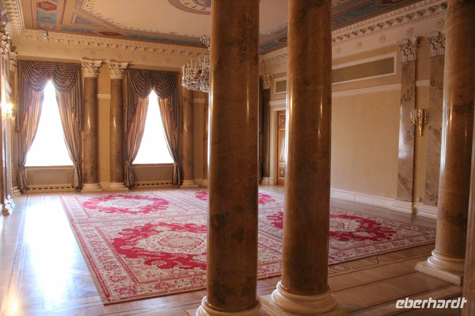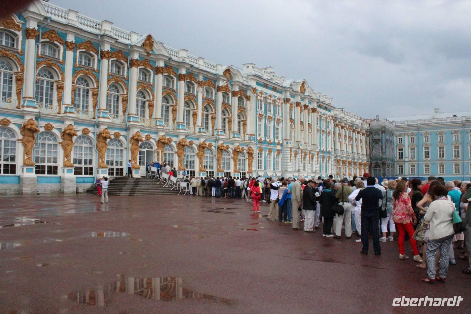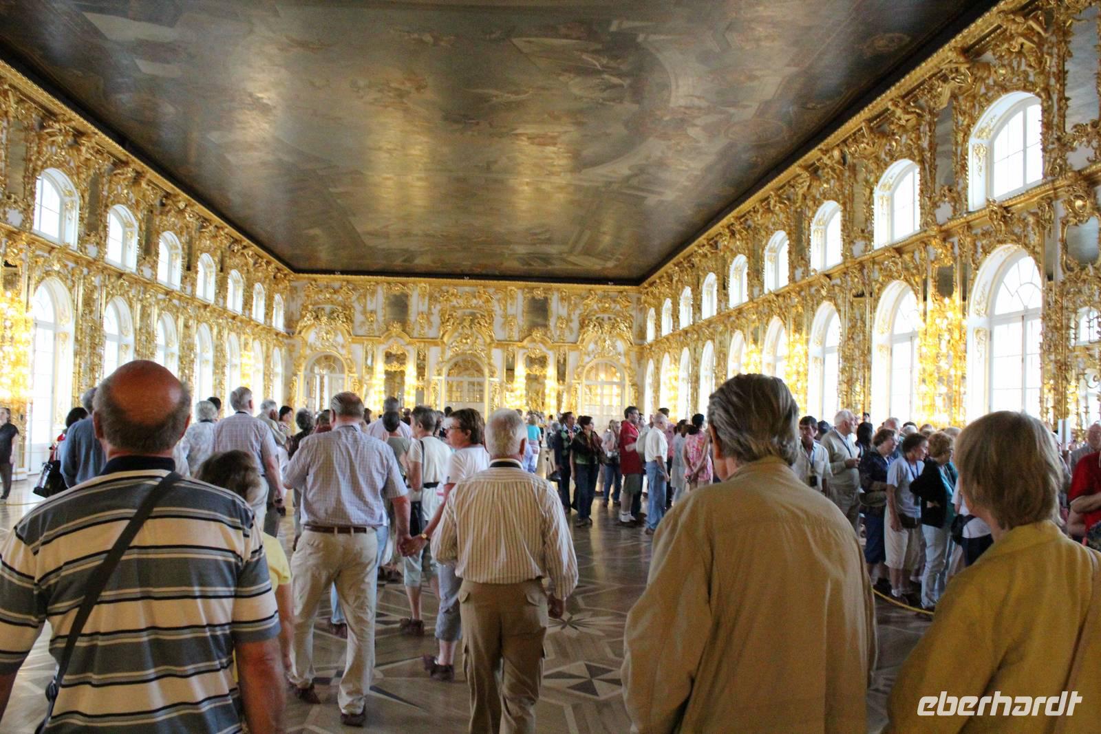 Heute ging es vom Hotel zu Fuß zur Isaakskathedrale, welche nur 10 Minuten vom Hotel entfernt lag. Die imposante Innengestaltung beeindruckte uns sehr. Die verzierten Türen, die Marmorfassaden und die Mosaikbilder ließen uns staunen. Weiter ging es danach mit dem Bus zur Blutskirche. Diese sieht von außen viel größer aus als es dann innen wirklich ist. In der Blutskirche wurde jedes Bild aus Mosaiken gefertigt und nicht gemalt. Mit großem Glück blieb diese Kirche im Krieg zum größten Teil unbeschädigt und Stalins Befehl, diese Kirche abzutragen, wurde nie durchgeführt. Nach einer längeren Pause auf der wichtigsten Geschäftsstraße, dem Newski Prospekt, ging es dann zum Katharinenpalast. Der lang gestreckte Bau mit einer schlichten aber doch sehr pompösen Fassade ließ die Gedanken schon spielen, wie es nur in den Räumen aussehen mochte. Und es blieb nichts aus. Ein großer Saal, welcher mit unzähligen Spiegeln ausgestattet war, um den Raum größer und heller in Erscheinung treten zu lassen, dazu noch eine sehr große und aufwendige Deckengestaltung. Dies war nur der erste Raum.