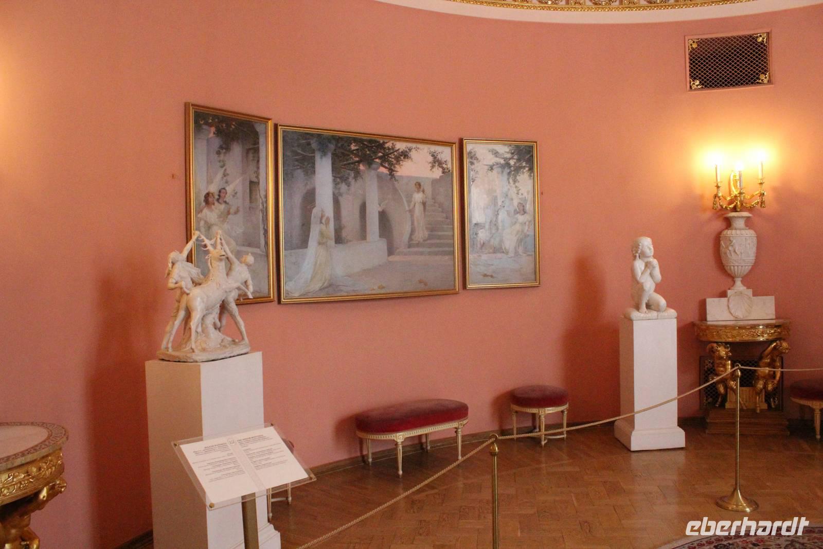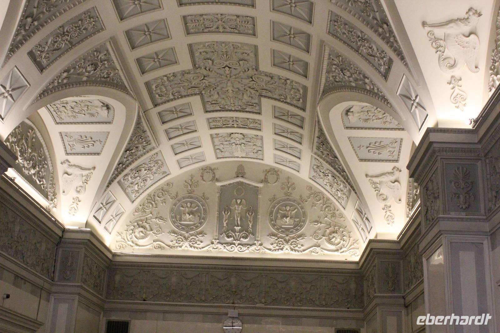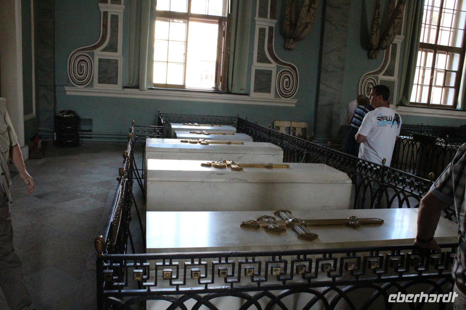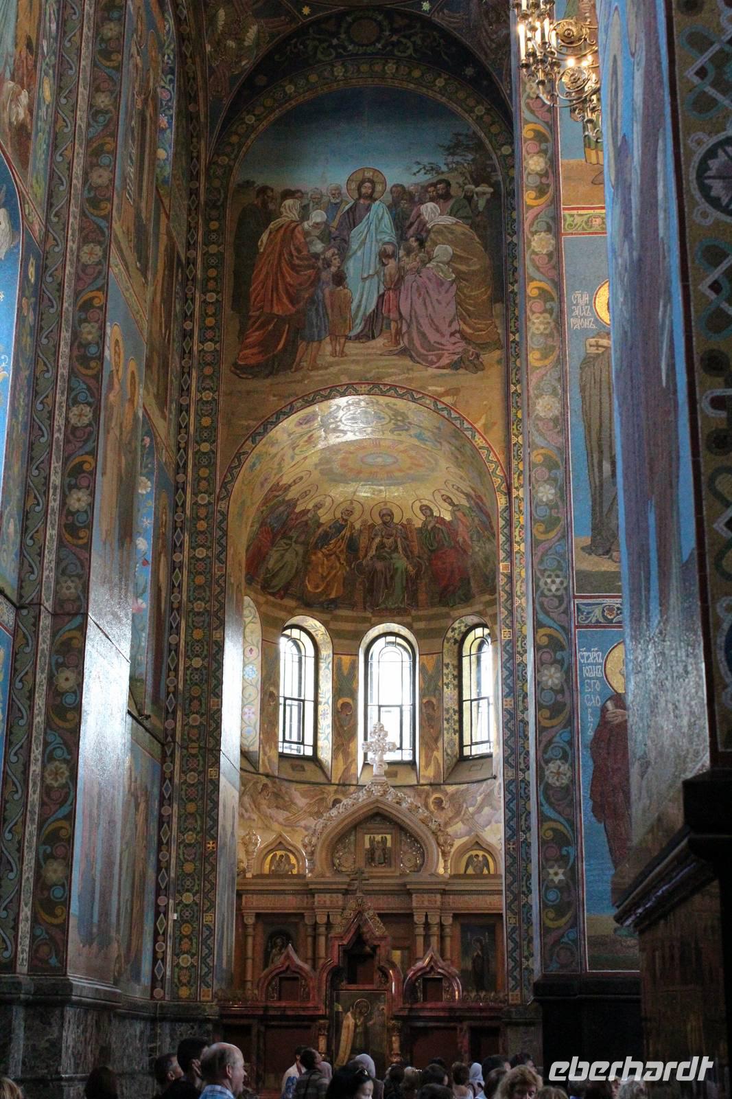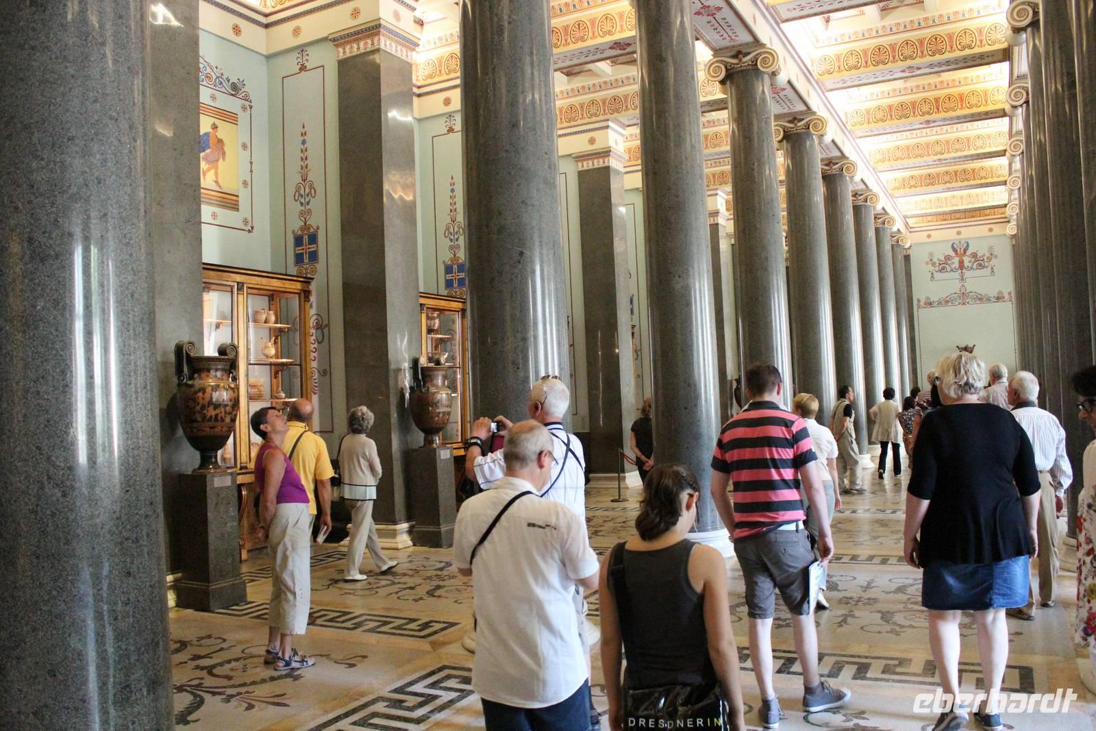Heute ging es vom Hotel zu Fuß zur Isaakskathedrale, welche nur 10 Minuten vom Hotel entfernt lag. Die imposante Innengestaltung beeindruckte uns sehr. Die verzierten Türen, die Marmorfassaden und die Mosaikbilder ließen uns staunen. Weiter ging es danach mit dem Bus zur Blutskirche. Diese sieht von außen viel größer aus als es dann innen wirklich ist. In der Blutskirche wurde jedes Bild aus Mosaiken gefertigt und nicht gemalt. Mit großem Glück blieb diese Kirche im Krieg zum größten Teil unbeschädigt und Stalins Befehl, diese Kirche abzutragen, wurde nie durchgeführt. Nach einer längeren Pause auf der wichtigsten Geschäftsstraße, dem Newski Prospekt, ging es dann zum Katharinenpalast. Der lang gestreckte Bau mit einer schlichten aber doch sehr pompösen Fassade ließ die Gedanken schon spielen, wie es nur in den Räumen aussehen mochte. Und es blieb nichts aus. Ein großer Saal, welcher mit unzähligen Spiegeln ausgestattet war, um den Raum größer und heller in Erscheinung treten zu lassen, dazu noch eine sehr große und aufwendige Deckengestaltung. Dies war nur der erste Raum.