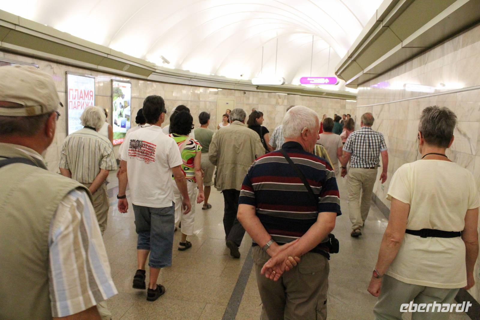 Heute ging es nach dem Frühstück um 9 Uhr mit dem Bus zu einer langen Stadtrundfahrt los. Wir sahen unter Anderem bei mehreren Fotostops die Blutskirche, den Isaak-Platz, viele Denkmäler, die Auroa und zahlreiche Brücken. Gegen Mittag besichtigten wir dann die Peter-und-Pauls-Kathedrale, wo die Zarenfamilie begraben ist. Hier hatten wir die Gelegenheit, einen Sängerchor einmal in voller Kunst anhören zu können. Nach einer Mittags- und Kaffeepause, fuhren wir zur St. Petersburger Metro. Bevor wir zu den U-Bahn Stationen gelangten, ging es über 60m tief unter die Erde. Wir fuhren ein paar Stationen, darunter auch auf dem ältesten Streckenabschnitt, welcher 1955 eingeweiht worden war. Einige U-Bahnstationen waren wunderschön dekoriert. Als nächstes gingen wir noch auf den Markt, wo einige von uns etwas feilschen konnten. Mit dem Bus ging es danach zum Hotel.