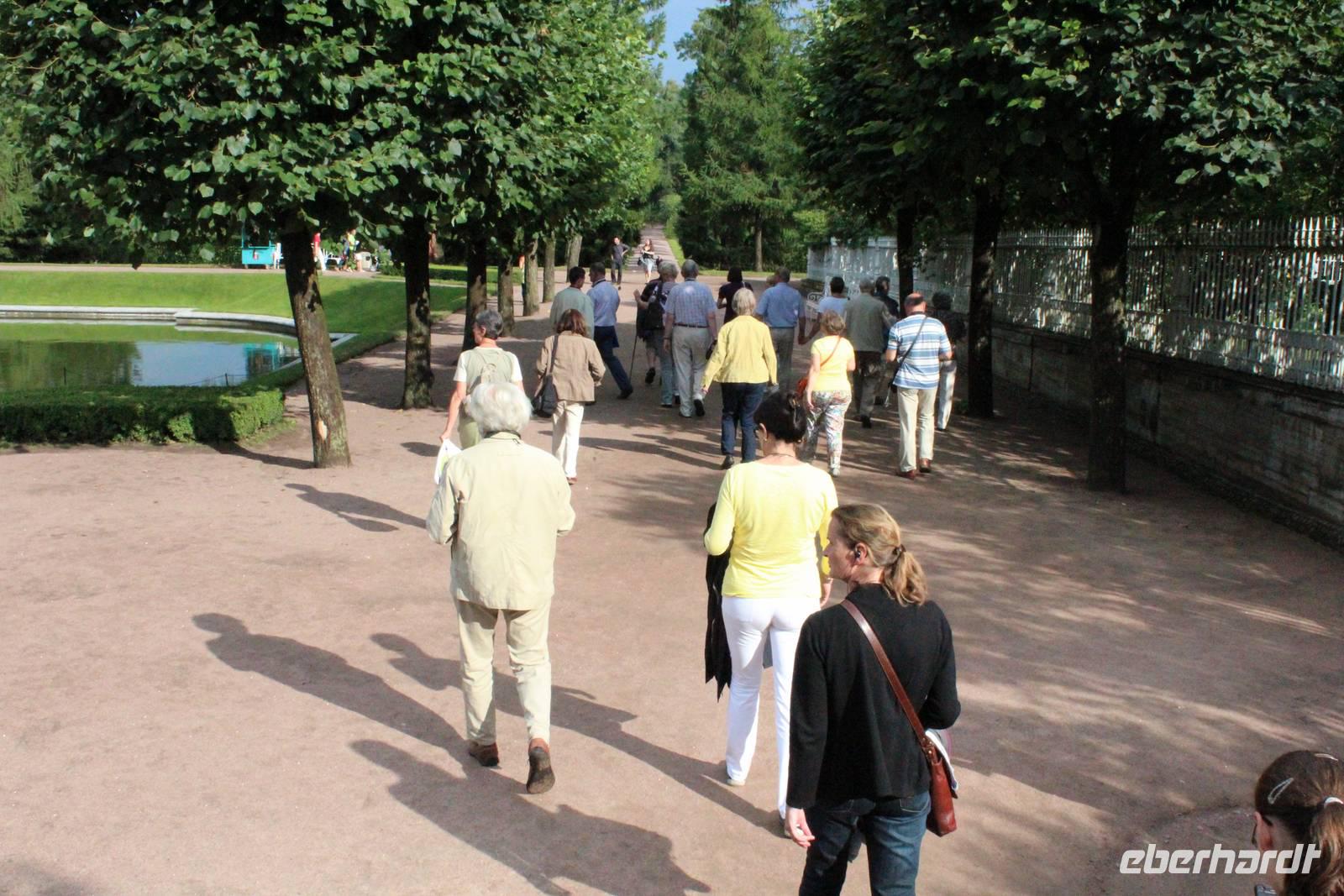 Es folgte das Bernsteinzimmer in der Mitte des Katharinenpalasts, welches originalgetreu dem Original nachgebaut worden war. Nach der Besichtigung der Räume ging es noch bei Sonnenschein in den Garten des Palastes wo es noch viele schöne Bilder zu machen gab. Da sich die Gelegenheit bei einem schönem Fotomotiv bot, machten wir hier unser Gruppenfoto. Der Tag endete in einem Restaurant, in welchem wir unser Abendessen bei Wasser, Wein und Wodka genossen. Der Restaurantbesuch wurde mit russischer Folklore abgerundet. Gegen 22:30 Uhr waren wir dann im Hotel, wo wir den Tag Revue passieren ließen.