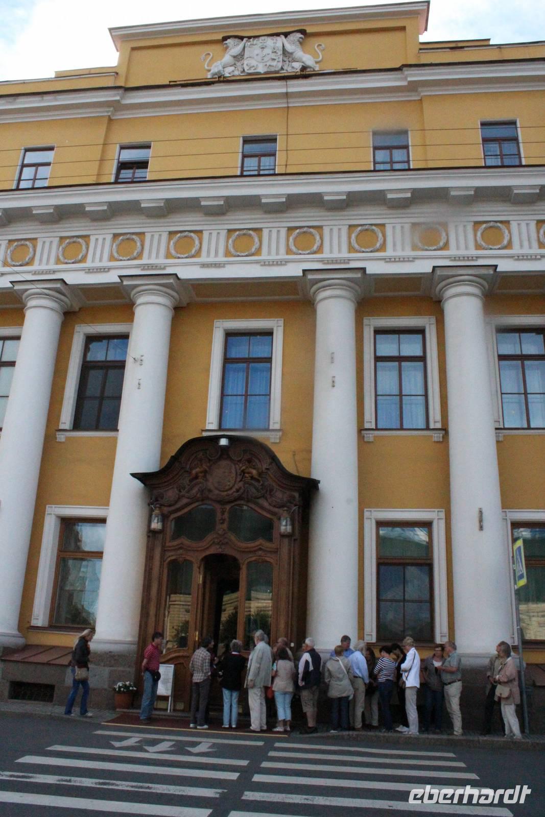Nach diesem hatte unser Reisebegleiter noch eine Überraschung, bevor es durch die Sicherheitskontrolle ging. Wir gingen gemeinsam zum MARCHÉ und wurden zu einer Kleinigkeit zu Essen und Trinken eingeladen. Als wir gesättigt waren ging es dann aber durch die Sicherheitskontrolle und in unser Flugzeug. Nach gut 2h Flugzeit landeten wir in St. Petersburg, wo wir nach ca. einer Stunde die Sicherheitskontrolle alle passiert hatten und außerhalb auf unsere örtl. Reiseleiterin Natalia trafen. Zusammen mit ihr fuhren wir zu unserem Hotel „Petro Palace" und ließen diesen Abend bei einem tollen Abendessen ausklingen.