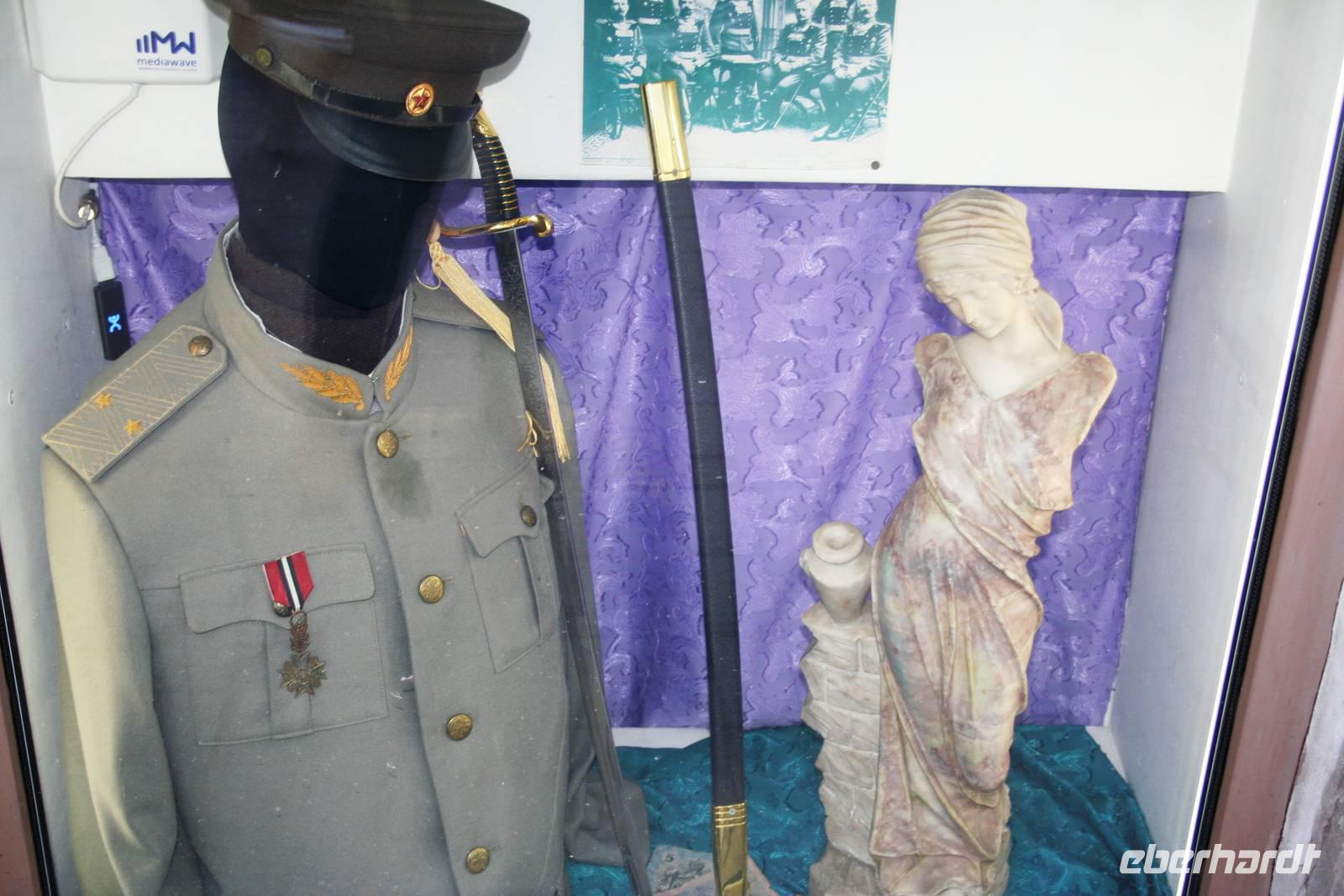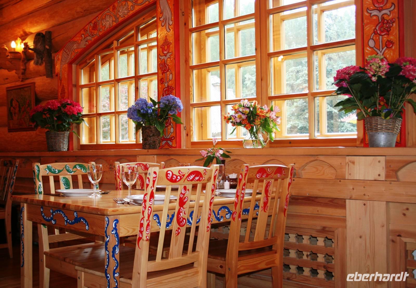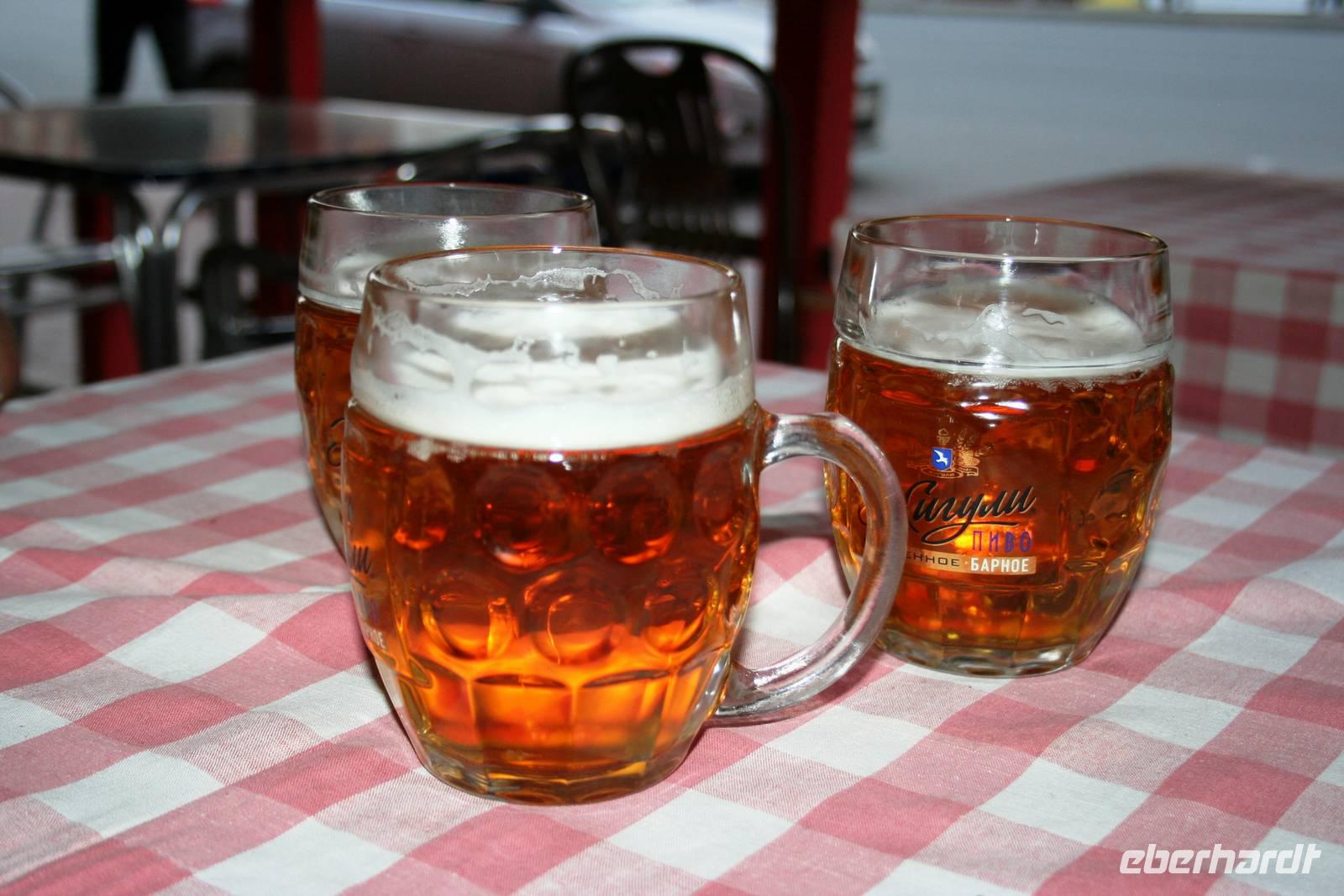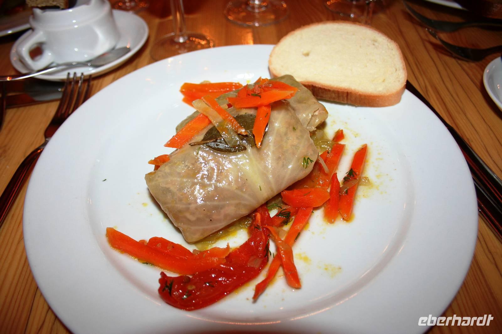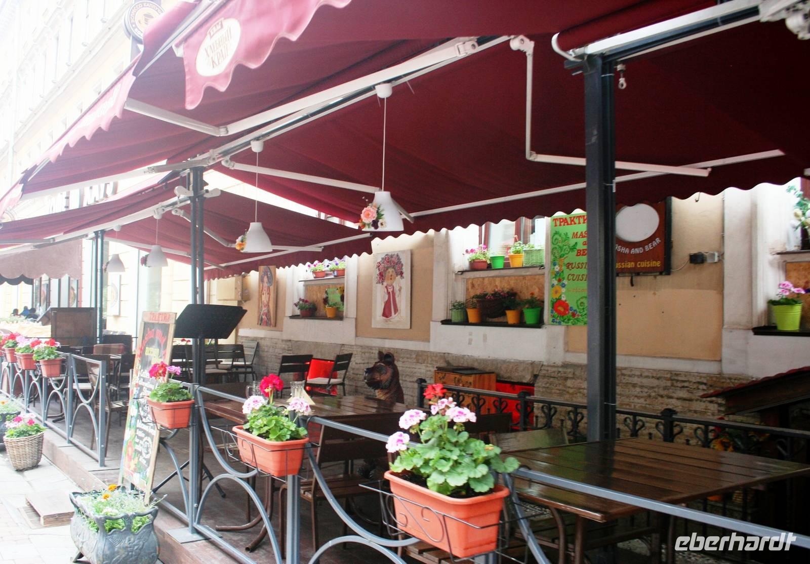 Nach so viel Prunk - auf zum Trunk ins "Podvorie" (Bauernhof), unweit von Puschkin. In dem in der typischen Holzarchitektur erbauten Restaurant ist Wladimir Putin auch gern zu Gast, aber heute waren wir dran. An einer rustikal gedeckten Tafel nahmen wir Platz und russische Speisen folgten: Brot, sauer Eingelegtes mit Knoblauch, russische Eier, delikate Dips, natürlich Bortsch mit Smetana und Krautwickel a la "Babuschka". Bei russischer Folklore, Wein und Gesang und dem berühmten Wässerschen, Wodka genannt kam gute Stimmung auf und die Zeit verging wie im Flug. Beim netten Personal bedankte sich der Eberhardt-Chor mit einem Medley deutschen Liedgutes. Ein schöner Abschluss für den letzten Abend unserer Reise.