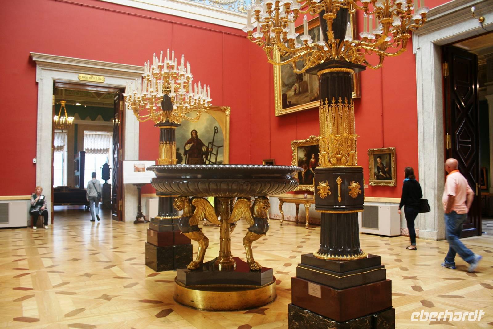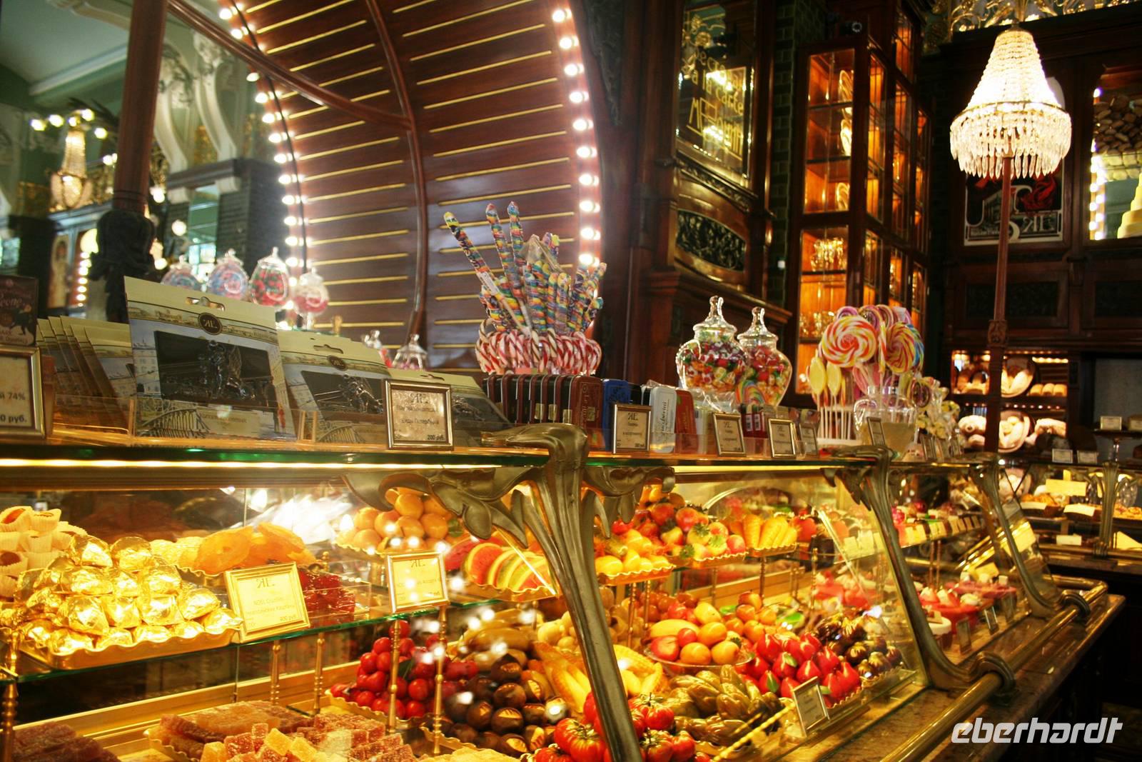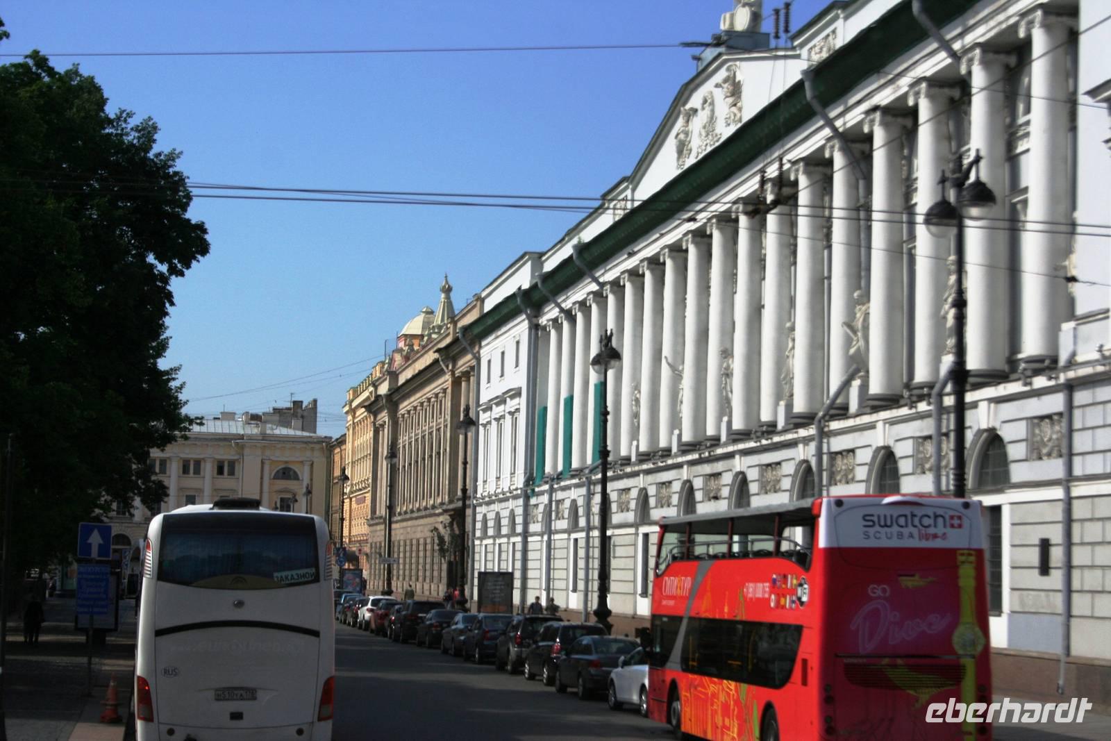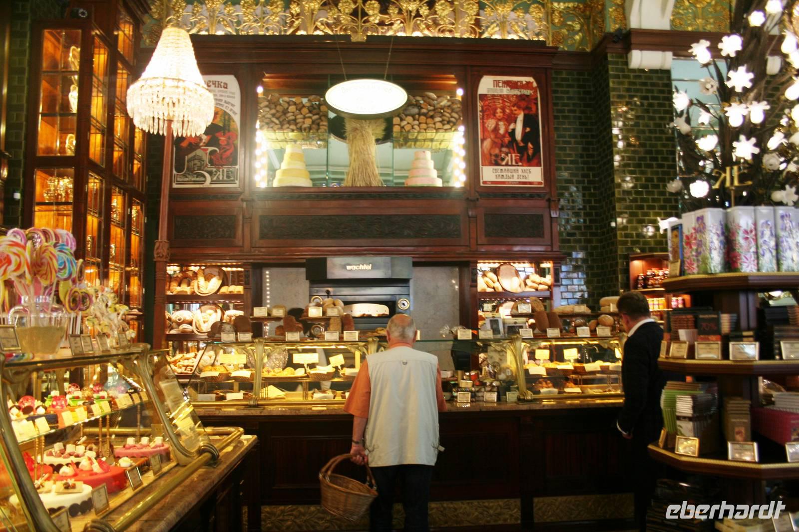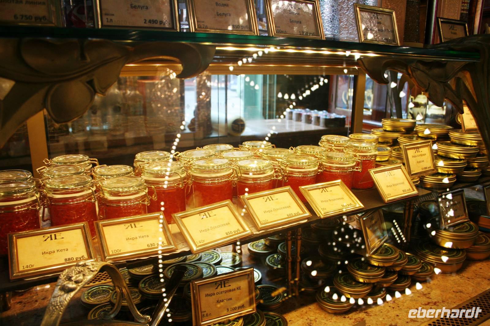 Die Nacht war lang und so waren wir froh, heute ausschlafen zu können. Aufgrund der zentralen Lage unseres Hotels war es nur ein kurzer Weg zum Schlossplatz. Die Sonne hatte sich heute versteckt, aber das störte uns nicht. Wir freuten uns auf den Besuch eines der berühmtesten und größten Kunstmuseen der Welt: die Eremitage. Das riesige Museumskomplex erstreckt sich über die Gebäude des Winterpalais, der alten und neuen Eremitage, d.h. ca. 350 Räume und Säle mit mehr als 60.000 Ausstellungsstücken. Unsere Gruppe war bereits angemeldet und so gelangten wir ohne Wartezeit durch den Kommandanteneingang ins Innere. Igor brillierte wieder einmal mit seinem unerschöpflichen Wissen und führte uns durch das Labyrinth von prunkvollen Sälen und Gängen. Wir bestaunten wertvolle Kunstgegenstände und Gewänder aus alter Zarenzeit, Möbel, die Pfauenuhr und natürlich die berühmten Gemälde von Da Vinci und Rembrandt. Besonders gespannt waren wir auf die Gemälde von Canaletto, ein Stück bekannte Heimat in St. Petersburg. Nach über 3 h beeindruckendem Kunstgenuss und ca. 4,5 km in den Beinen trafen wir uns am Ausgang wieder. Nun hatten wir uns eine Pause redlich verdient. In der kleinen Gartenstraße (Fußgängerzone) am Newsky Prospekt laden viele Cafes und Restaurants zum Verweilen ein. An der Ecke befindet sich der Jelissejew Palast, wo sich im Erdgeschoss das exklusive Delikatessengeschäft befindet (früher Gastronom Nr. 1).