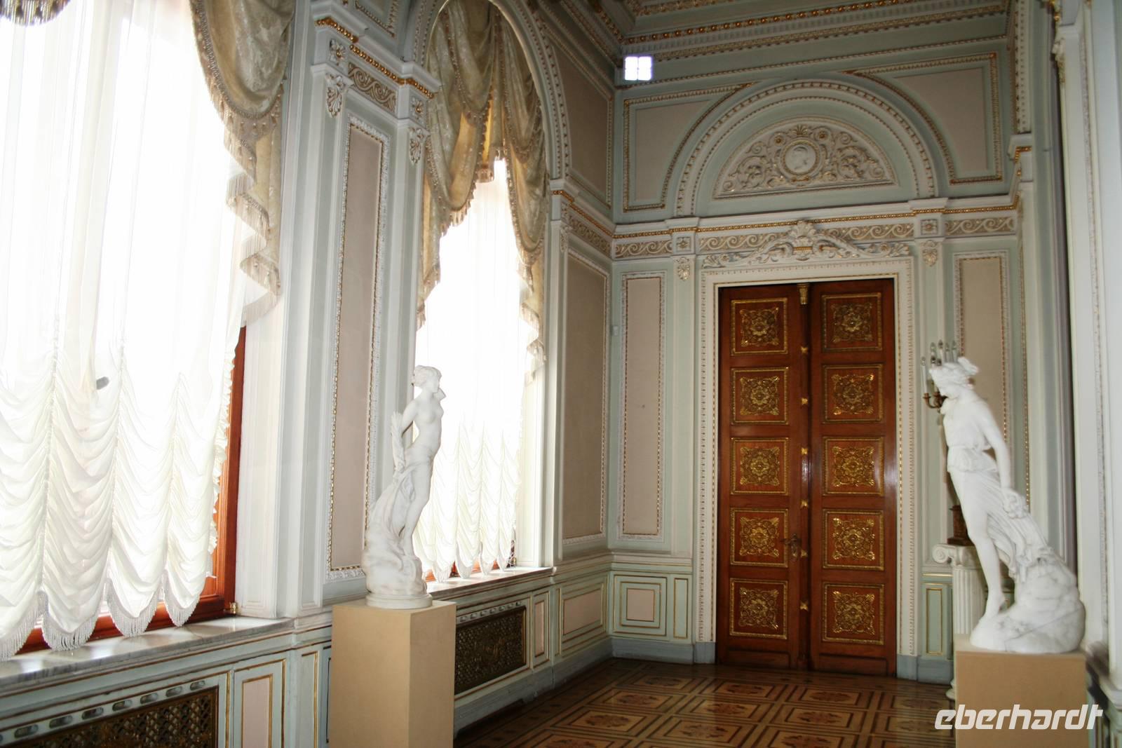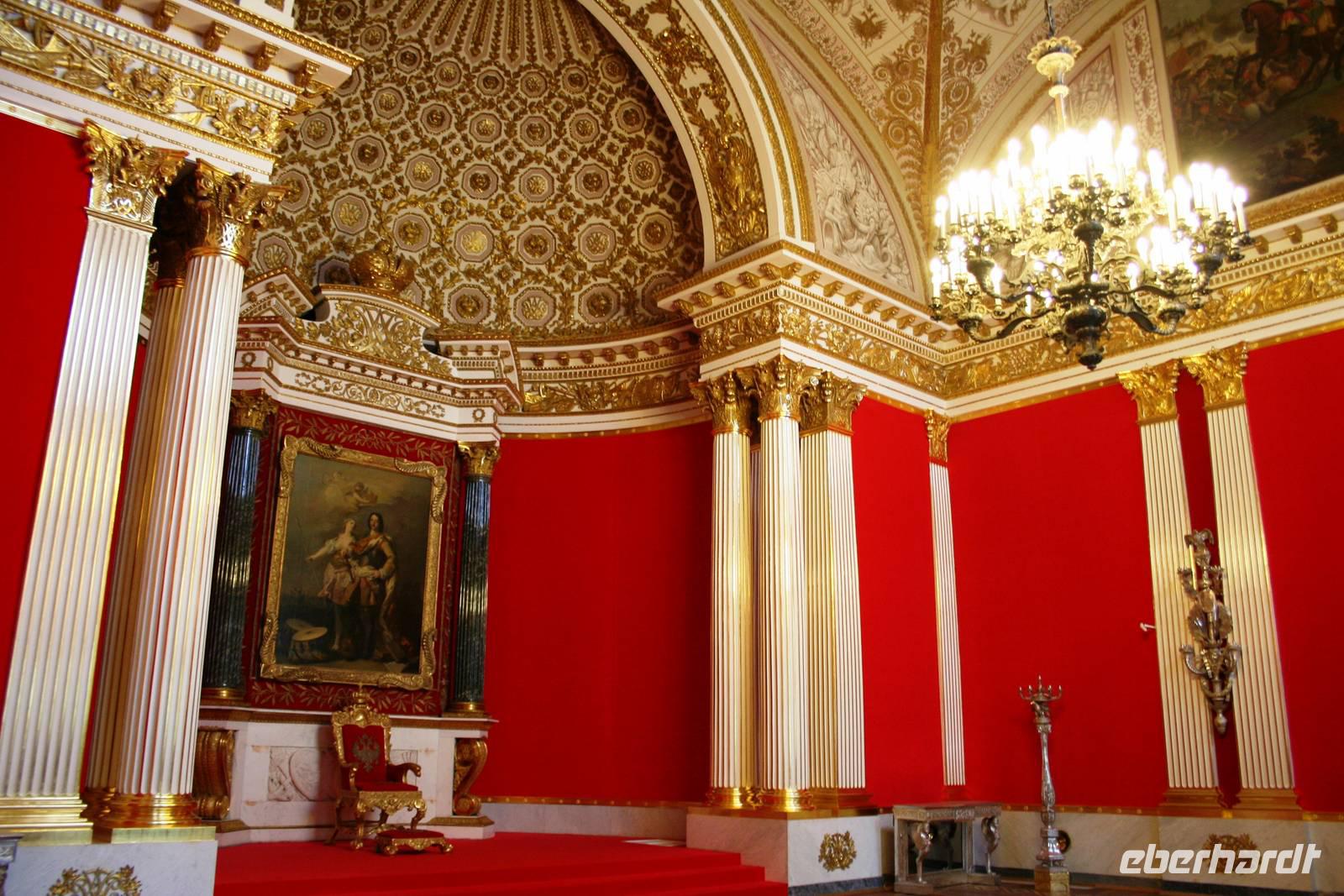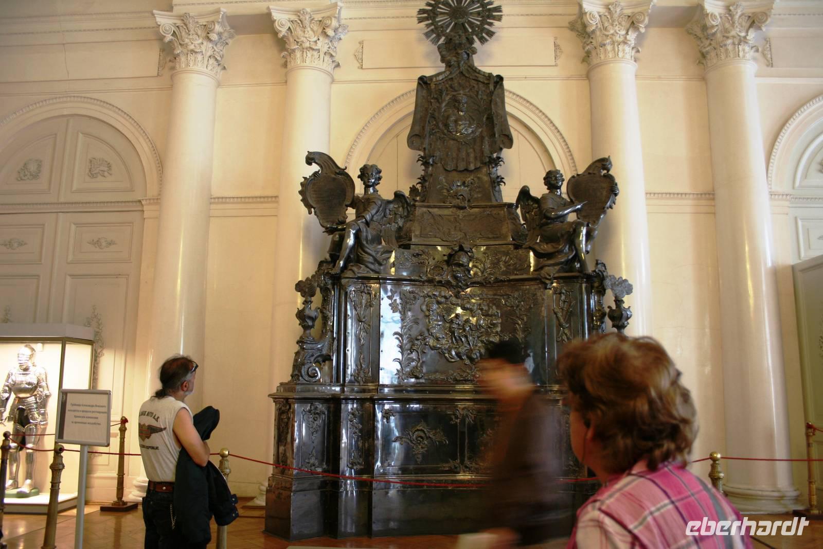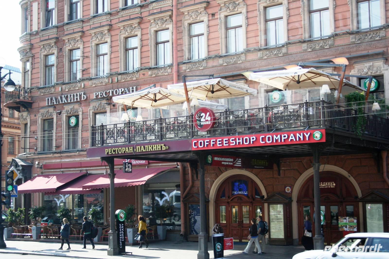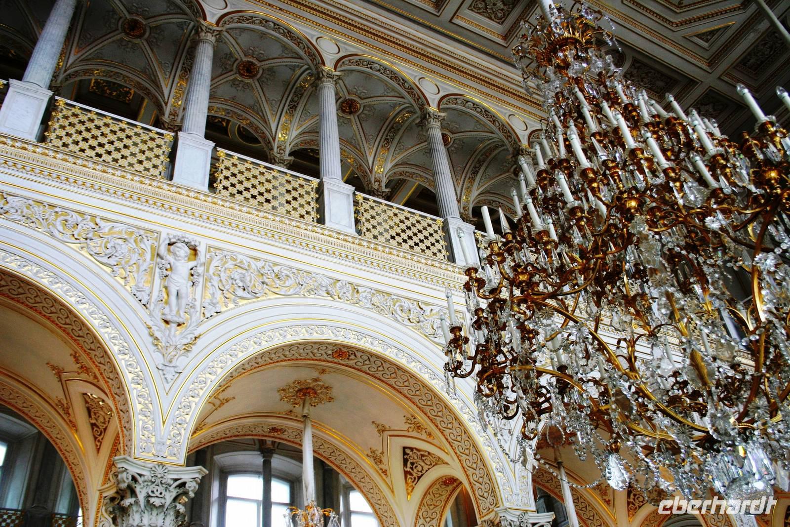 Die Nacht war lang und so waren wir froh, heute ausschlafen zu können. Aufgrund der zentralen Lage unseres Hotels war es nur ein kurzer Weg zum Schlossplatz. Die Sonne hatte sich heute versteckt, aber das störte uns nicht. Wir freuten uns auf den Besuch eines der berühmtesten und größten Kunstmuseen der Welt: die Eremitage. Das riesige Museumskomplex erstreckt sich über die Gebäude des Winterpalais, der alten und neuen Eremitage, d.h. ca. 350 Räume und Säle mit mehr als 60.000 Ausstellungsstücken. Unsere Gruppe war bereits angemeldet und so gelangten wir ohne Wartezeit durch den Kommandanteneingang ins Innere. Igor brillierte wieder einmal mit seinem unerschöpflichen Wissen und führte uns durch das Labyrinth von prunkvollen Sälen und Gängen. Wir bestaunten wertvolle Kunstgegenstände und Gewänder aus alter Zarenzeit, Möbel, die Pfauenuhr und natürlich die berühmten Gemälde von Da Vinci und Rembrandt. Besonders gespannt waren wir auf die Gemälde von Canaletto, ein Stück bekannte Heimat in St. Petersburg. Nach über 3 h beeindruckendem Kunstgenuss und ca. 4,5 km in den Beinen trafen wir uns am Ausgang wieder. Nun hatten wir uns eine Pause redlich verdient. In der kleinen Gartenstraße (Fußgängerzone) am Newsky Prospekt laden viele Cafes und Restaurants zum Verweilen ein. An der Ecke befindet sich der Jelissejew Palast, wo sich im Erdgeschoss das exklusive Delikatessengeschäft befindet (früher Gastronom Nr. 1).