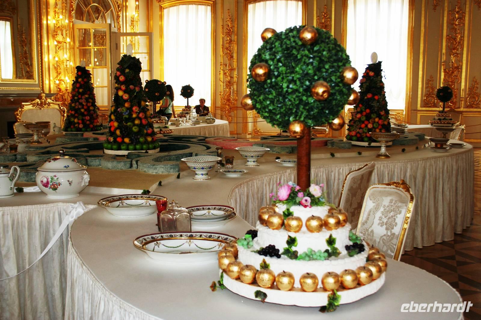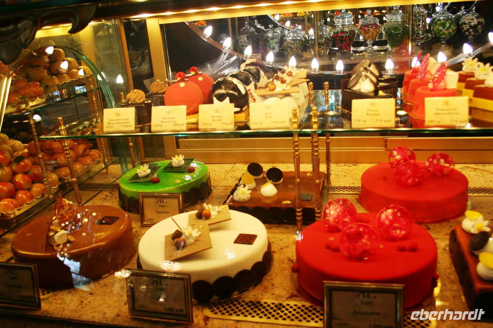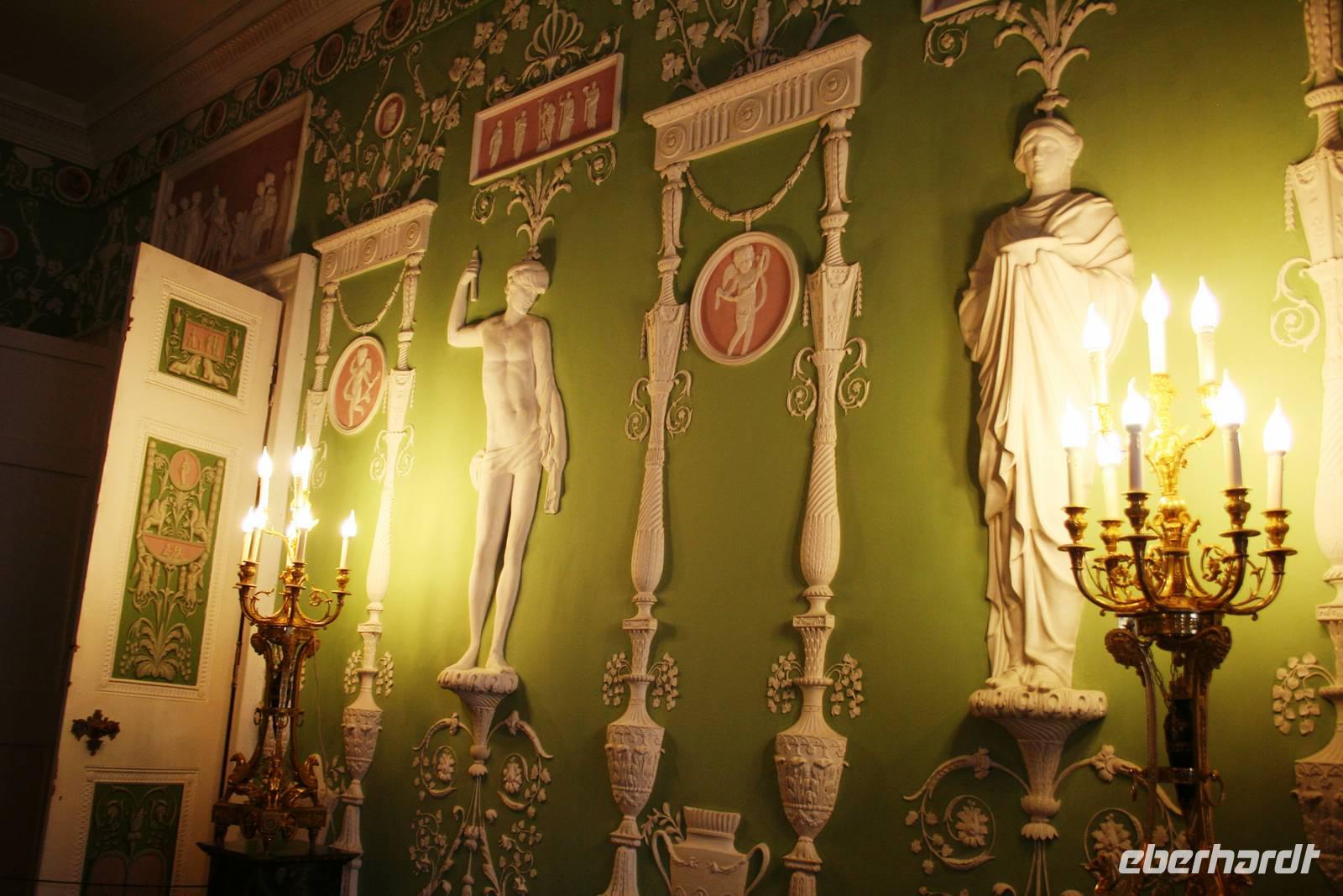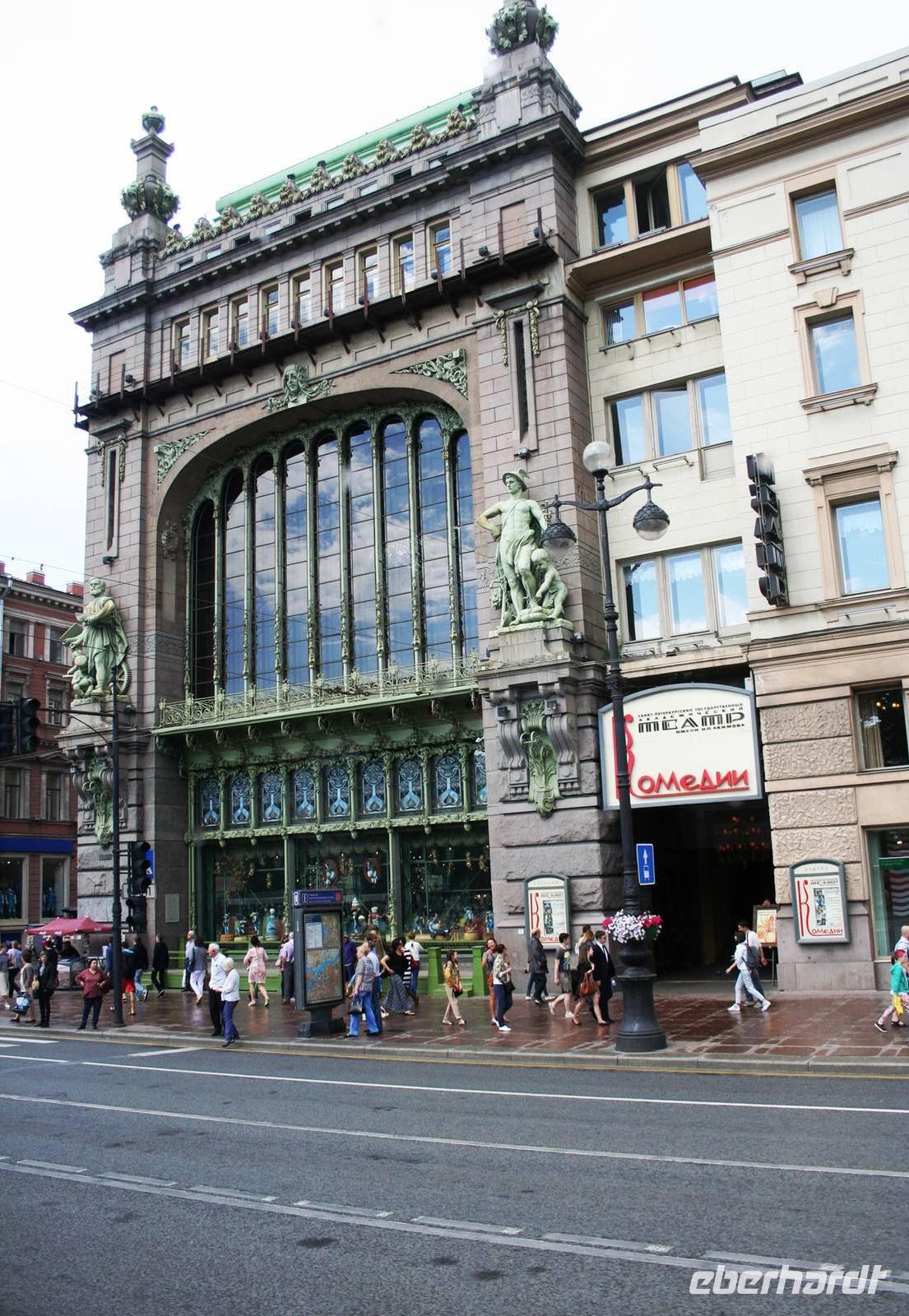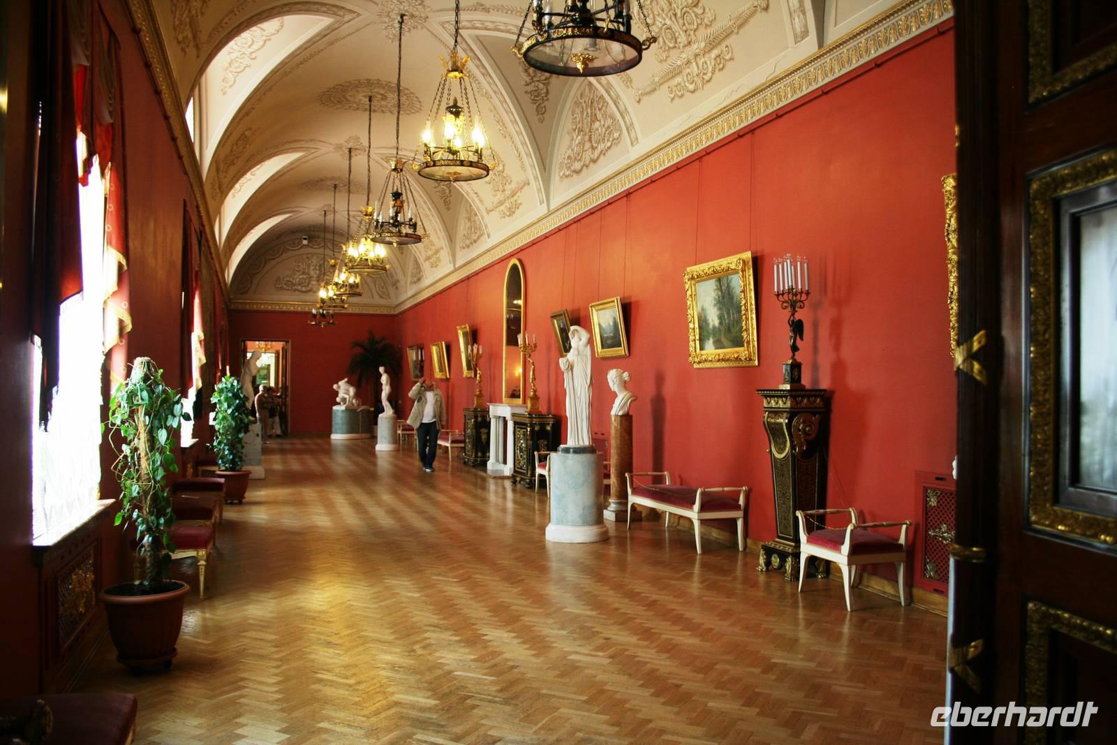 Die Nacht war lang und so waren wir froh, heute ausschlafen zu können. Aufgrund der zentralen Lage unseres Hotels war es nur ein kurzer Weg zum Schlossplatz. Die Sonne hatte sich heute versteckt, aber das störte uns nicht. Wir freuten uns auf den Besuch eines der berühmtesten und größten Kunstmuseen der Welt: die Eremitage. Das riesige Museumskomplex erstreckt sich über die Gebäude des Winterpalais, der alten und neuen Eremitage, d.h. ca. 350 Räume und Säle mit mehr als 60.000 Ausstellungsstücken. Unsere Gruppe war bereits angemeldet und so gelangten wir ohne Wartezeit durch den Kommandanteneingang ins Innere. Igor brillierte wieder einmal mit seinem unerschöpflichen Wissen und führte uns durch das Labyrinth von prunkvollen Sälen und Gängen. Wir bestaunten wertvolle Kunstgegenstände und Gewänder aus alter Zarenzeit, Möbel, die Pfauenuhr und natürlich die berühmten Gemälde von Da Vinci und Rembrandt. Besonders gespannt waren wir auf die Gemälde von Canaletto, ein Stück bekannte Heimat in St. Petersburg. Nach über 3 h beeindruckendem Kunstgenuss und ca. 4,5 km in den Beinen trafen wir uns am Ausgang wieder. Nun hatten wir uns eine Pause redlich verdient. In der kleinen Gartenstraße (Fußgängerzone) am Newsky Prospekt laden viele Cafes und Restaurants zum Verweilen ein. An der Ecke befindet sich der Jelissejew Palast, wo sich im Erdgeschoss das exklusive Delikatessengeschäft befindet (früher Gastronom Nr. 1).
