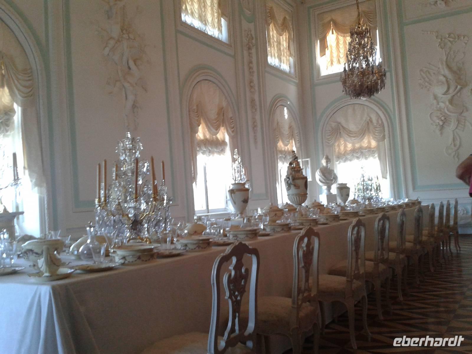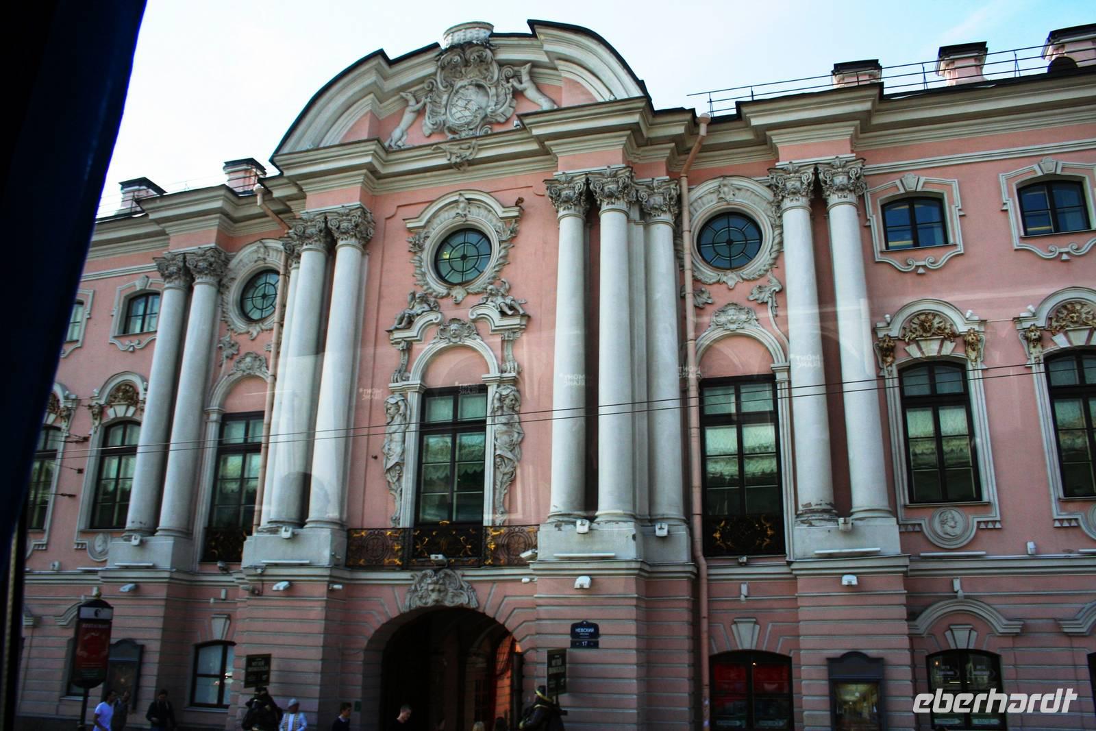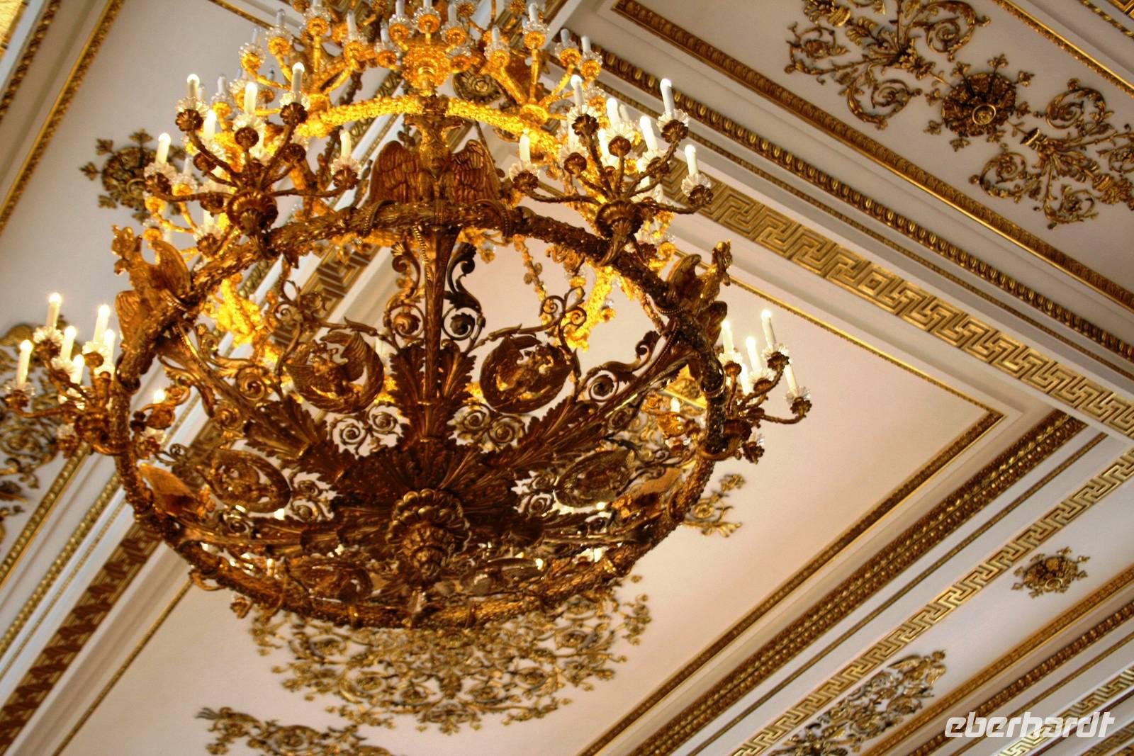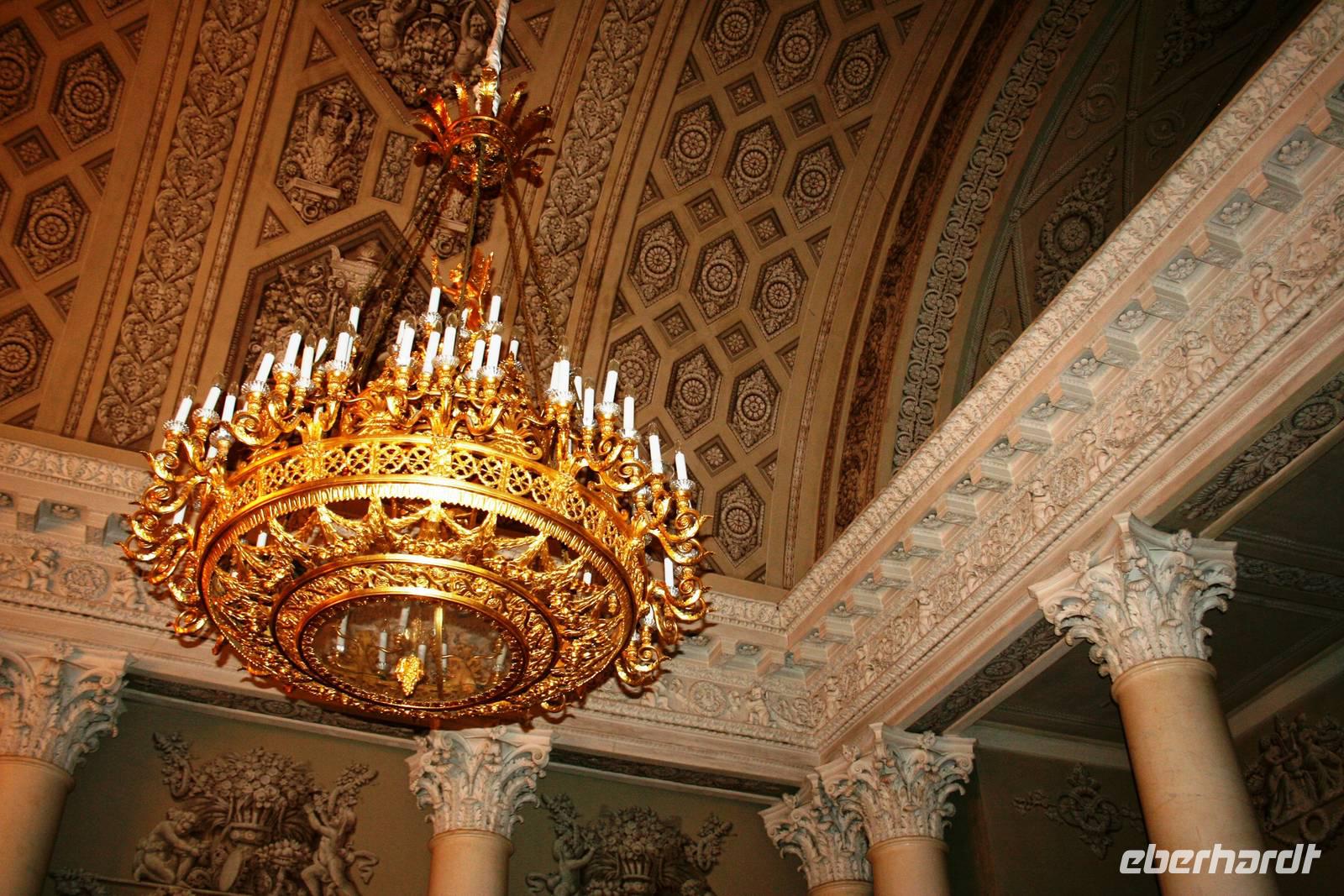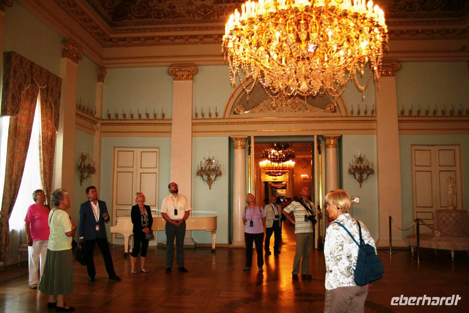 Am Vormittag besuchten wir einen der schönsten Adelspaläste der Stadt, den Jussupow-Palast. Die Familie Jussupow gehörte zu den reichsten Adelsfamilien und größten Kunst-Mäzenen der Stadt. Igor führte uns das Treppenhaus sowie die prunkvollen Räume des Palastes mit der Bibliothek, den Galerien und dem neobarocken kleinen Theater. Natürlich berichtete er uns vom Leben der Familie und der Ermordung des Wunderheilers Rasputin in diesem Palast. An der Galeriewand der exklusiven Gäste des Palastes war neben dem Foto von der englischen Queen noch Platz, den wir gleich für unser Eberhardt-Foto reservierten. Nach dieser interessanten Führung fuhren wir zum Isaaks-Platz, wo die meisten Gäste im Cafe "Glück" einen süßen oder gesunden Mittagssnack verspeisten oder auch nur bei einem Kaffee den Blick auf die Isaaks-Kathedrale genossen.