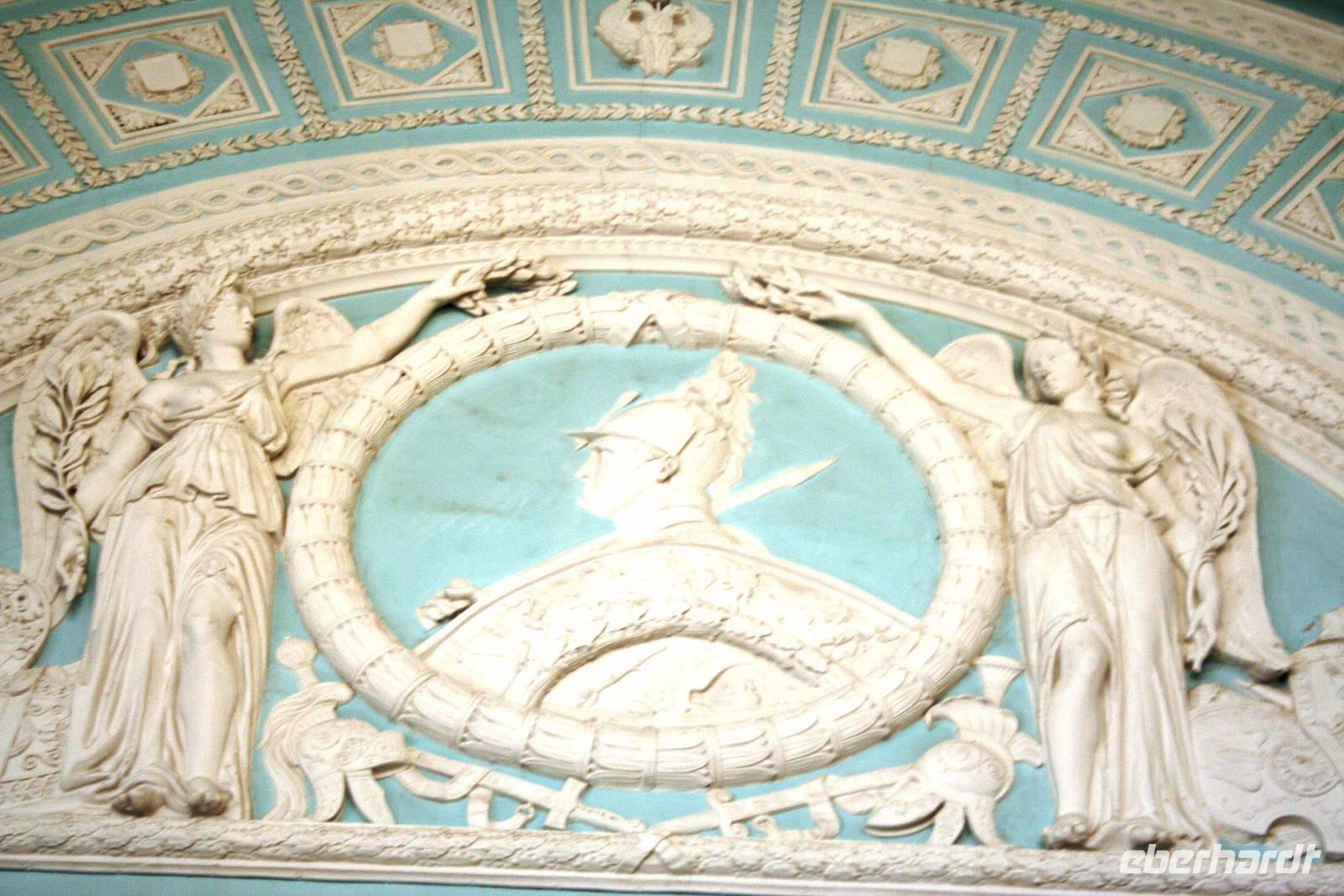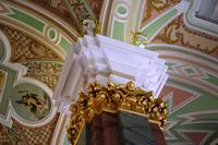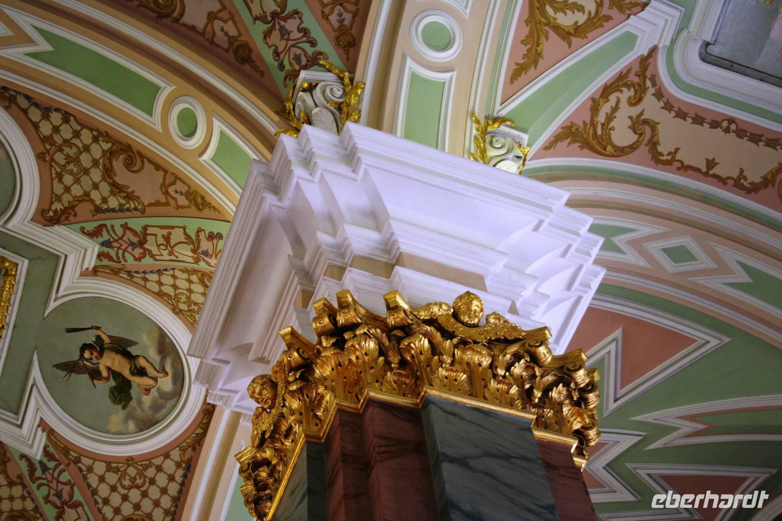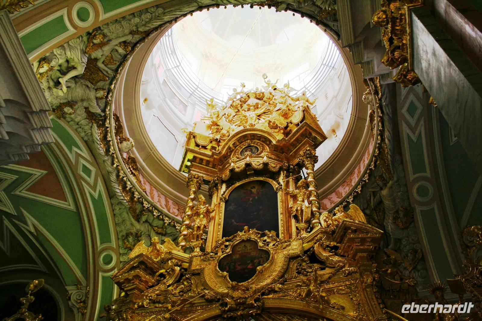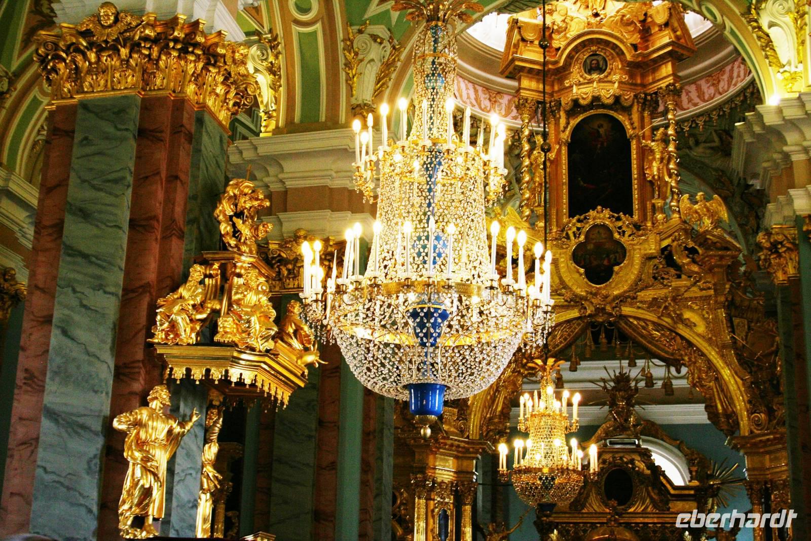 Nach einem letzten Frühstück im Hotel fuhren wir der monumentalen Isaaks-Kathedrale, einer der größten Kuppelkirchen der Welt. Die Kirche ist 111 Meter lang, 97 Meter breit und 101,50 Meter hoch. Da der Boden hier, fast am Newa-Ufer, sumpfig war, steht der gewaltige Bau auf 24.000 Pfählen und tonnenschweren eisernen Rahmen. Unvorstellbar, dass diese durch Muskelkraft von Tausenden Leibeigenen bewegt wurden. Igor zeigte uns an einem Modell, wie die 112 Granitsäulen in der Halle aufgestellt wurden. Diese tragen Dach und Kuppel der Kathedrale. 14.000 Menschen konnten in der prachtvollen Kirche am Gottesdienst teilnehmen. Wir standen ehrfurchtsvoll in der Mitte unter der großen Kuppel und staunten zugleich über die prachtvolle Ausstattung mit Mosaiken und vergoldeten Simsen und Portalen. Herausragende Kunstwerke sind das bronzene Zarentor und das große Glasfenster des Altarraumes. Nur eins fehlte aus früheren Zeiten: das 91 Meter lange Foucaultsche Pendel in der Kuppel, in der der heilige Geist in Form einer Taube nun keinen "Bodenkontakt" mehr hat.