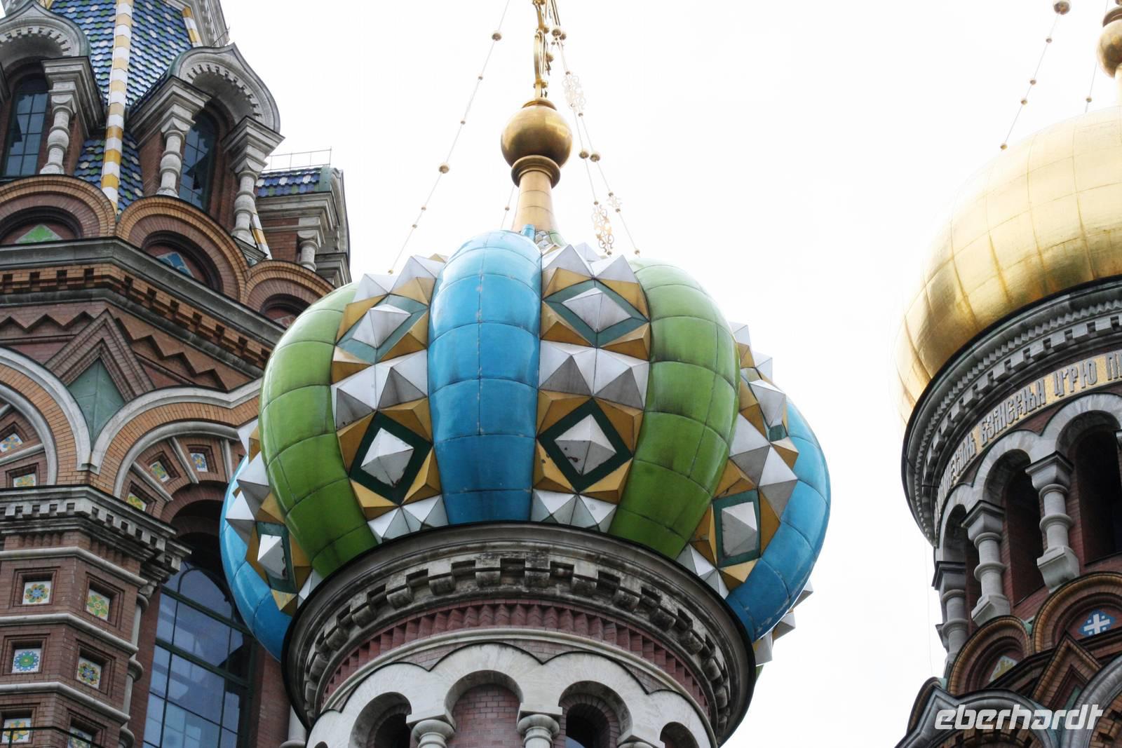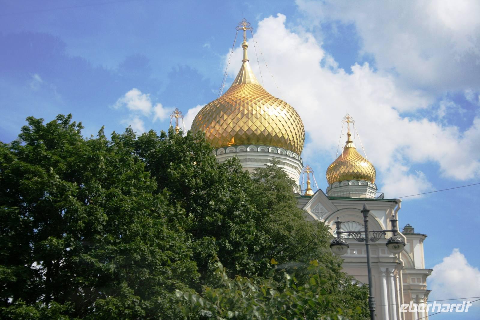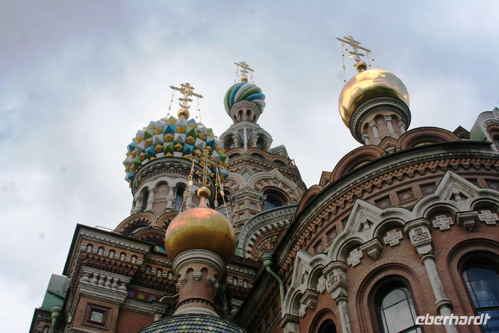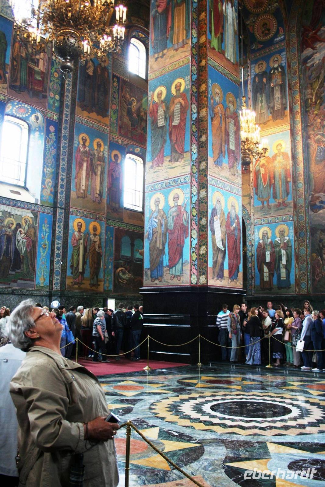 Danach fuhren wir zur Christi-Auferstehungskirche „Auf dem Blute". Sie steht an jener Stelle, wo 1881 ein Attentat auf den Zaren Alexander II. verübt wurde. Die Kirche erinnert von außen an die Moskauer Basilius-Kathedrale. Auch im Inneren ist sie mit den meisterhaften Mosaiken in großer Fülle altrussisch ausgestattet. Wie ein Puzzle wurden Millionen farbiger Mosaiksteine zu meisterhaften, riesigen Bildern und Wanddekors zusammen gesetzt.