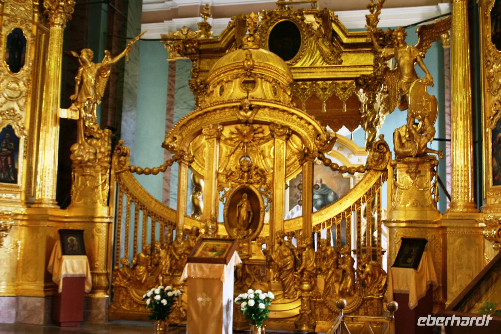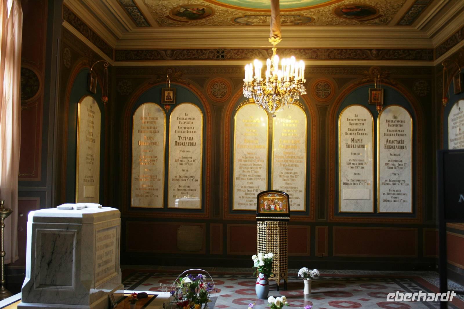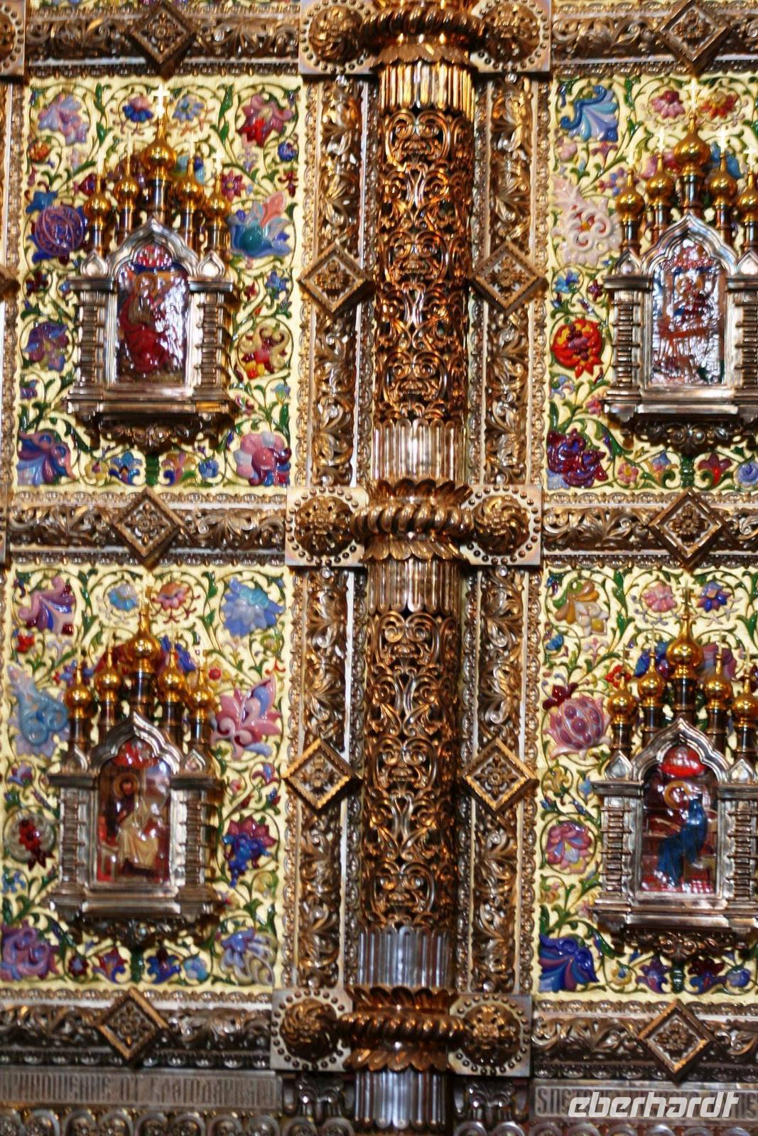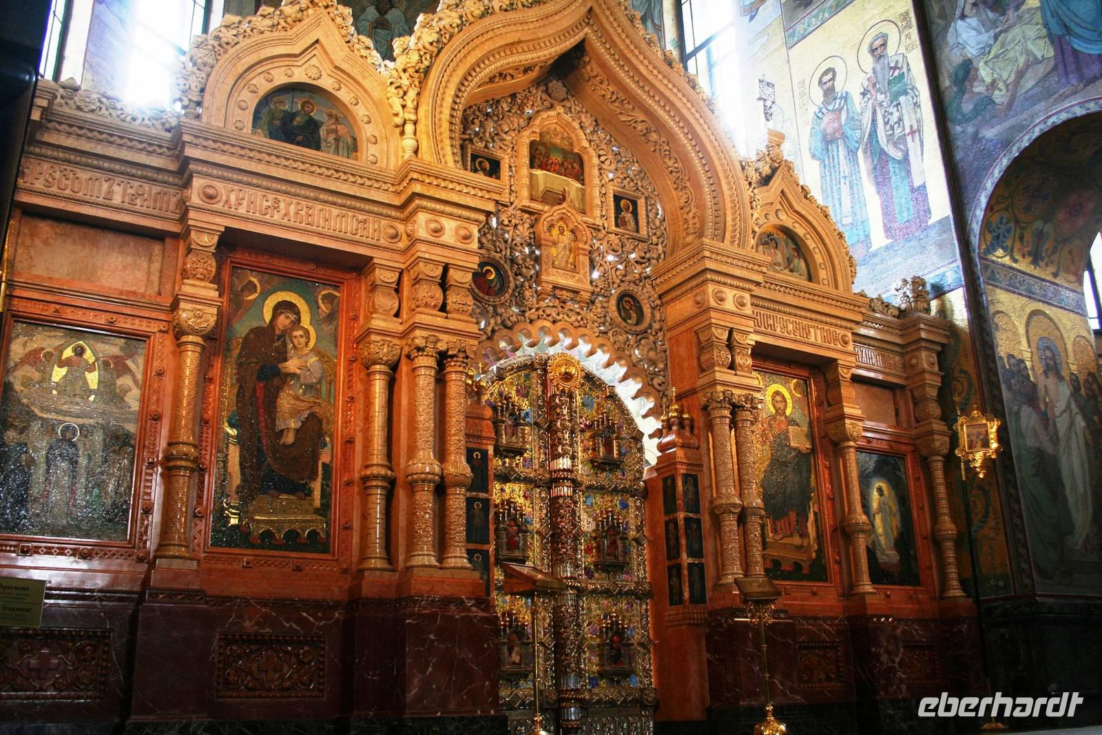 Danach fuhren wir zur Christi-Auferstehungskirche „Auf dem Blute". Sie steht an jener Stelle, wo 1881 ein Attentat auf den Zaren Alexander II. verübt wurde. Die Kirche erinnert von außen an die Moskauer Basilius-Kathedrale. Auch im Inneren ist sie mit den meisterhaften Mosaiken in großer Fülle altrussisch ausgestattet. Wie ein Puzzle wurden Millionen farbiger Mosaiksteine zu meisterhaften, riesigen Bildern und Wanddekors zusammen gesetzt.