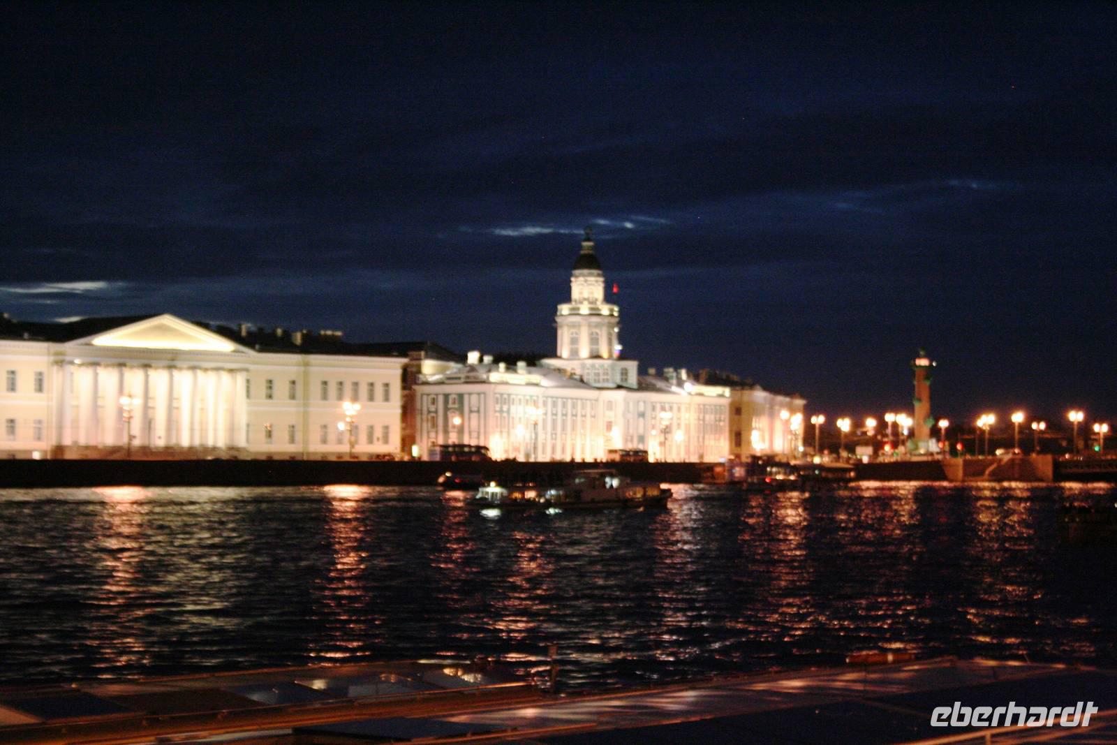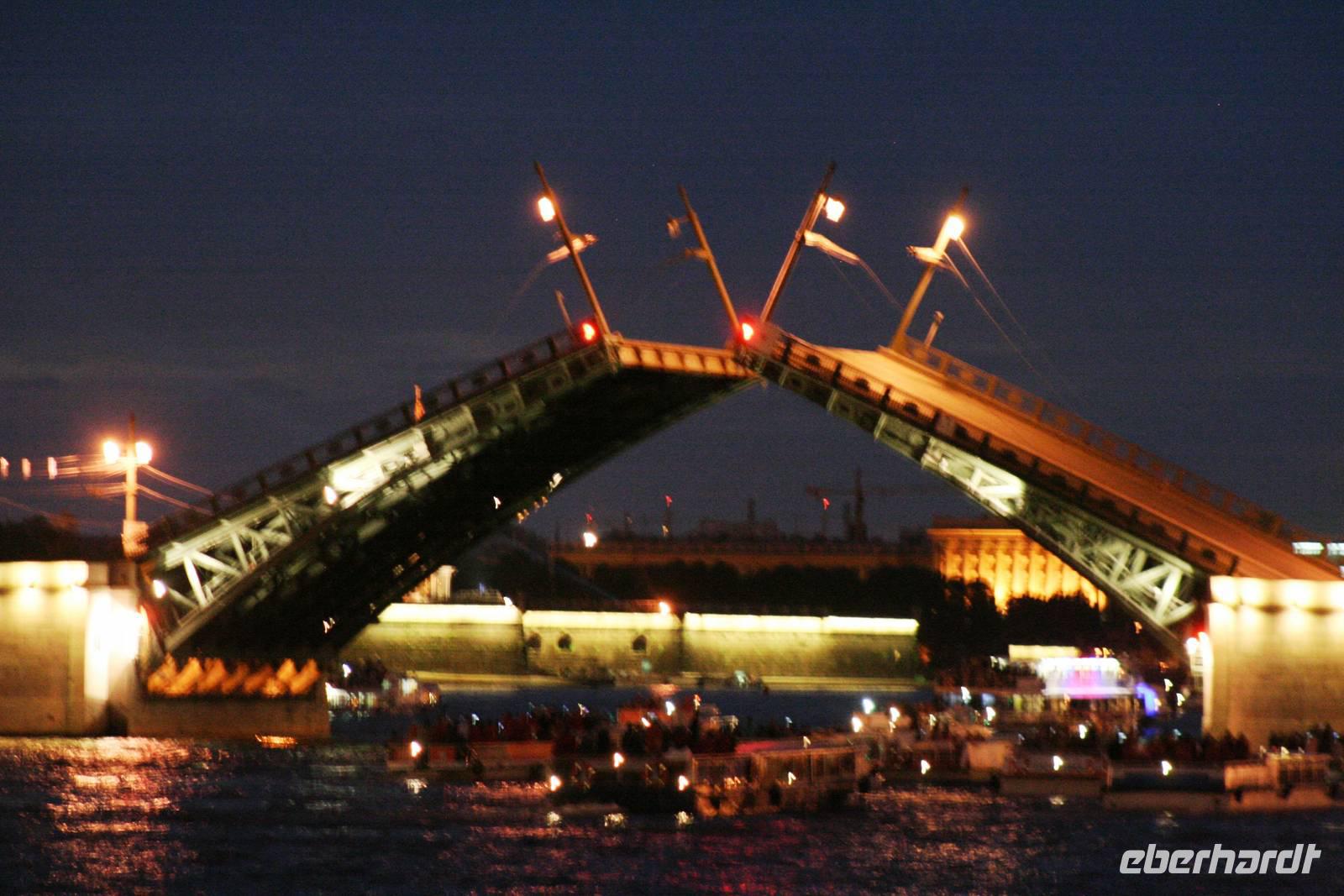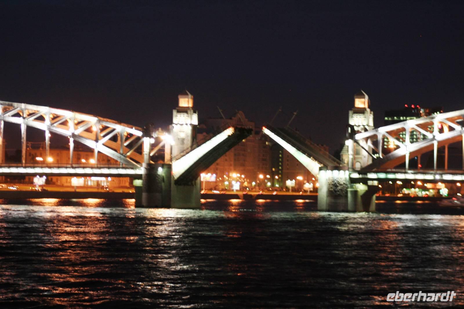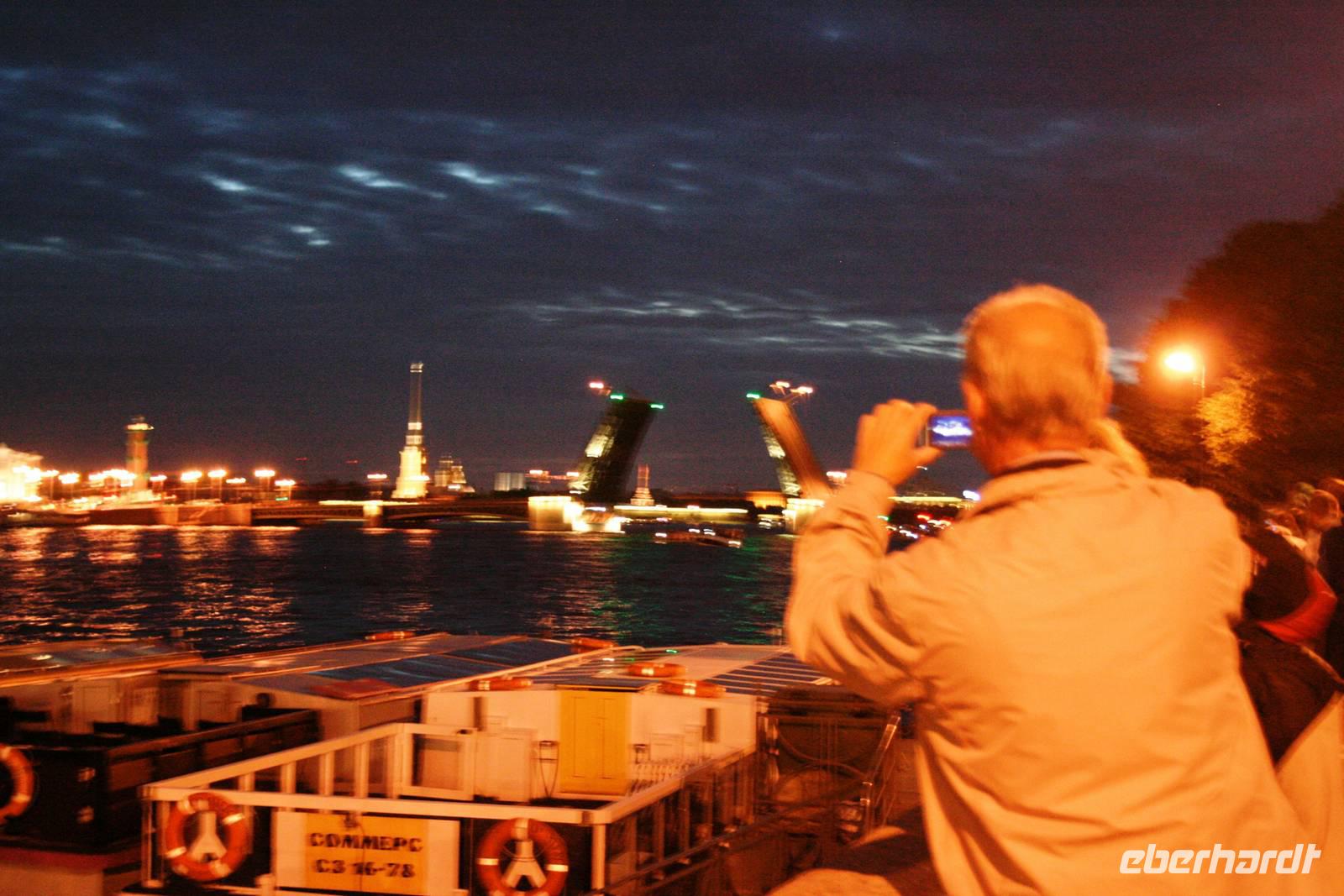 Nach dem Abendessen war für viele der Tag bzw. die Nacht noch nicht zu Ende. Mitternacht, es war nun doch dunkler geworden, fuhren wir mit dem Bus durch das erleuchtete St. Petersburg. Besonders beeindruckte uns der erstrahlte Theaterplatz. Am Newa-Ufer, unweit des Winterpalais erlebten wir dann das Schauspiel der nächtlichen Brückenöffungen. Ca. ab 2 Uhr öffnen sich nacheinander die Newabrücken für 2 bis 3 h. Dieses Ereignis zieht Tausende nachtschwärmende St. Petersburger und ihre Besucher an. Zum Abschluß öffneten wir die "Eberhardt-Bar" am Newa-Kai und stoßen mit einem "Zarskaja" auf den schon längst vergangenen und auf den bereits begonnenen Reisetag an.