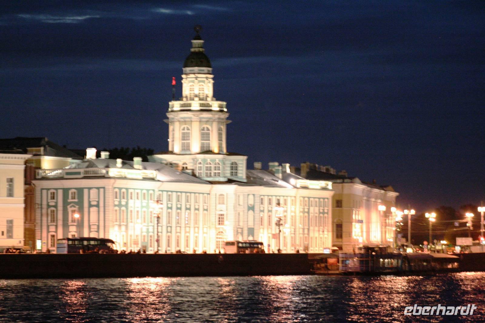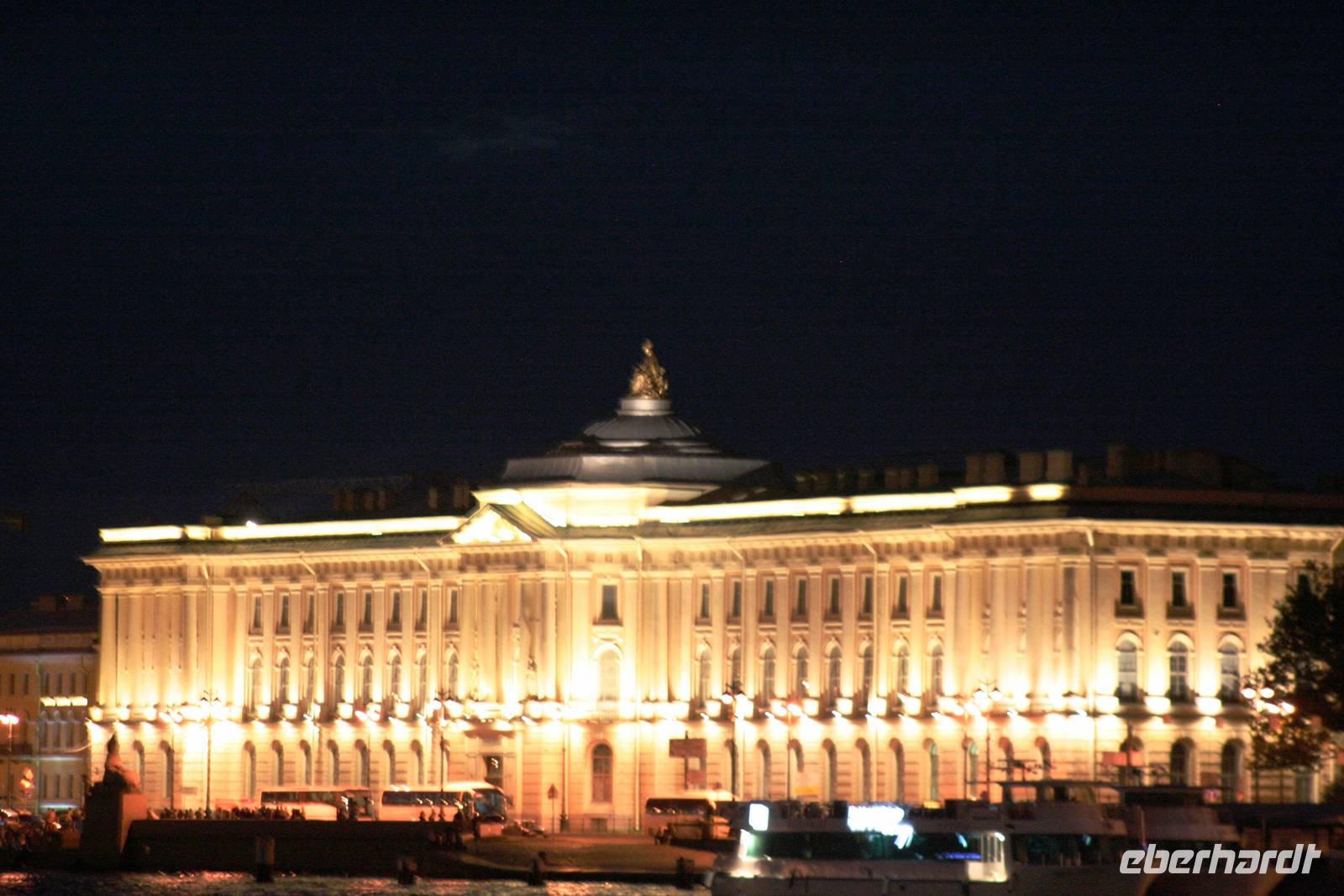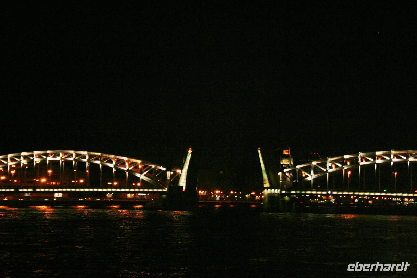 Nach dem Abendessen war für viele der Tag bzw. die Nacht noch nicht zu Ende. Mitternacht, es war nun doch dunkler geworden, fuhren wir mit dem Bus durch das erleuchtete St. Petersburg. Besonders beeindruckte uns der erstrahlte Theaterplatz. Am Newa-Ufer, unweit des Winterpalais erlebten wir dann das Schauspiel der nächtlichen Brückenöffungen. Ca. ab 2 Uhr öffnen sich nacheinander die Newabrücken für 2 bis 3 h. Dieses Ereignis zieht Tausende nachtschwärmende St. Petersburger und ihre Besucher an. Zum Abschluß öffneten wir die "Eberhardt-Bar" am Newa-Kai und stoßen mit einem "Zarskaja" auf den schon längst vergangenen und auf den bereits begonnenen Reisetag an.