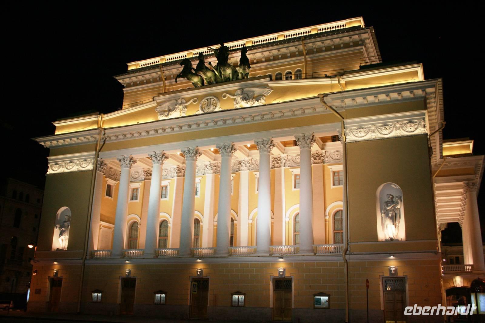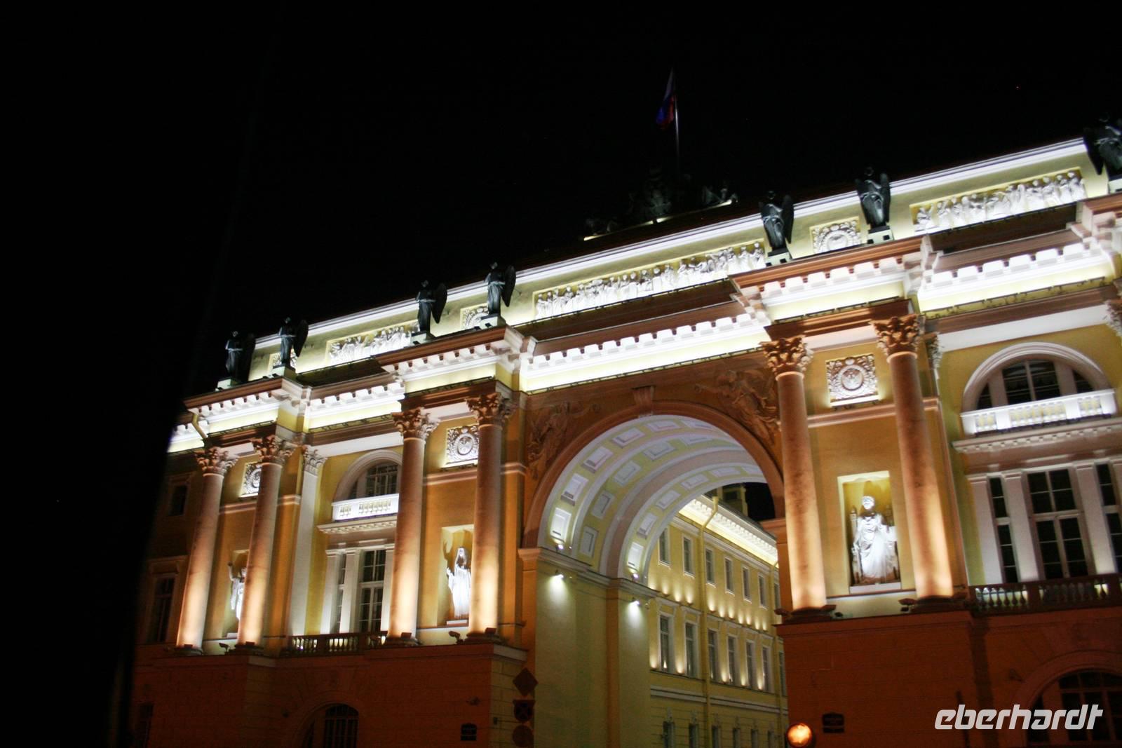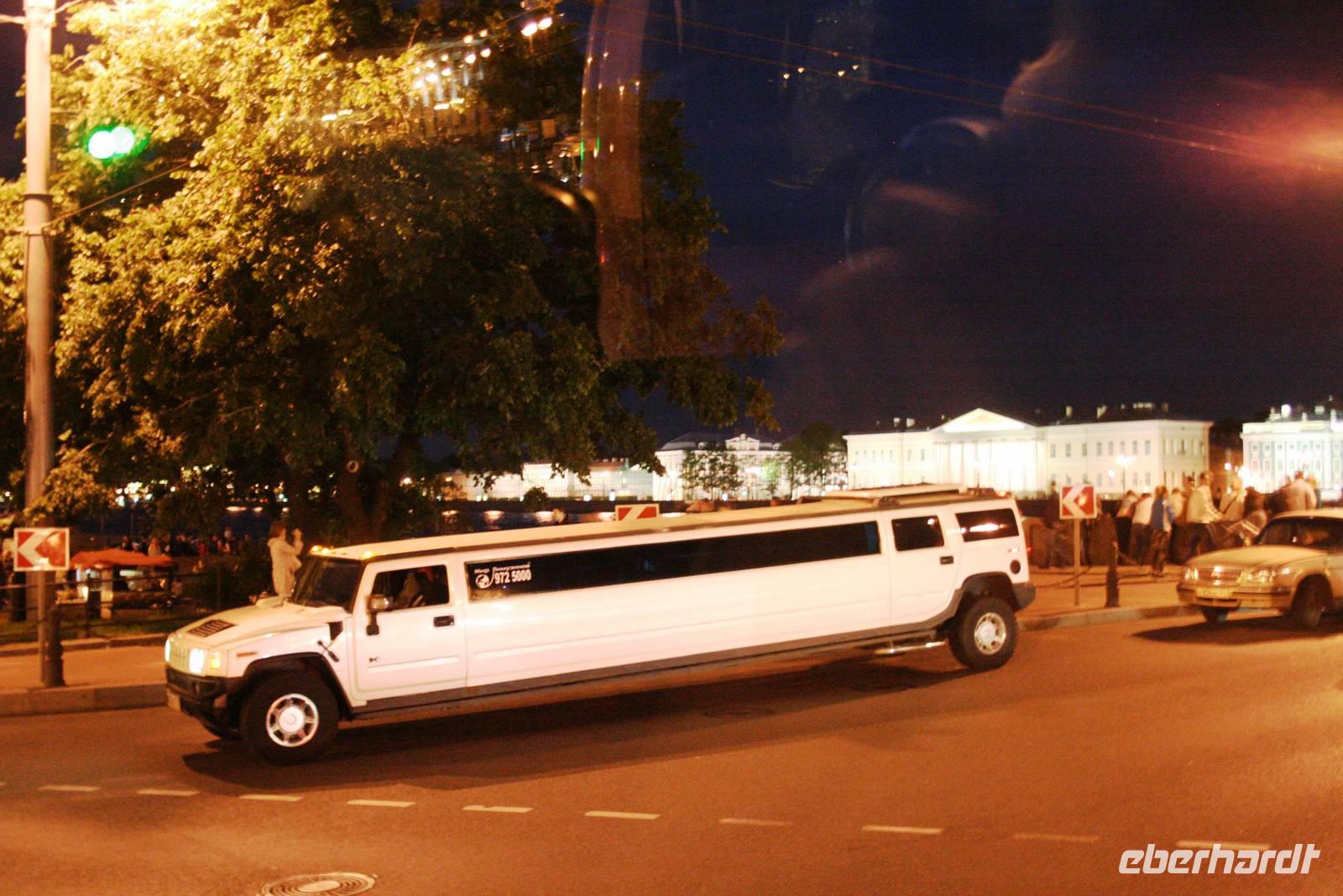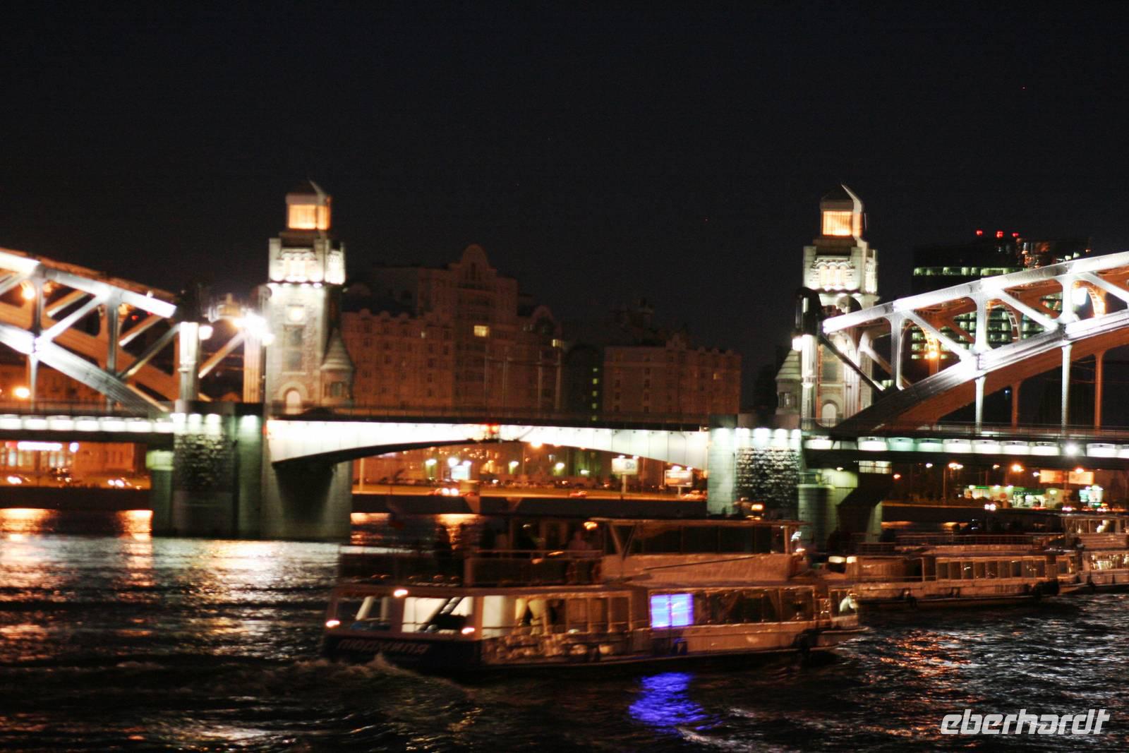 Nach dem Abendessen war für viele der Tag bzw. die Nacht noch nicht zu Ende. Mitternacht, es war nun doch dunkler geworden, fuhren wir mit dem Bus durch das erleuchtete St. Petersburg. Besonders beeindruckte uns der erstrahlte Theaterplatz. Am Newa-Ufer, unweit des Winterpalais erlebten wir dann das Schauspiel der nächtlichen Brückenöffungen. Ca. ab 2 Uhr öffnen sich nacheinander die Newabrücken für 2 bis 3 h. Dieses Ereignis zieht Tausende nachtschwärmende St. Petersburger und ihre Besucher an. Zum Abschluß öffneten wir die "Eberhardt-Bar" am Newa-Kai und stoßen mit einem "Zarskaja" auf den schon längst vergangenen und auf den bereits begonnenen Reisetag an.