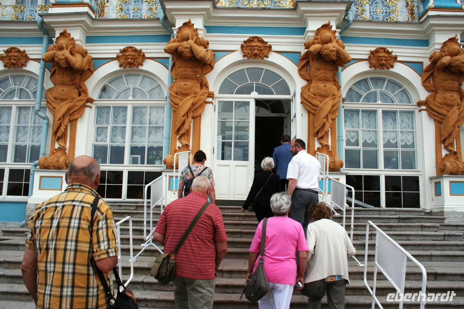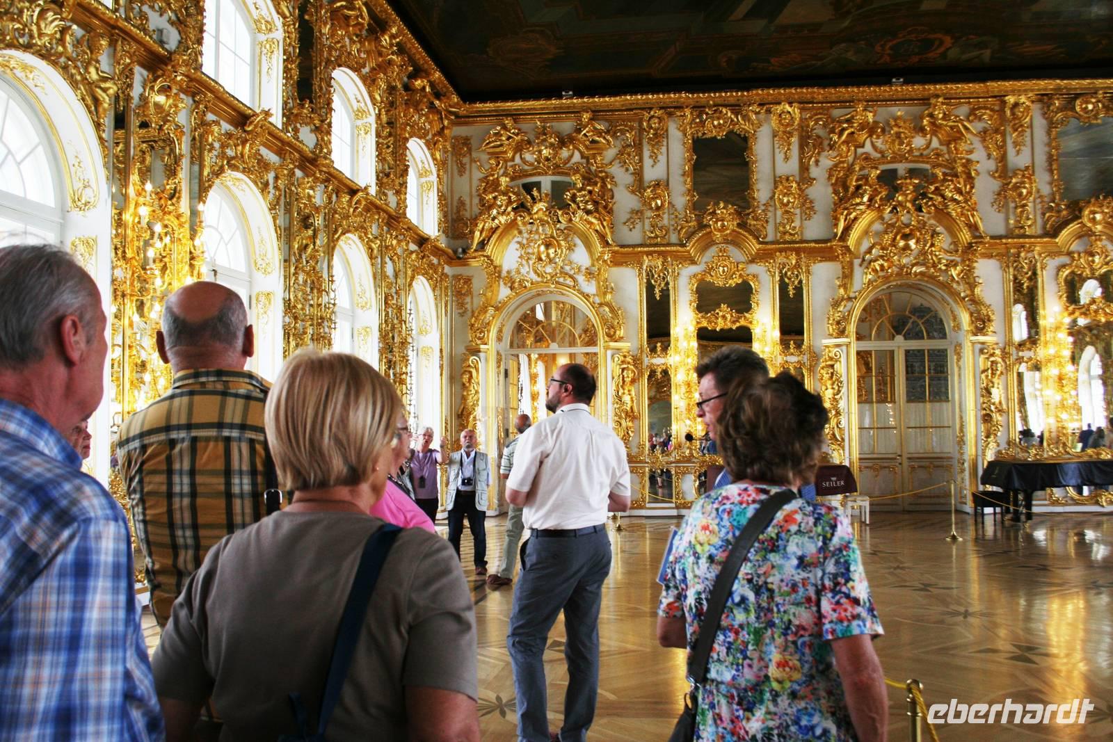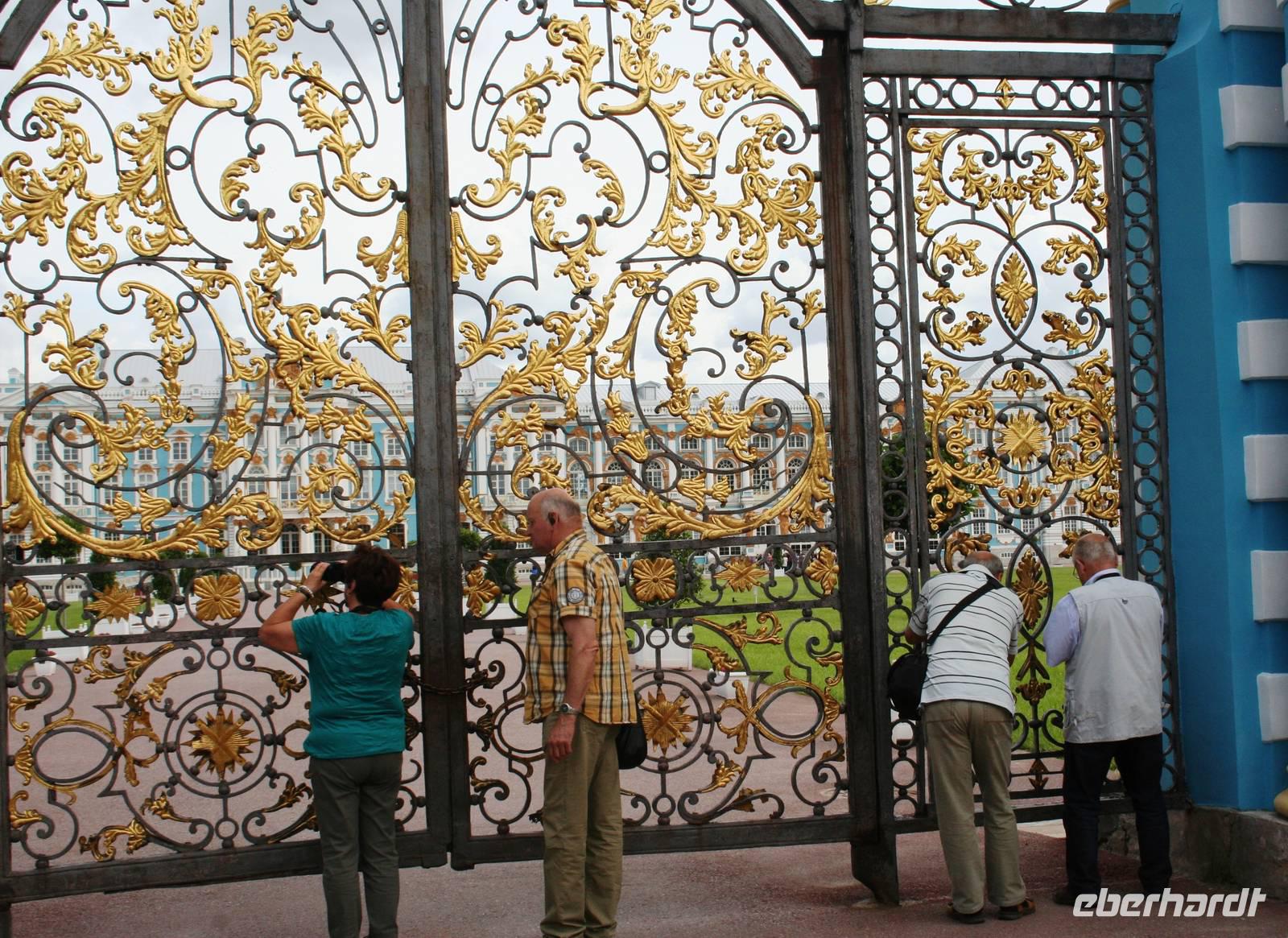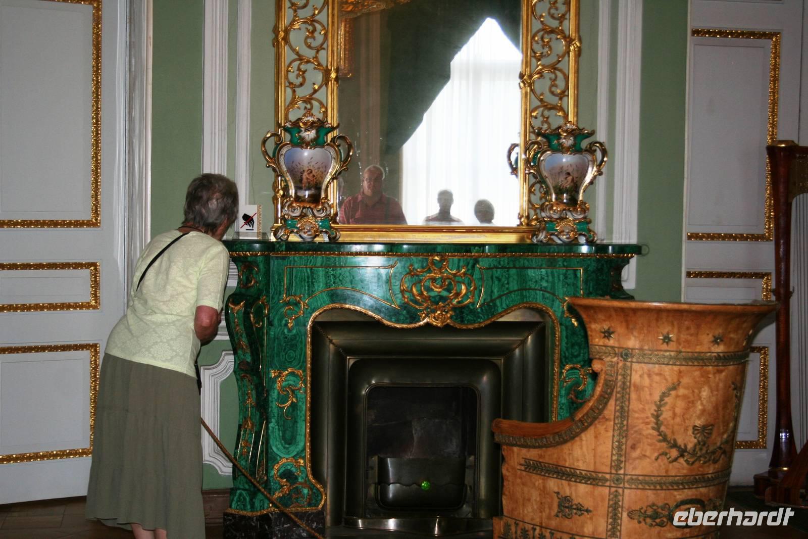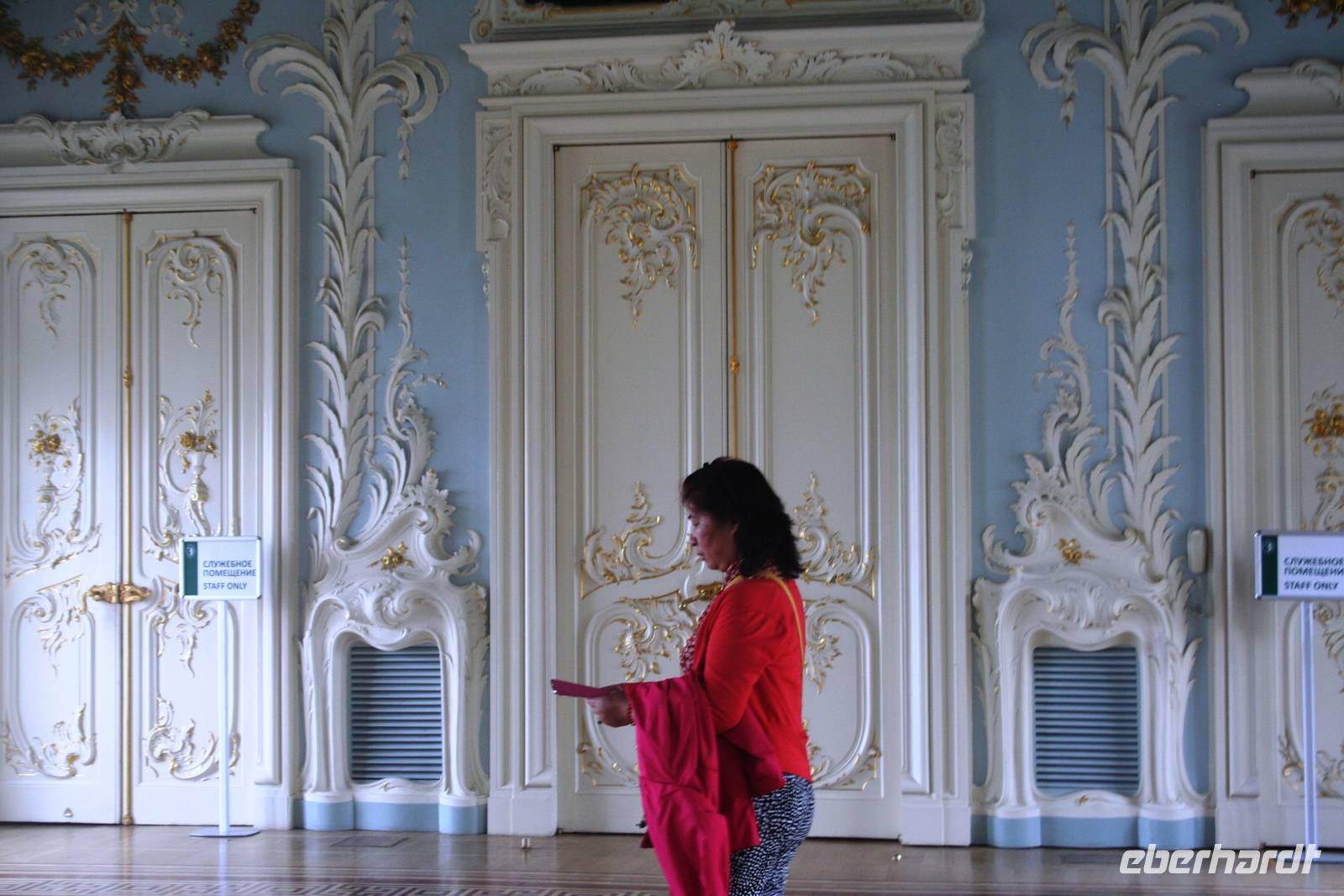 Am Nachmittag fuhren wir nach Puschkin (Zarskoje Selo). Unser Ziel war der Große Katharinenpalast mit dem Bernsteinzimmer. Zunächst "schlunzten" wir nur durch das schmiedeeiserne Gitter der Goldenen Pforte auf das imposante Ensemble des Palastes, über 300 Meter ist die Fassade lang. Bis zu unserer Führung im Palast hatten wir noch Zeit. Mit Igor unternahmen wir deshalb einen Spaziergang durch den wunderschön angelegten Park mit Cameron-Galerie, Orangerie, Teichen und einem See. Später wurde uns wie VIPs Einlass in den Palast gewährt. Exklusiv (nur unsere Gruppe) schritten wir über den riesigen, Menschen leeren Innenhof des Katharinenpalastes. Ein roter Teppich war sogar ausgerollt - das passende Ambiente für unser Gruppenbild. Welch ein Prunk und Ausdruck der Macht ... Rastrelli, einen Meister seines Fachs, hatten die Zaren als Architekten in ihr Reich geholt! Natürlich gab es wieder "elegante" Überschuhe für unseren perfekten Auftritt. Mit Igors ausgzeichneten Erklärungen im "Ohr" bestaunten wir die prachtvollen Räume: den Lyoner Saal, den Kavaliers-Speisesaal, den großen Thronsaal, den Bildersaal, die Appartements der Zarenfamilie, den Porträtsaal und natürlich das rekonstruierte Bernsteinzimmer. Begeistert von der Pracht verliessen wir den Palast.