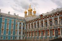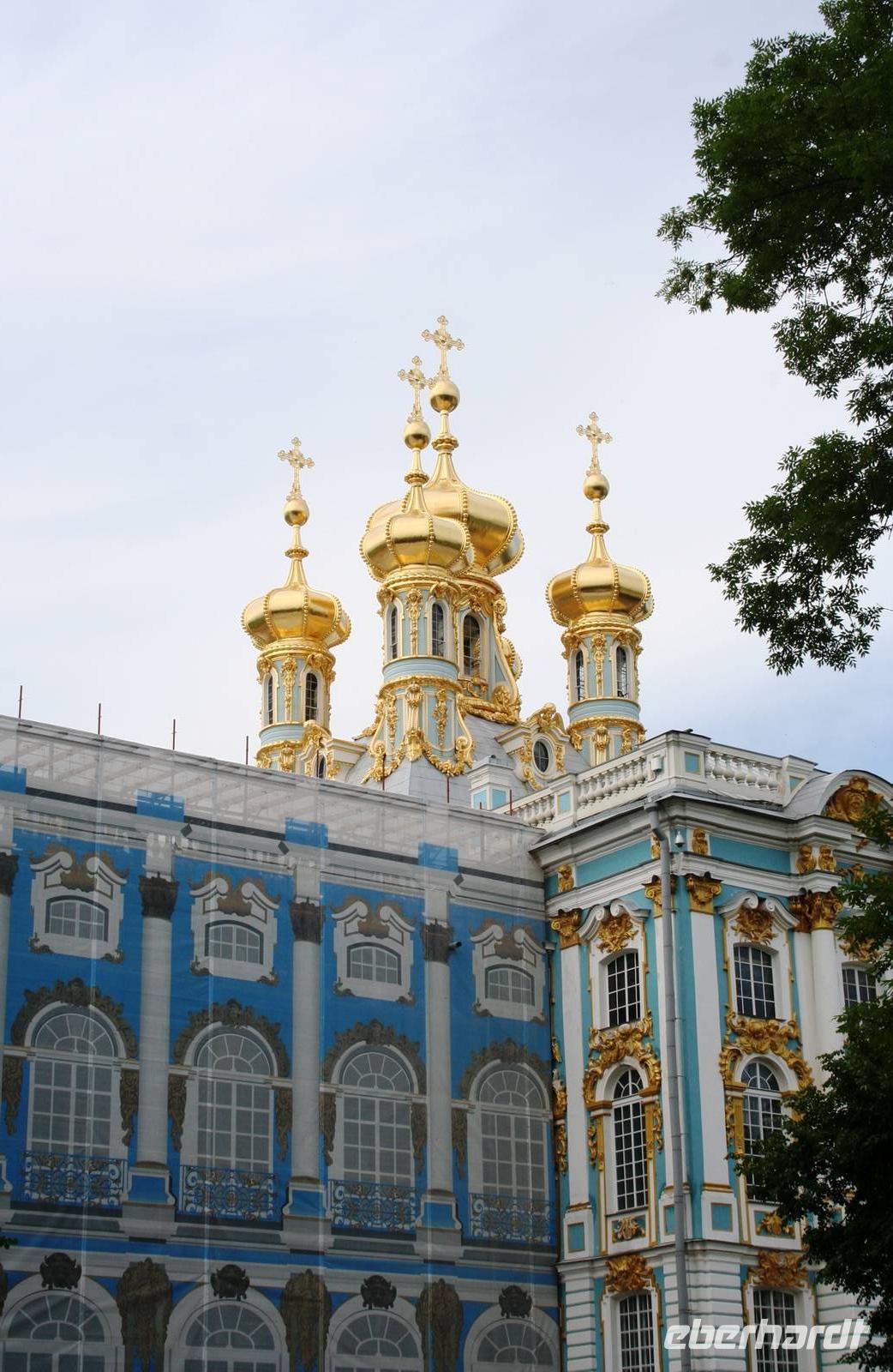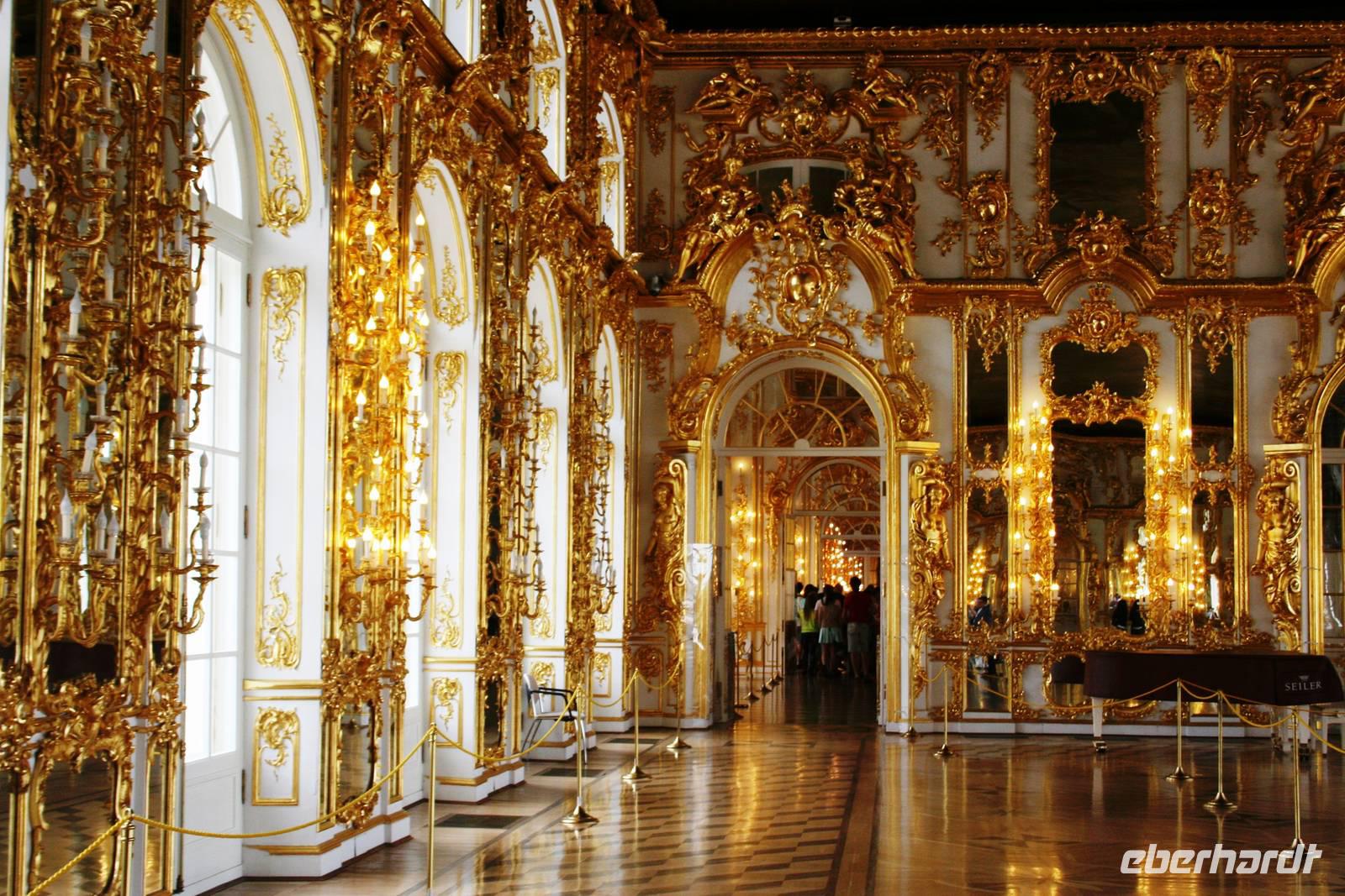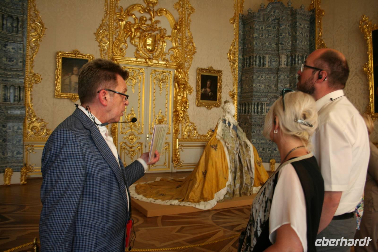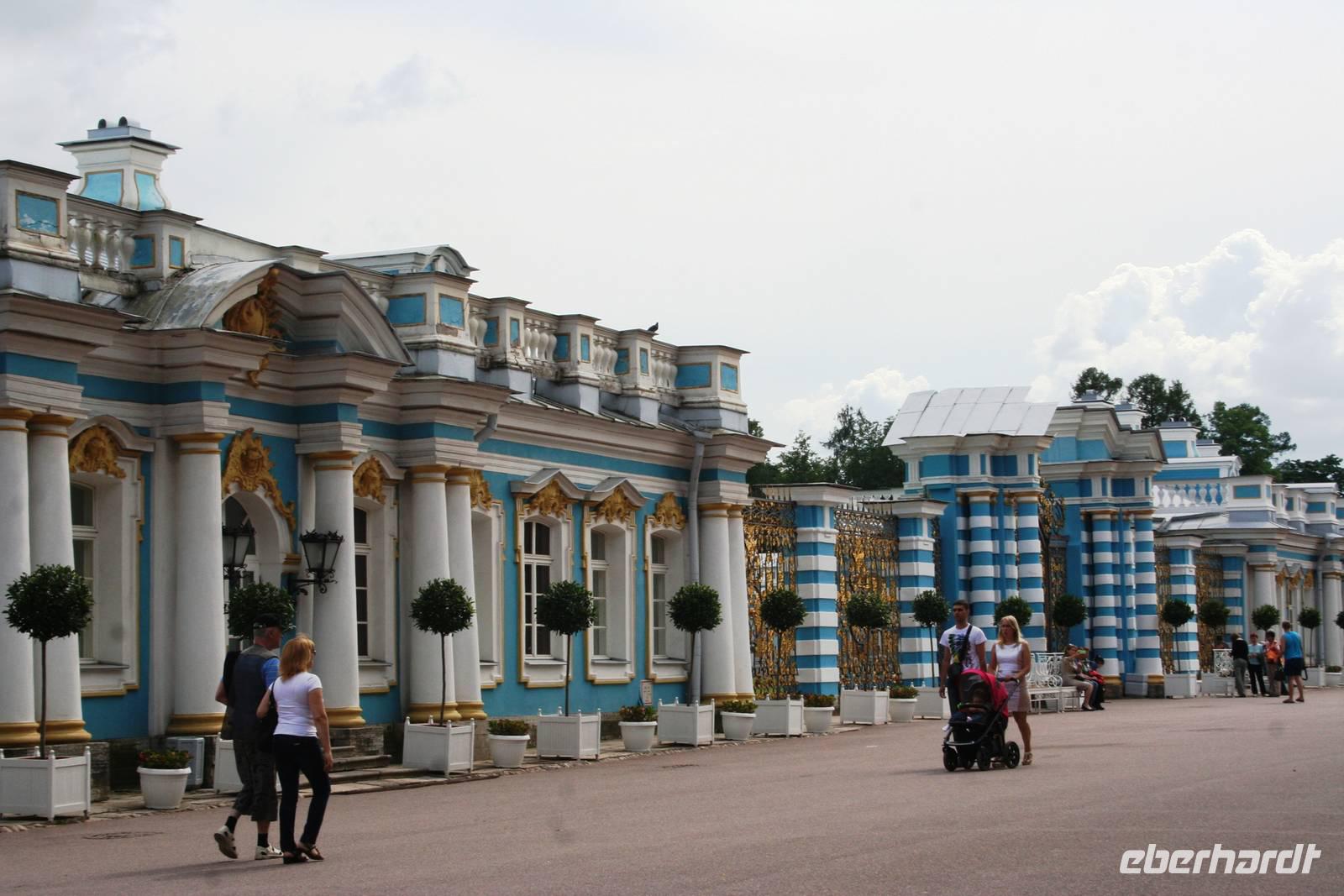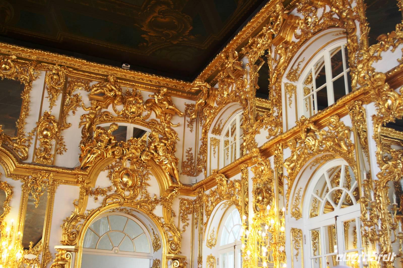 Am Nachmittag fuhren wir nach Puschkin (Zarskoje Selo). Unser Ziel war der Große Katharinenpalast mit dem Bernsteinzimmer. Zunächst "schlunzten" wir nur durch das schmiedeeiserne Gitter der Goldenen Pforte auf das imposante Ensemble des Palastes, über 300 Meter ist die Fassade lang. Bis zu unserer Führung im Palast hatten wir noch Zeit. Mit Igor unternahmen wir deshalb einen Spaziergang durch den wunderschön angelegten Park mit Cameron-Galerie, Orangerie, Teichen und einem See. Später wurde uns wie VIPs Einlass in den Palast gewährt. Exklusiv (nur unsere Gruppe) schritten wir über den riesigen, Menschen leeren Innenhof des Katharinenpalastes. Ein roter Teppich war sogar ausgerollt - das passende Ambiente für unser Gruppenbild. Welch ein Prunk und Ausdruck der Macht ... Rastrelli, einen Meister seines Fachs, hatten die Zaren als Architekten in ihr Reich geholt! Natürlich gab es wieder "elegante" Überschuhe für unseren perfekten Auftritt. Mit Igors ausgzeichneten Erklärungen im "Ohr" bestaunten wir die prachtvollen Räume: den Lyoner Saal, den Kavaliers-Speisesaal, den großen Thronsaal, den Bildersaal, die Appartements der Zarenfamilie, den Porträtsaal und natürlich das rekonstruierte Bernsteinzimmer. Begeistert von der Pracht verliessen wir den Palast.