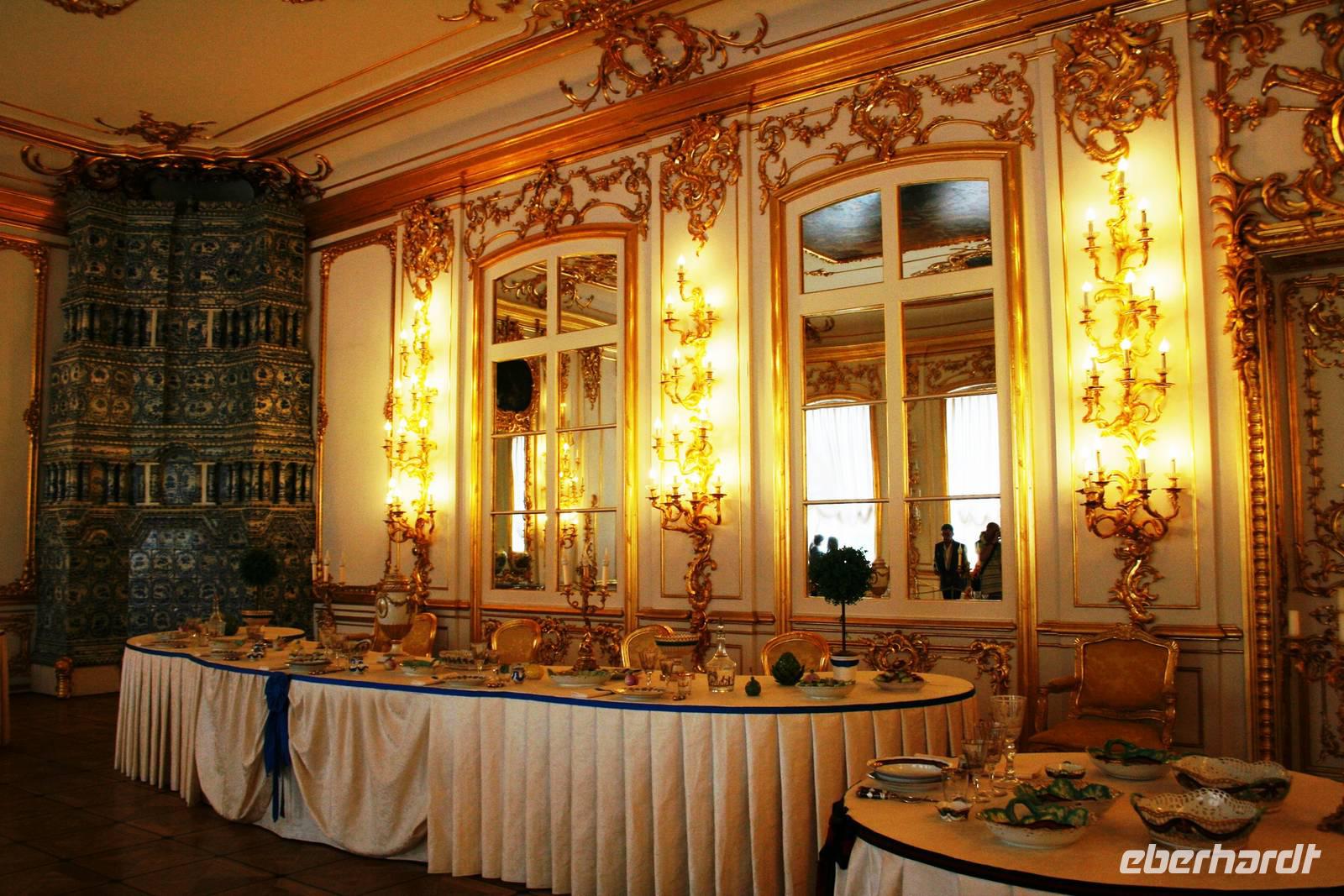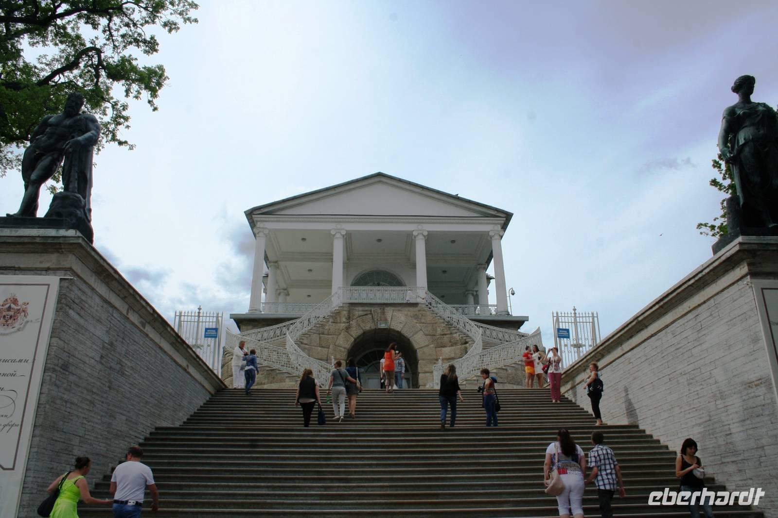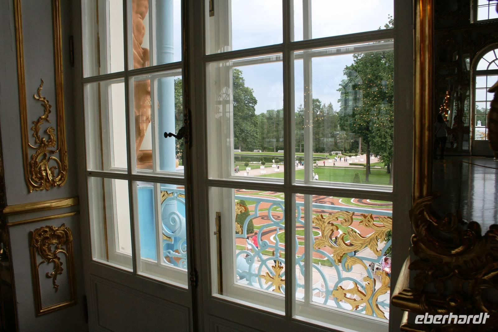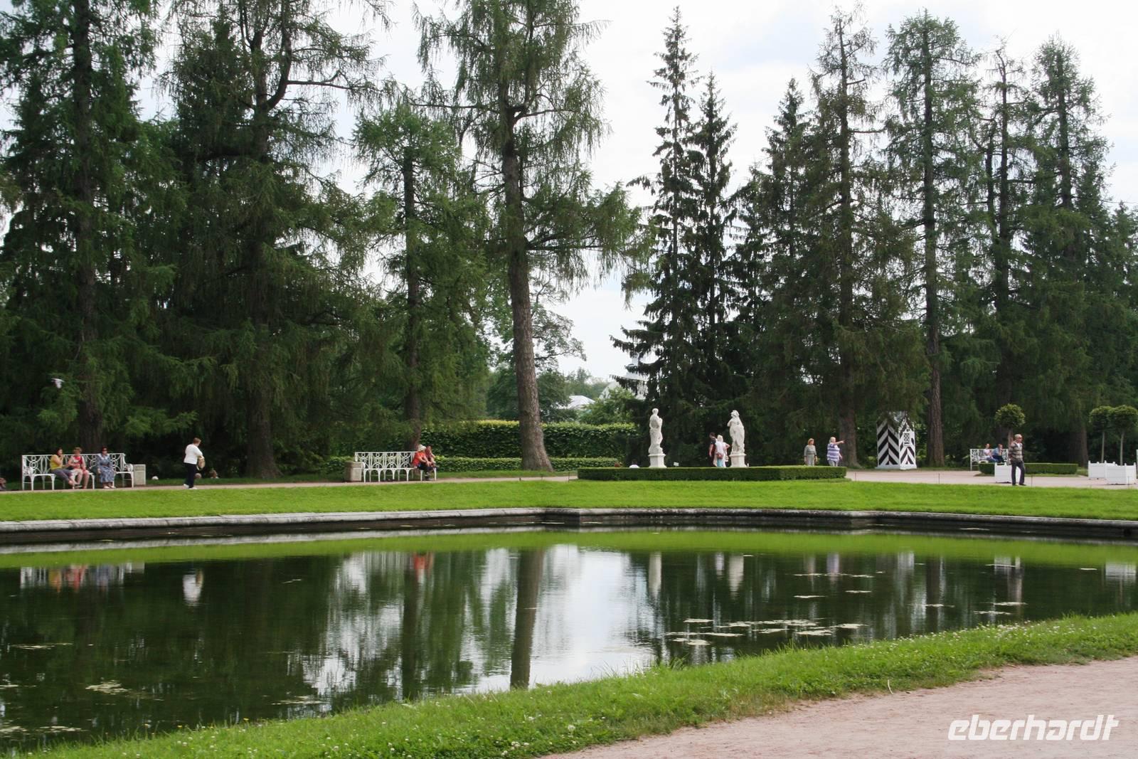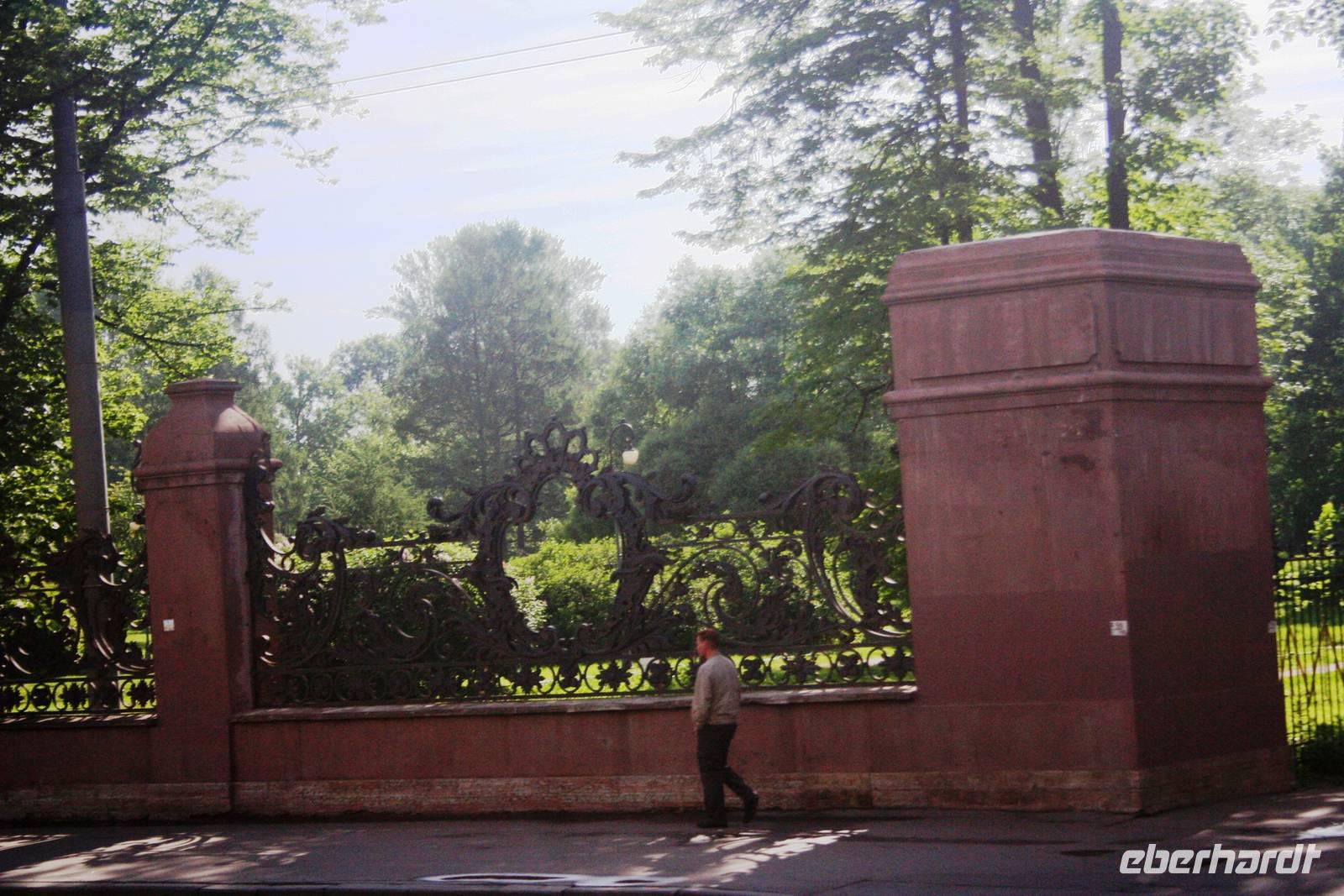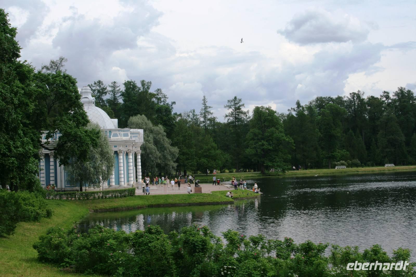 Am Nachmittag fuhren wir nach Puschkin (Zarskoje Selo). Unser Ziel war der Große Katharinenpalast mit dem Bernsteinzimmer. Zunächst "schlunzten" wir nur durch das schmiedeeiserne Gitter der Goldenen Pforte auf das imposante Ensemble des Palastes, über 300 Meter ist die Fassade lang. Bis zu unserer Führung im Palast hatten wir noch Zeit. Mit Igor unternahmen wir deshalb einen Spaziergang durch den wunderschön angelegten Park mit Cameron-Galerie, Orangerie, Teichen und einem See. Später wurde uns wie VIPs Einlass in den Palast gewährt. Exklusiv (nur unsere Gruppe) schritten wir über den riesigen, Menschen leeren Innenhof des Katharinenpalastes. Ein roter Teppich war sogar ausgerollt - das passende Ambiente für unser Gruppenbild. Welch ein Prunk und Ausdruck der Macht ... Rastrelli, einen Meister seines Fachs, hatten die Zaren als Architekten in ihr Reich geholt! Natürlich gab es wieder "elegante" Überschuhe für unseren perfekten Auftritt. Mit Igors ausgzeichneten Erklärungen im "Ohr" bestaunten wir die prachtvollen Räume: den Lyoner Saal, den Kavaliers-Speisesaal, den großen Thronsaal, den Bildersaal, die Appartements der Zarenfamilie, den Porträtsaal und natürlich das rekonstruierte Bernsteinzimmer. Begeistert von der Pracht verliessen wir den Palast.