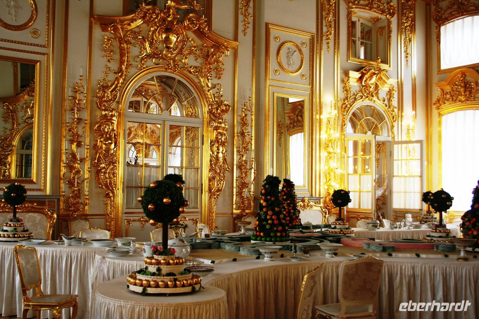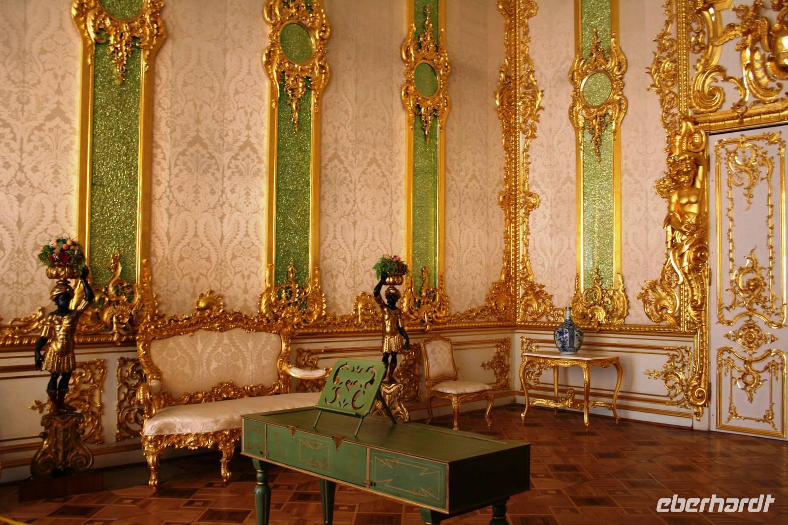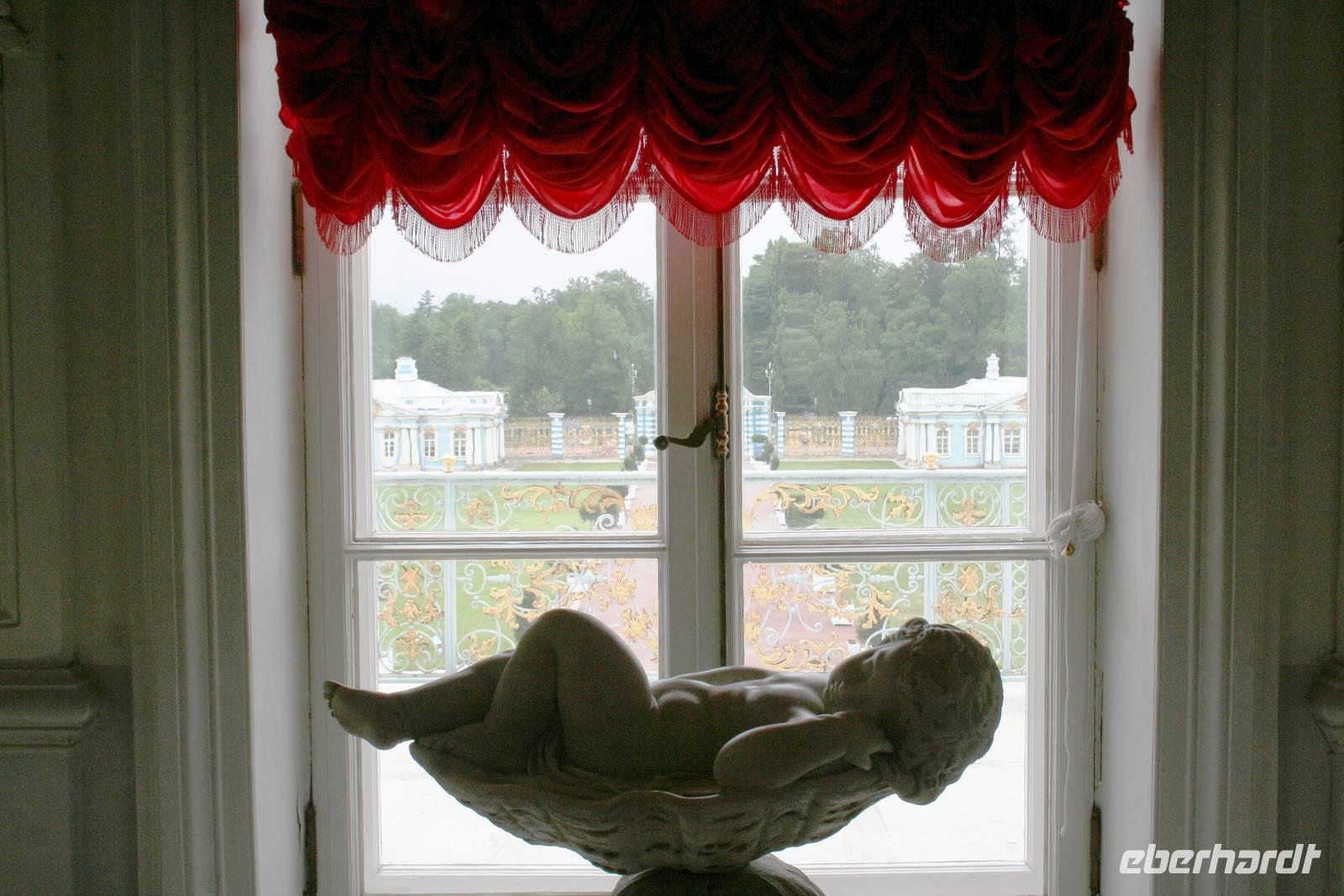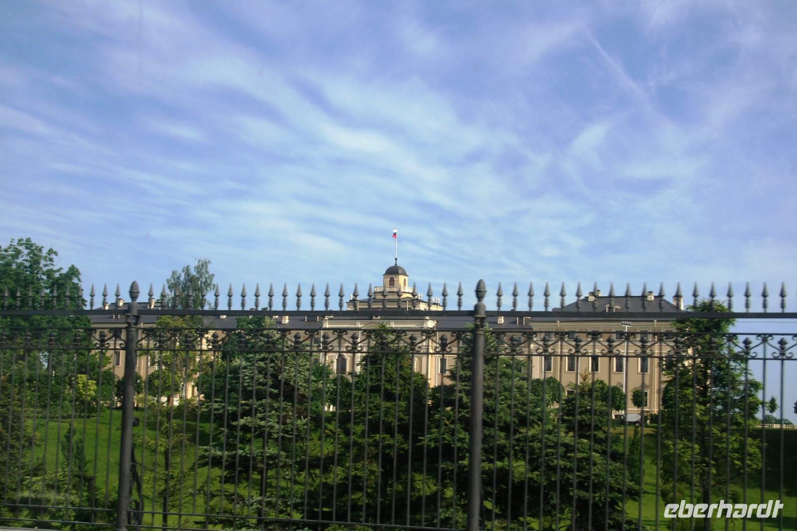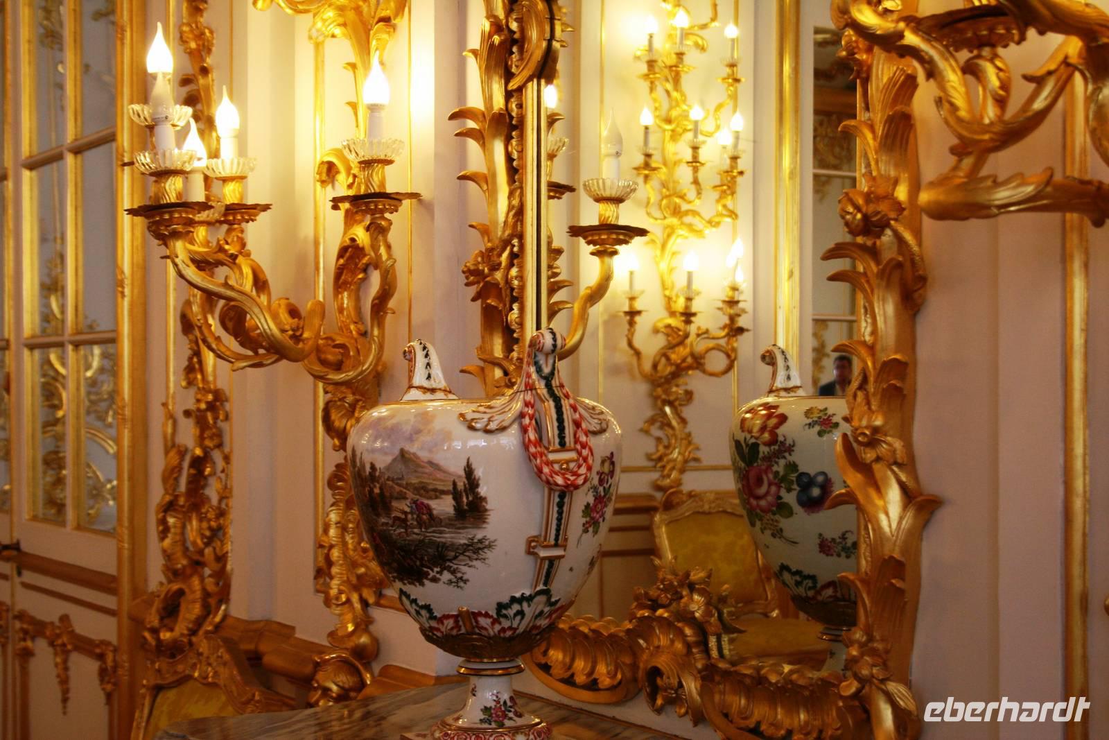 Am Nachmittag fuhren wir nach Puschkin (Zarskoje Selo). Unser Ziel war der Große Katharinenpalast mit dem Bernsteinzimmer. Zunächst "schlunzten" wir nur durch das schmiedeeiserne Gitter der Goldenen Pforte auf das imposante Ensemble des Palastes, über 300 Meter ist die Fassade lang. Bis zu unserer Führung im Palast hatten wir noch Zeit. Mit Igor unternahmen wir deshalb einen Spaziergang durch den wunderschön angelegten Park mit Cameron-Galerie, Orangerie, Teichen und einem See. Später wurde uns wie VIPs Einlass in den Palast gewährt. Exklusiv (nur unsere Gruppe) schritten wir über den riesigen, Menschen leeren Innenhof des Katharinenpalastes. Ein roter Teppich war sogar ausgerollt - das passende Ambiente für unser Gruppenbild. Welch ein Prunk und Ausdruck der Macht ... Rastrelli, einen Meister seines Fachs, hatten die Zaren als Architekten in ihr Reich geholt! Natürlich gab es wieder "elegante" Überschuhe für unseren perfekten Auftritt. Mit Igors ausgzeichneten Erklärungen im "Ohr" bestaunten wir die prachtvollen Räume: den Lyoner Saal, den Kavaliers-Speisesaal, den großen Thronsaal, den Bildersaal, die Appartements der Zarenfamilie, den Porträtsaal und natürlich das rekonstruierte Bernsteinzimmer. Begeistert von der Pracht verliessen wir den Palast.