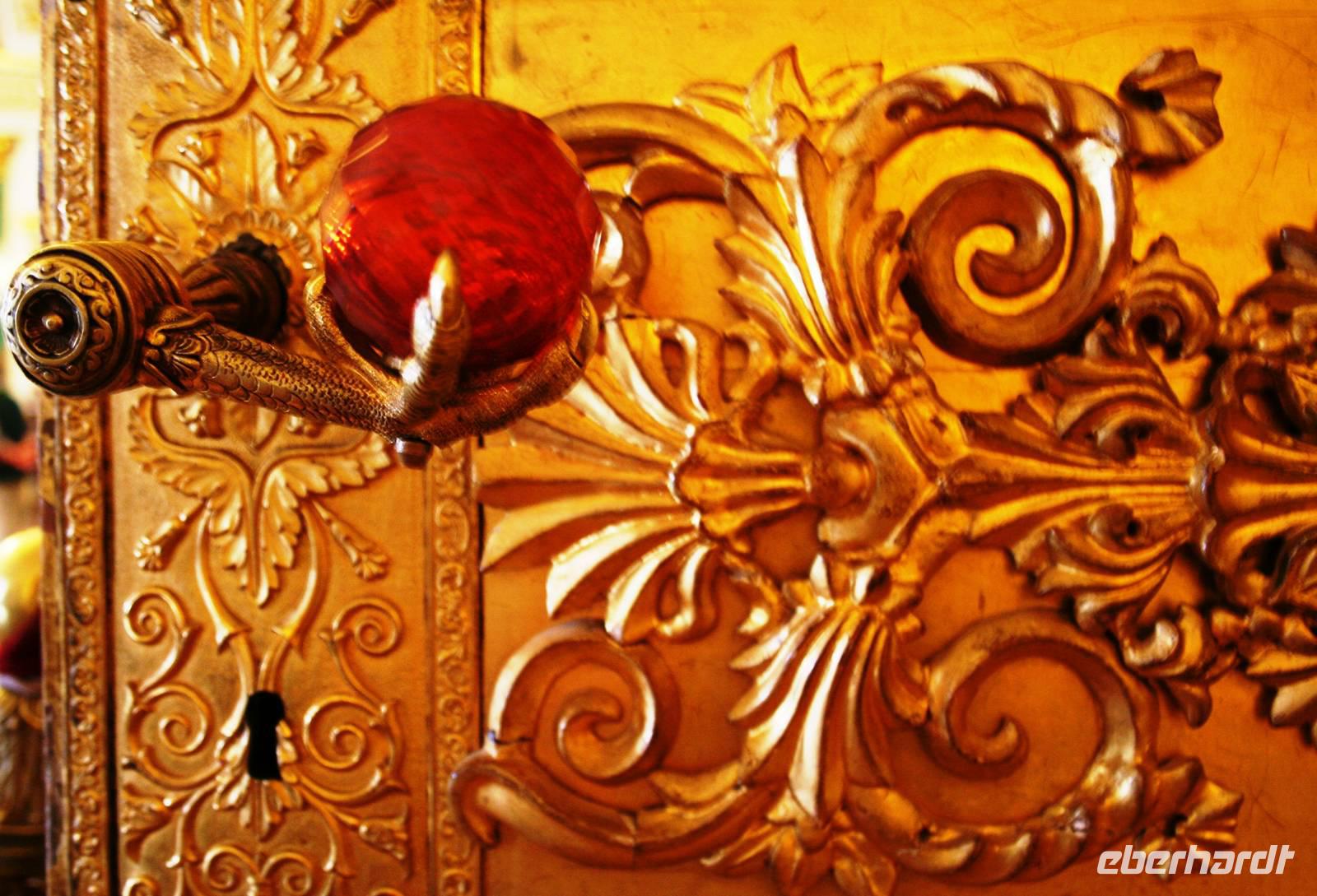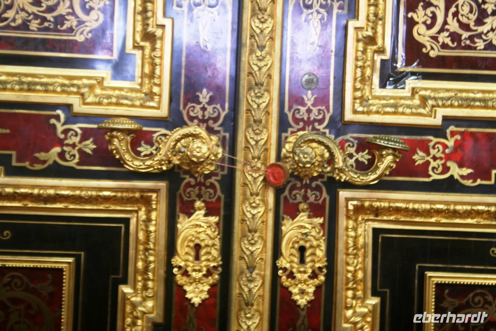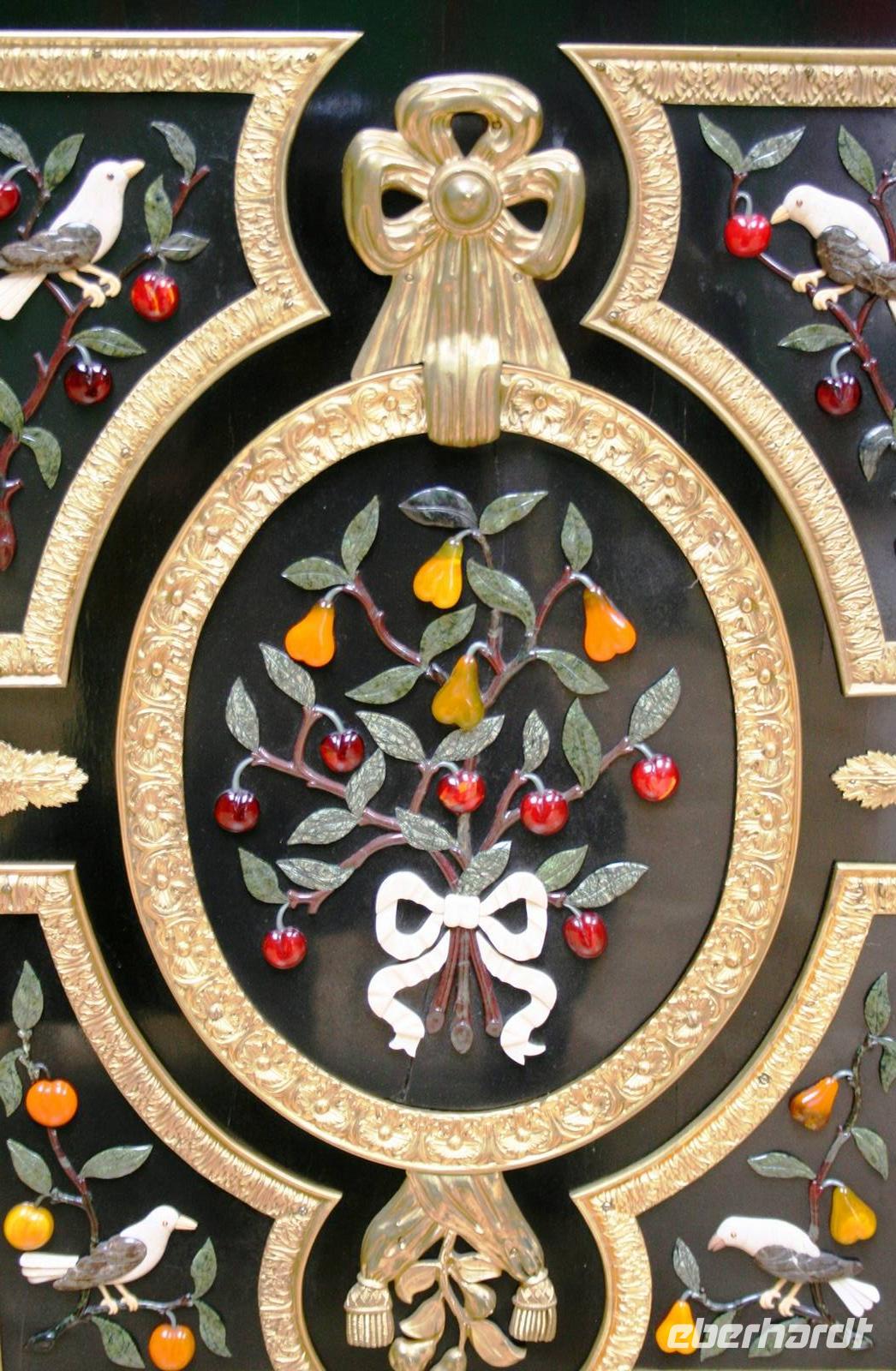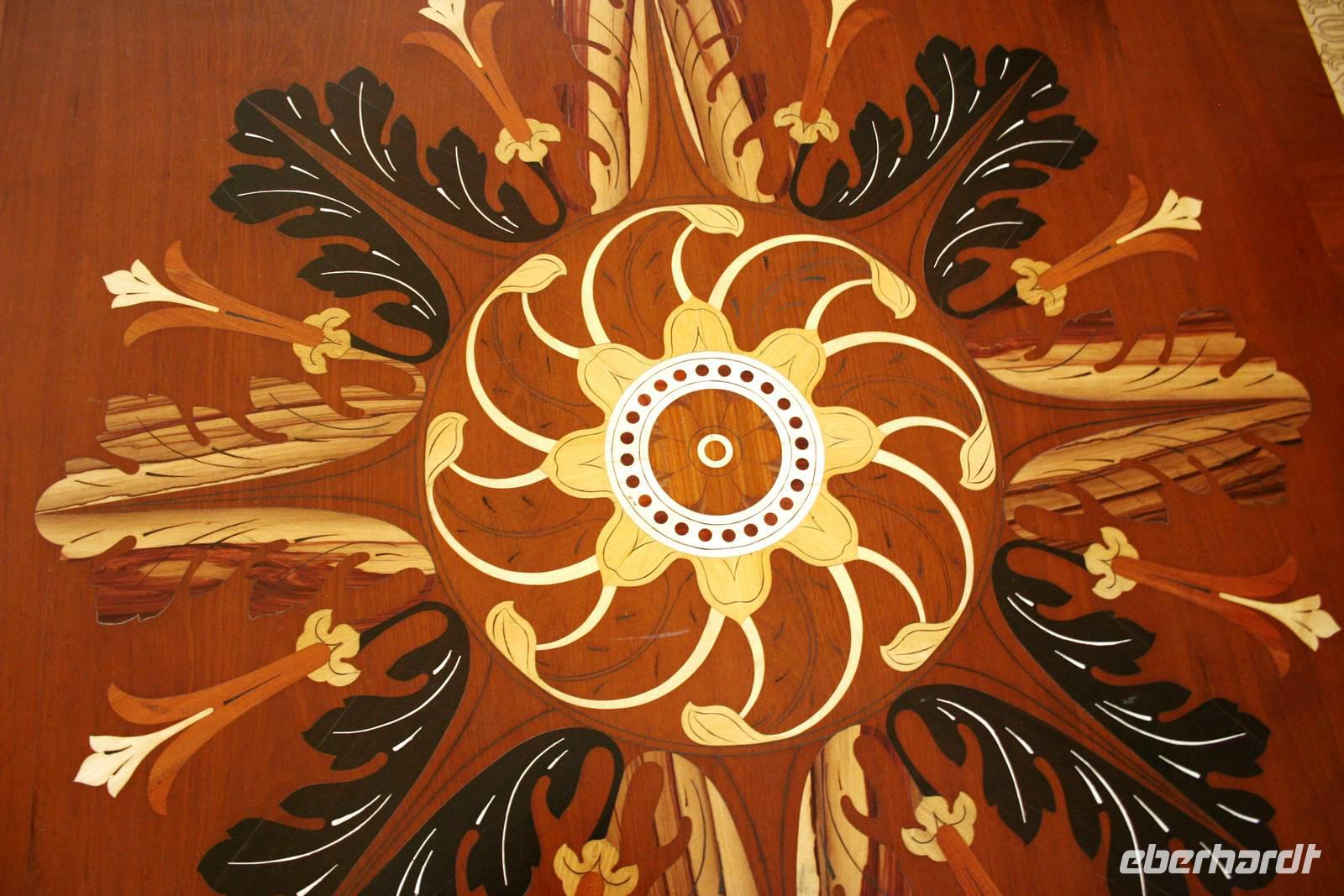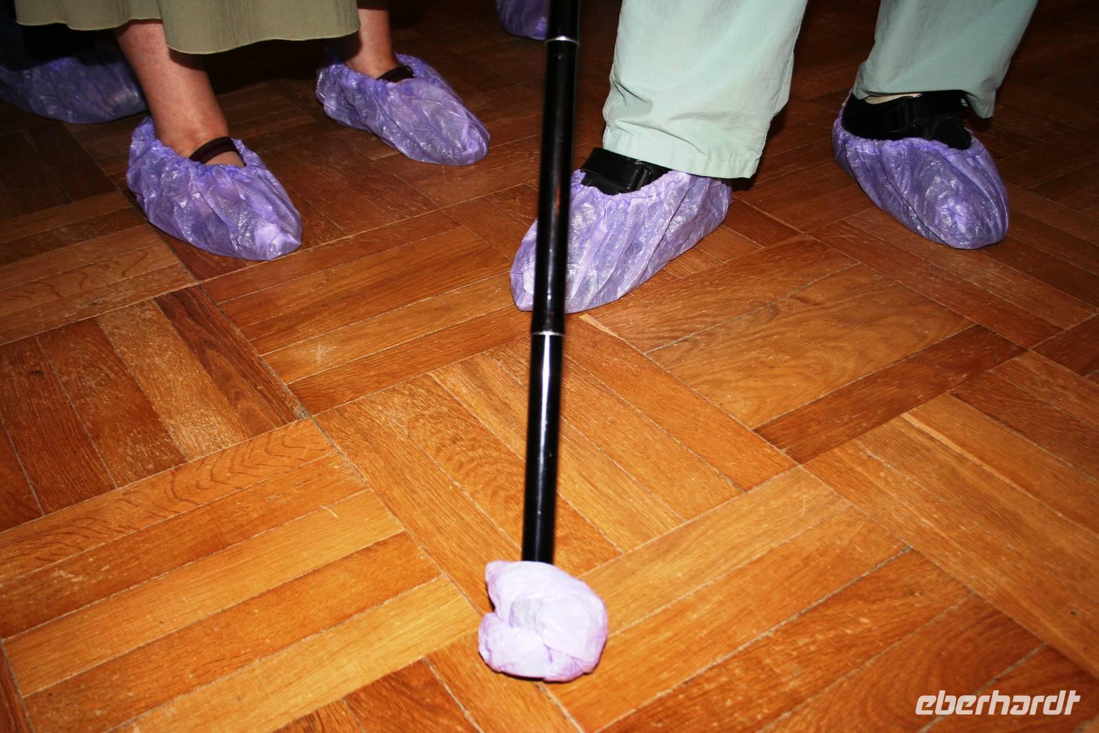Am Nachmittag fuhren wir nach Puschkin (Zarskoje Selo). Unser Ziel war der Große Katharinenpalast mit dem Bernsteinzimmer. Zunächst "schlunzten" wir nur durch das schmiedeeiserne Gitter der Goldenen Pforte auf das imposante Ensemble des Palastes, über 300 Meter ist die Fassade lang. Bis zu unserer Führung im Palast hatten wir noch Zeit. Mit Igor unternahmen wir deshalb einen Spaziergang durch den wunderschön angelegten Park mit Cameron-Galerie, Orangerie, Teichen und einem See. Später wurde uns wie VIPs Einlass in den Palast gewährt. Exklusiv (nur unsere Gruppe) schritten wir über den riesigen, Menschen leeren Innenhof des Katharinenpalastes. Ein roter Teppich war sogar ausgerollt - das passende Ambiente für unser Gruppenbild. Welch ein Prunk und Ausdruck der Macht ... Rastrelli, einen Meister seines Fachs, hatten die Zaren als Architekten in ihr Reich geholt! Natürlich gab es wieder "elegante" Überschuhe für unseren perfekten Auftritt. Mit Igors ausgzeichneten Erklärungen im "Ohr" bestaunten wir die prachtvollen Räume: den Lyoner Saal, den Kavaliers-Speisesaal, den großen Thronsaal, den Bildersaal, die Appartements der Zarenfamilie, den Porträtsaal und natürlich das rekonstruierte Bernsteinzimmer. Begeistert von der Pracht verliessen wir den Palast.