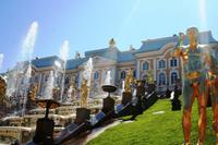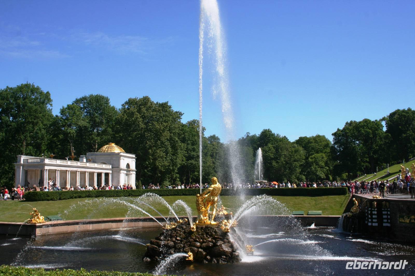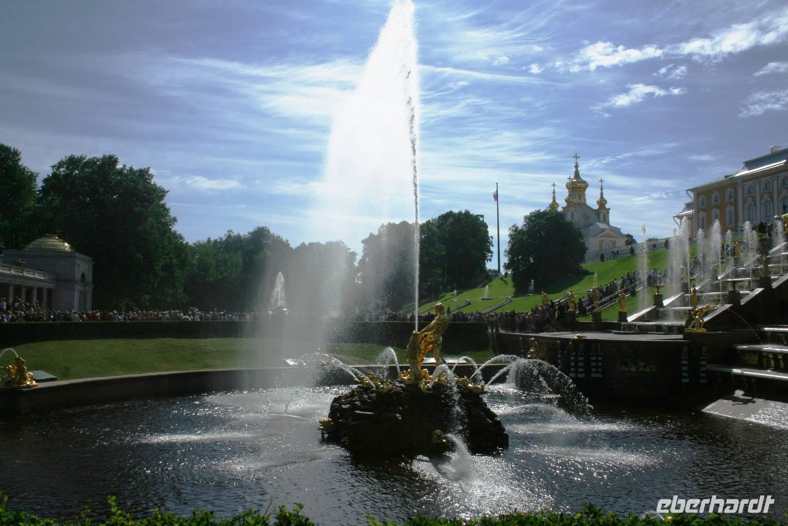 Der heutige Tag begrüßte uns mit strahlend blauem Himmel und Sonnenschein, richtiges Zarenwetter. Unser heutiges Ziel war Peterhof mit seinem wunderschönen Park und der Palastanlage am Finnischen Meerbusen. Wir nahmen den Weg mit dem Bus und fuhren über den Moskauer Prospekt. Die ca. 1stündige Fahrt wurde nicht langweilig. Es gab wieder viel zu schauen und Igor erzählte Interessantes und Wissenwertes. Rechtzeitig trafen wir in Peterhof ein und suchten uns ein schattiges Plätzchen, um die Eröffnung der Wasserspiele zu erleben. Mit Paukenschlägen und klassischer Musik untermalt, beginnen pünktlich 11 Uhr die Fontänen der Großen Kaskade zu sprudeln. Anschließend besichtigten wir den Großen Palast, natürlich mit dem passenden Schuhwerk. Unser Reiseleiter Igor begleitete uns mit seinem Fachwissen durch die Prunksäle des Palastes: den blauen Empfangsraum, den Tanzsaal, den Thronsaal, den Weißen Speisesaal, die Chinakabinette, den Kronraum und das Diwanzimmer. Die Zaren hatten die besten Baumeister ihrer Zeit beauftragt und wahrlich einzigartige Räume entstehen lassen. Der Prunk und die Atmosphäre der einzelnen Räume beeindruckten uns sehr.