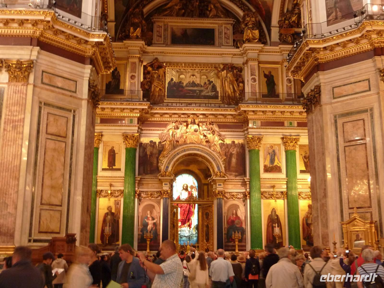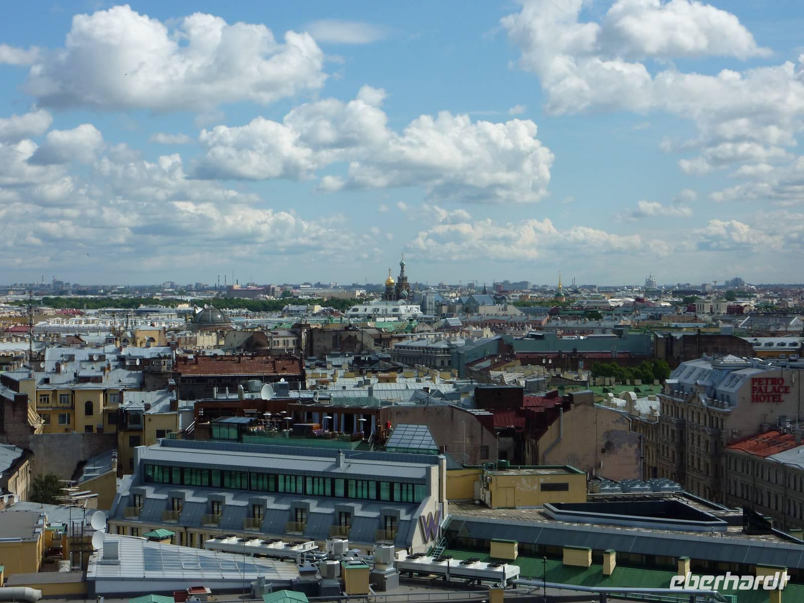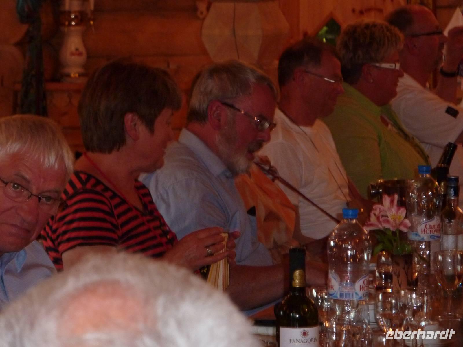 Der letzte Tag unseres Aufenthaltes in St. Petersburg begann mit strahlendem Sonnenschein und einem gemütlichen Frühstück. Heute hatten wir viel auf dem Programm...11.00 Uhr besuchten wir die Isaak-Kathedrale. Bei der Führung erfuhren wir viel über diese, 14.000 Menschen fassende Kathedrale. Die Bauzeit der Kathedrale betrug über 40 Jahre.Sie verfügt über 112 Granitsäulen und eine halbe Tonne Gold wurden verbaut. Im Anschluss stiegen wir die Kolonnade herauf und erlebten einen unglaublichen Blick über die Stadt. Das Wetter war traumhaft und der Blick reichte über den Winterpalast, den Schloßplatz bis hin zu unserem Hotel. Noch einen Augenblick genossen wir die Sonne und ließen den Prunk und den Stolz der Stadt auf uns wirken. Weiter ging es zur Blutskirche, die Ihren Namen und Ihre Entstehung einem geschlichtichen Ereignis verdankt. Im März 1881 verblutete Zar Alexander II. nach der Detonation einer Bombe. Genau an dieser Stelle steht ein Pavilion zum Gedenken an dieses Unglück. Prägnant für diese Kirche sind die goldenen Zwiebeltürme, die farbige Gestaltung sowie die Mosaikenpracht im Inneren. Bei strahlendem Wetter fuhren wir zum Smolnyj-Kloster und weiter zum Großen Katharinenpalast. Leider war uns Petrus nun nicht mehr hold und wir besuchten bei starkem Regen den Großen Katharinenpalast, der nach den Verwüstungen des Zweiten Weltkrieges neu entstanden ist. Wir bestaunten den Thronsaal mit seinen Spiegeln und den vergoldeten Kronleuchtern, den Kavaliers-Speisesaal sowie den Bildersaal. Leider hatte sich das Wetter noch nicht gebessert und uns blieb nur eine ganz kleiner Spaziergang am oberen Rande des Parks in Richtung Bus. Den krönenden Abschluss sollte ein typisch, russisches Essen sein. Neben der Folklore ließen wir uns typische Köstlichkeiten wie Borschtsch, Kohlrouladen und Blinij schmecken. Natürlich durfte vor, während und nach dem Essen der Wodka - das Notionalgetränk nicht fehlen. Ein lustiger Abend neigt sich dem Ende...