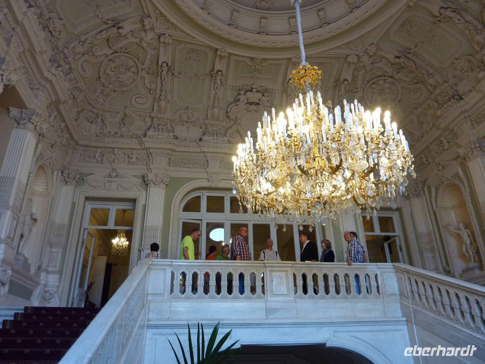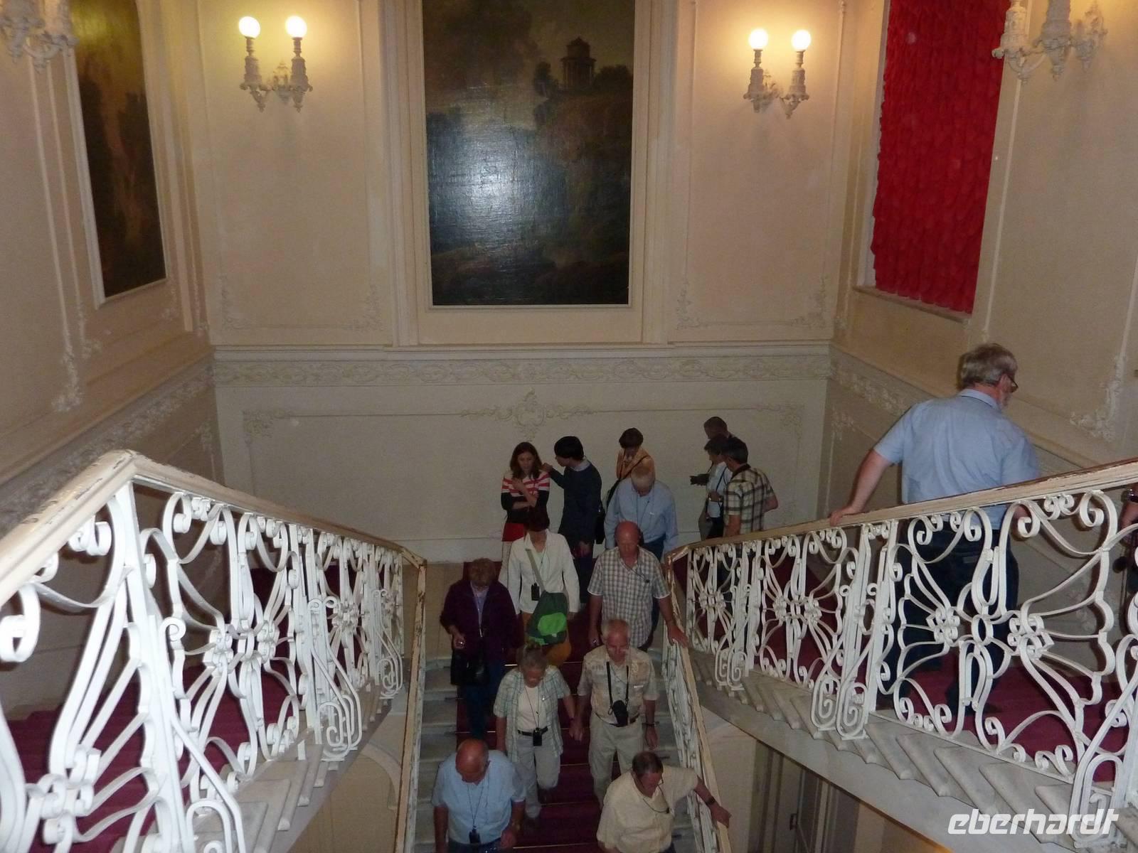 Ist die kulturelle Hauptstadt Russlands traurig, weil wir wieder abreisen? Am Morgen regnet es und mit einer leichten Aufbruchstimmung in der Luft genießen wir zu letzten Mal das Frühstück in unserem Hotel. Dann heißt es Koffer packen und los. 10.00 Uhr fuhren wir zum letzten Mal von unserem Hotel in das Stadtzentrum. Vor unserem Abflug stand noch der Besuch des Jusupow-Palast auf dem Programm. Wir fuhren entlang der Moika und besuchten das kleine, ursprüngliche Adelspalais. Der Palast erzählt die Geschichte vom Mord an dem Zarengünstling Rasputin. Im Untergeschoss ist anhand von Wachsfiguren der Tathergang sehr bildlich dargestellt. Im Obergeschoss finden wir eine opulente Innenarchitektur. Durch Igor und Lena erfahren wir viel über Rasputin und Felix Jusupow. Prägend ist die Nacht des 17.12.1916. In dieser wurde Rasputin durch mehrere Versuche getötet. Er verstarb jedoch nicht im Palast sondern auf dem Palasthof, wo ihn nun ein treffender Schuss tötete. Die Räumlichkeiten im Obergeschoss erhielten in der ersten Hälfte des 19. Jh. ihre gegenwärtige Gestaltung. Wir bestaunten unter anderem den Roten und den Blauen Salon sowie die prunkvollen Deckengemälde und das kleine Theater.