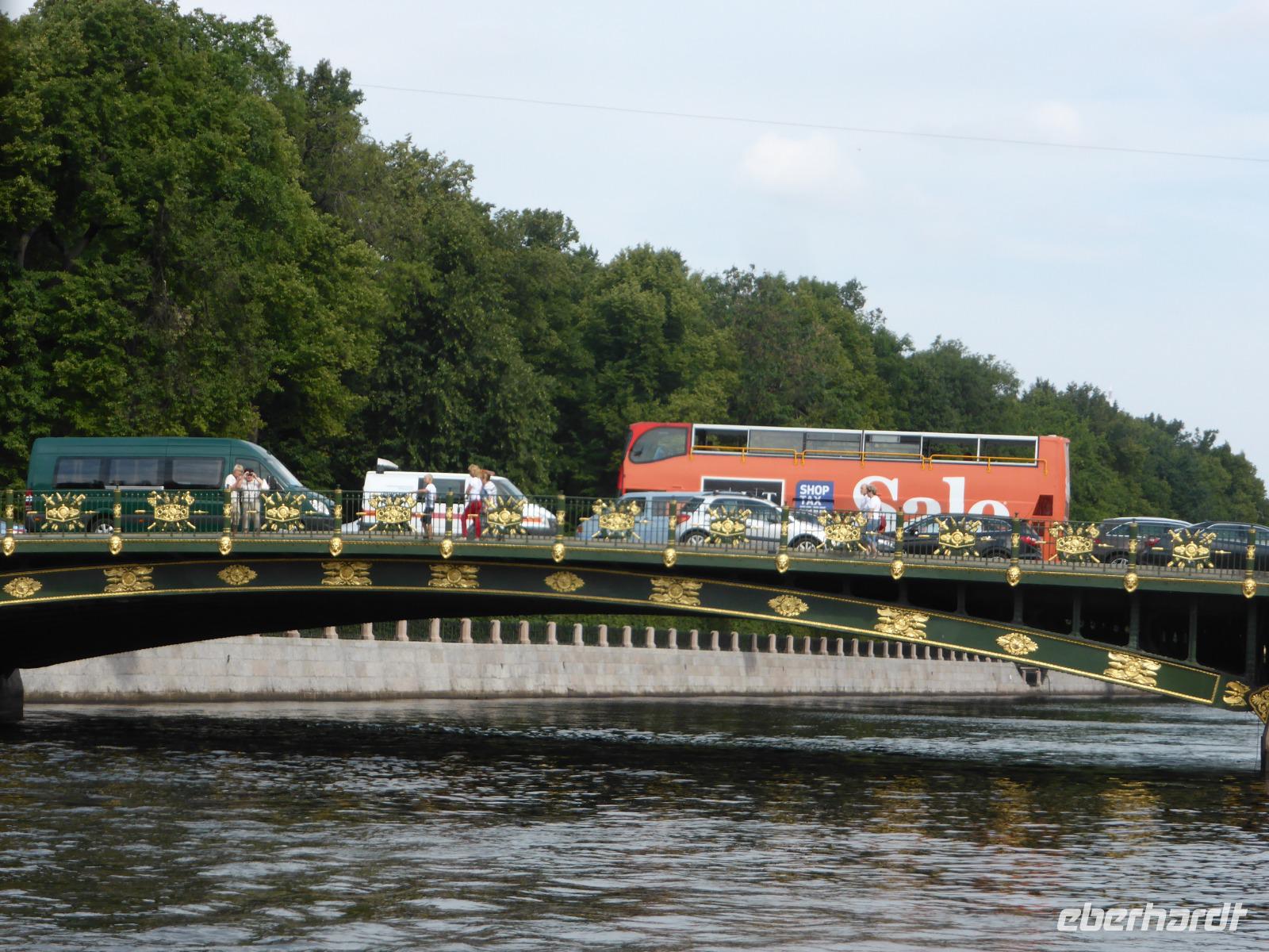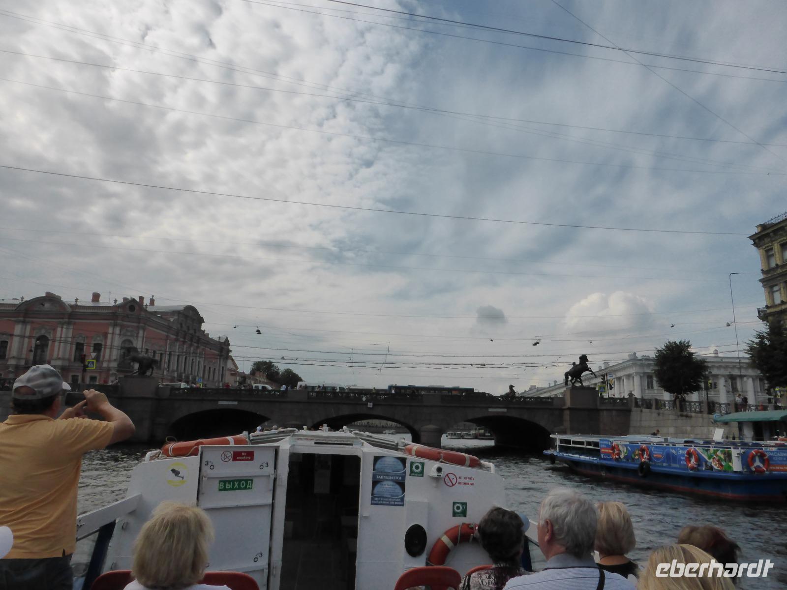 Am Vormittag heute sehen wir St. Petersburg bei einer Bootsfahrt vom Wasser aus. Das was wir gestern schon bei der Rundfahrt gesehen, erscheint heute aus anderer Perspektive. Wir sehen Fassaden aus dem 18. Und 19. Jahrhundert, fahren unter Brücken hindurch, wie Sängerbrücke, der Ismail-Brücke, der Lomonossow-Brücke und der Theaterbrücke, an der ehemaligen Markthalle vorbei, vorbei an kleinen Schlösschen des Adels, in denen heute vor allem Verwaltungen untergebracht sind, an Mietshäusern vobei, in denen noch immer Gemeinchaftswohnungen bewohnt werden, vorbei am ältesten Zirkus in einem festen Gebäude, am ehemaligen Schloss Scheremetjevow mit einem schönen schmiedeeisernen Zaun davor, heute darin ein Museum für Theaterkunst und ein Musikinstrumente-Museum, an einem klassizistischen Gebäude, in welchem heute die Bibliothek untergebracht ist, sehen von weitem die Drei-Faltigkeits-Kirche mit der blauen Kuppel, vorbei am Theaterplatz, er soll eine Metrostation erhalten und Fußgängerzone werden, wir sehen das alte, rot-grüne Marinski-Theater und das neue mit der modernen Theaterausstattung, das rote Backstein-Gebäude, in dem das Zentrale Kriegsmarine-Museum ist, sehen das Universitäts- und Hochschulgebiet mit den vielen Fakultäten und Bereichen, vorbei an einem roten Haus, in welchem Tschaikowski häufig eine Wohnung mietete, als er seinen Bruder besuchte hatte.