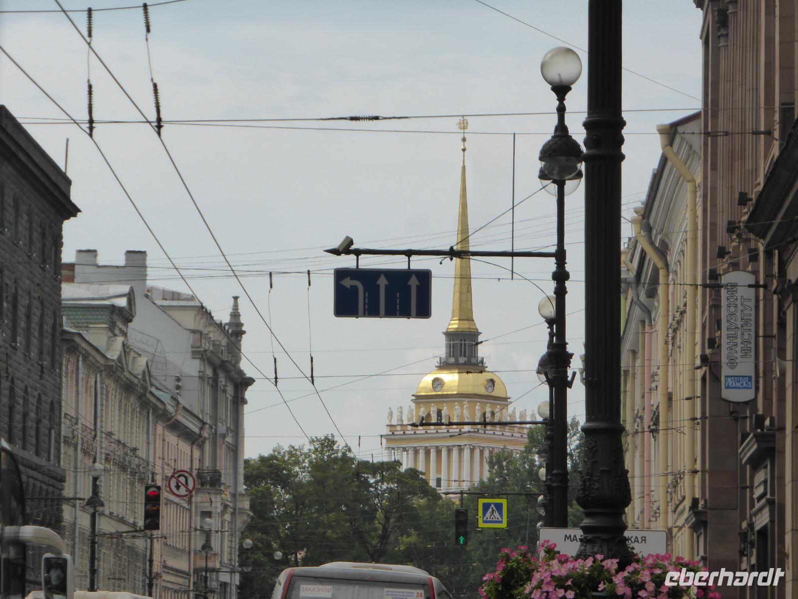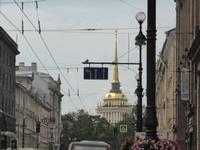 Wir sehen das Alexandrinky-Theater, die Russiche Ballett-Akademie Waganowa, den Anitschkow-Palast,eingezäunt mit einem Zaun verziert mit goldenen Doppeladlern, das Denkmal Katharina II. Im Garten nebenan, das Universitätsviertel, den Newsky-Prospekt, das riesengroße moderne Einkaufszentrum Gostiny Dvor, wo die Metro hält vier Stationen vom Hotel aus, den Platz der Künste, das Europa-Hotel, die Philharmonie, das Puschkin-Denkmal, weitere Theater, das Ethnographische Museum, das Russische Museum, das Singer-Haus auf der Bücherallee, die Kasaner Kathedrale, der Stroganov-Palast, das Lietratur-Cafe, die Admiralität mit der goldenen Spitze und der Segelfahne obenauf, die auf dem modernen Stadtwappen abgebildetist, den Isaaks-Platz mit der Isaaks-Kathedrale, das Hotel „Astoria", das Rathaus mit der Tricolore und der Fahne von St. Petersburg, die Reitschule, die Akademie der Künste, genannt Repin-Akademie , den Schloss-Platz mit Winter-Palais und Eremitage, die geschmückte Schloss-Brücke in Vorbereitung des Ehrentags der Marine.