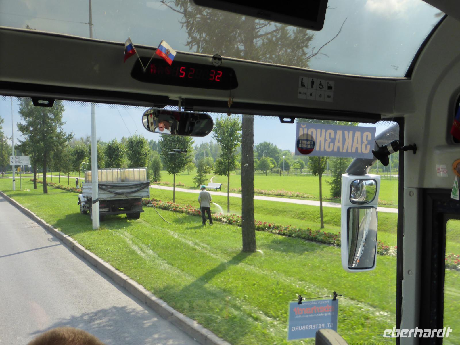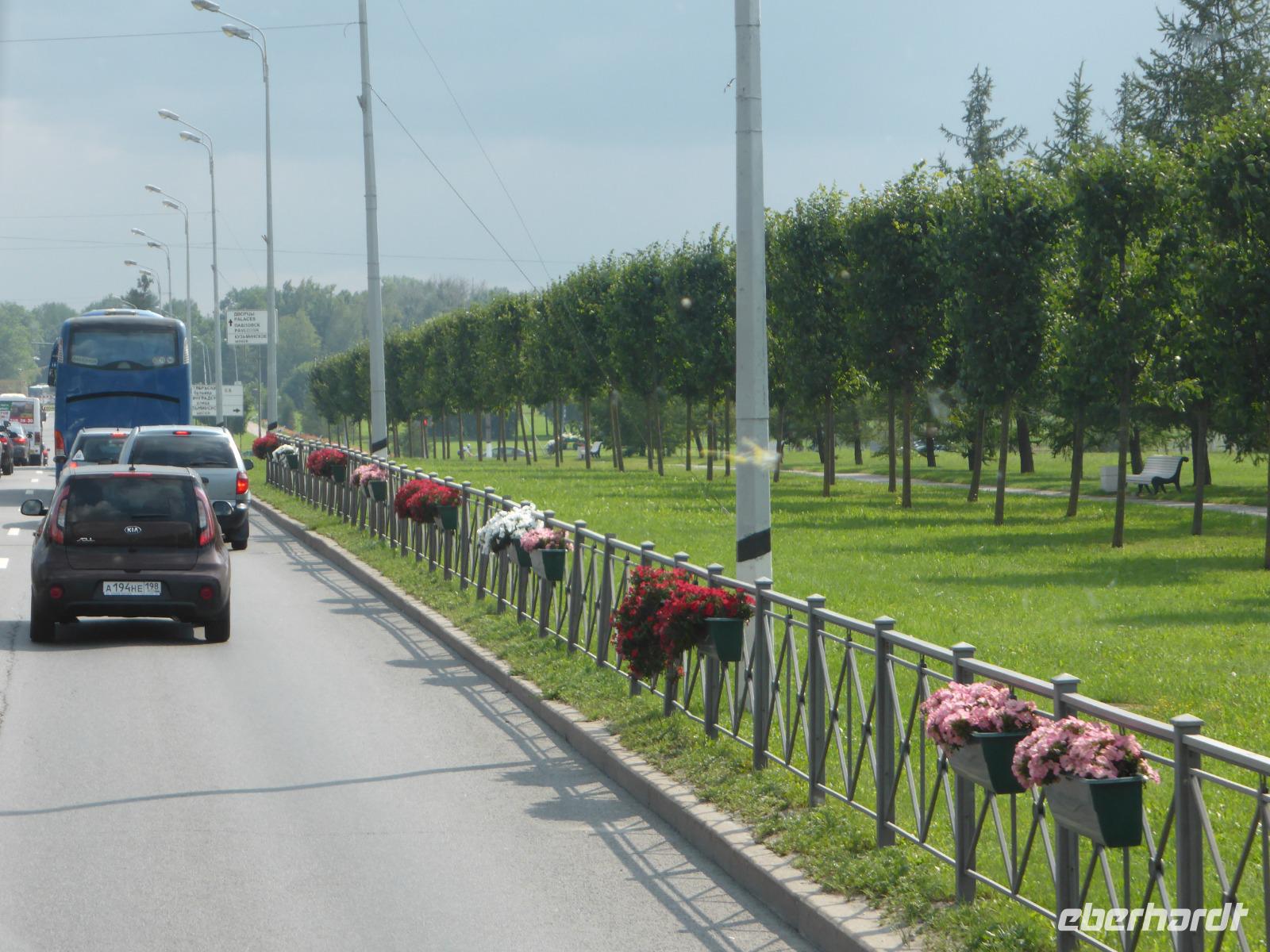 Auf einer der neuen Ringstraßen fahren wir in Richtung Peterhof , gelegen am Finnischen Meerbusen. Die örtliche Reiseführerein verkürzt uns die Fahrt dorthin mit viel Interessantem der Gegenwart. Sie erinnert an die Zarenzeiten, als man auf den Straßen mit Pferdekutschen unterwegs war. Sie redet über die Museen nach der Revoltion von 1917, über die Landwirtschaft, über Wohnungspolitik und Grundstückspreise, über das Einkommen der Bevölkerung, über die Förderung junger Familien und über Weiteres. Vorbei fahren wir an der neuen Siedlung Michailowka, vorbei an alten Siedlungen, an nur wenigen alten russichen Holzhäusern vorbei. Die Kirche Peter und Paul ist eingerüstet.