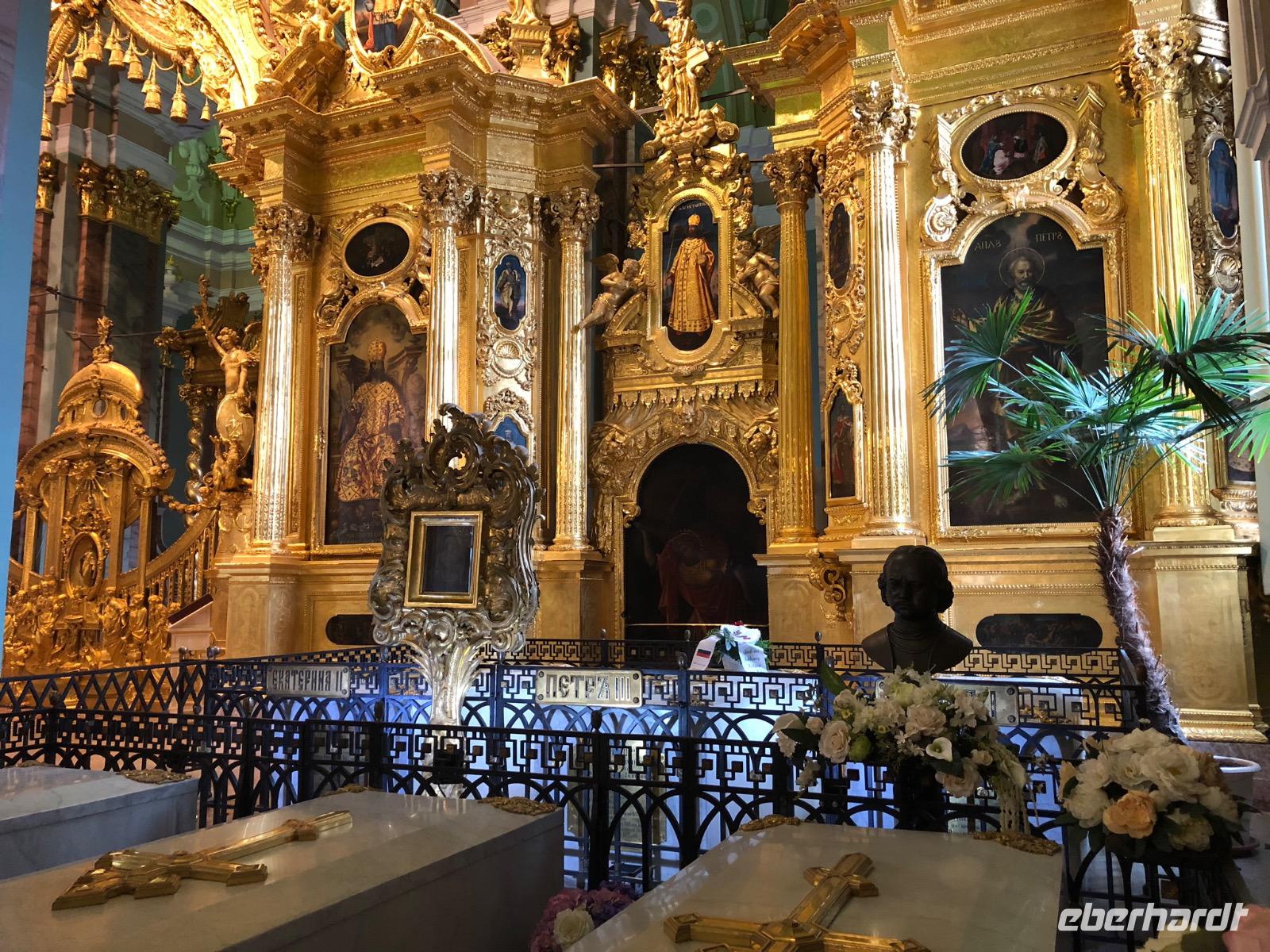 Ab 6.30 Uhr erwartet uns das Frühstücksbuffet. Gut gestärkt lassen wir uns von Anton ins Petersburger Zentrum fahren. Obwohl unser Hotel zentral liegt, befindet es sich, geschichtlich gesehen, außerhalb der (Alt-) Stadt. Sankt Petersburg liegt im Newa-Delta und umfasst im Zentrum 42 Inseln. Das bedeutet, dass es überall Wasser und Brücken gibt. Ein Grund, warum die Stadt auch VENEDIG DES NORDENS genannt wird. Ein anderer Grund könnte sein, dass von den 70% Ausländern, die die Stadt erbauten, 50% Italiener waren. Peter der Große, der erste Zar, der Europa bereiste, wollte sein Land dem Mittelalter entreißen. Nach einem elendigen Krieg mit Schweden hatte er die Vision einer blühenden Hauptstadt mit modernen Straßen, Häusern aus Stein und Akademien. Sowohl die Herrscherfamilie als auch die Regierung mussten, ob sie wollten oder nicht (die meisten wollten nicht) in das Sumpfgebiet ziehen, weil es der Zar so wollte und der hatte schließlich das Sagen. Sankt Petersburg hat etwa die gleiche geografische Lage wie die Südspitze von Grönland, was bedeutet, dass es im Winter bis zu minus 30 Grad kalt wurde und die Sommer eher grau und regnerisch blieben. Doch auch vor Sankt Petersburg hat die Klimaerwärmung nicht Halt gemacht, so kalt wird es schon lange nicht mehr und wir erwarten heute und in den nächsten Tagen Sonne und bis zu 27 Grad. Wir fahren weiter bis zum Newski Prospekt und legen einen ersten Fotostopp mit Blick auf die Erlöserkathedrale ein. Weiter geht es vorbei an der Kasaner Kathedrale, dem Stroganov Palais und vielen Palästen und Museen. Irina berichtet uns von Puschkin und zeigt uns das Café, in dem er sich mit seinem Duellpartner traf. Die nächste Geschichte rankt sich um Tschaikowski, der möglicherweise in einem Petersburger Restaurant unabgekochtes Wasser trank und sich mit Cholera infizierte. Einen weiteren Fotostopp legen wir an der Isaak-Kathedrale ein, vor der sich ein Denkmal für Nikolaus I. befindet. Allerdings ist dieses zurzeit komplett eingerüstet, es wird restauriert. Am Theaterplatz vorbei erreichen wir bald die Marina Kathedrale, die einzige Kathedrale, die nicht einmal während der Sowjetzeit geschlossen wurde. Wir könnten sie uns von Innen ansehen, aber derzeit findet ein Gottesdienst statt und da sind Touristen nicht erwünscht. Das verstehen wir. Wir fahren weiter bis nach Strelka. Hier war früher das Handelszentrum von Sankt Petersburg, heute ist es eine Stätte der Gelehrsamkeit. Die Akademie der Wissenschaften befindet sich hier, die Universität, Museen, Institute und Bibliotheken. Maritim präsentieren sich das Marinemuseum und die beiden Rostrasäulen. Diese dienten früher als Leuchttürme, die mit Öllampen den Schiffen den Weg in den Hafen wiesen. Die Öllampen gibt es nicht mehr, sie wurden gegen Gasfackeln ausgetauscht, die wiederum bei Festen immer noch angezündet werden. Geschmückt sind die Säulen in römischer Art. Nach erfolgreichen Seeschlachten schmückten diese ihre Schiffe mit dem Bug der besiegten Gegner. Für uns steht jetzt der Besuch der Peter-Pauls-Festung mit der Peter-Pauls-Kathedrale an. Mit der Gründung der Festung begann auch die Geschichte der Stadt. Um alles sehen zu können, müssten wir allerdings einen ganzen Tag einplanen, so viel gibt es hier zu besichtigen. Es gibt einige Museen und auch das Gefängnis, in dem viele Menschen schmachteten, kann besucht werden. Peter der Große hatte hier unter anderem seinen eigenen Sohn eingesperrt, der sich gegen ihn aufgelehnt hatte. Doch schon der Bau der Festung hatte viele Leben gekostet. Hunderte Zwangsarbeiter ließen hier ihr Leben. In der Kathedrale befinden sich die Gräber der Zaren und Zarinnen der vergangenen Jahrhunderte. Auch die Familie von Nikolaus II., die von den Bolschewiki ermordet wurde, hat seit einigen Jahren hier ihre letzte Ruhe gefunden. Auf der Reise mit der Transsibirischen Eisenbahn legen unsere Gruppen einen Stopp in Jekaterinburg ein. Hier wurde Nikolaus II. von den Bolschewiki festgesetzt und später in einem Keller erschossen. Mit ihm starben seine Frau und seine zum Teil noch minderjährigen Kinder. Die Toten wurden verscharrt und es wurde versucht, sie unkenntlich zu machen. Die gesamte Zarenfamilie sollte für immer ausgelöscht sein. Jedoch gelang es bereits zu Sowjetzeiten einem Geologen und einem Filmemacher, die das Schicksal von Nikolaus II. erforschten, die Gebeine zu finden. Aus Angst, dass die vorhandenen Überreste ebenfalls vernichtet würden, veröffentlichten die Beiden die Ergebnisse ihrer Nachforschung nicht. Erst nach Auflösung der Sowjetunion, wurde der Fall aufgeklärt. DNA Analysen bewiesen die Echtheit der Funde. Und hier in Sankt Petersburg schließt sich nun der Kreis. Achtzig Jahre nach ihrer Ermordung wurden die sterblichen Überreste in der Peter-Pauls-Kathedrale beigesetzt.